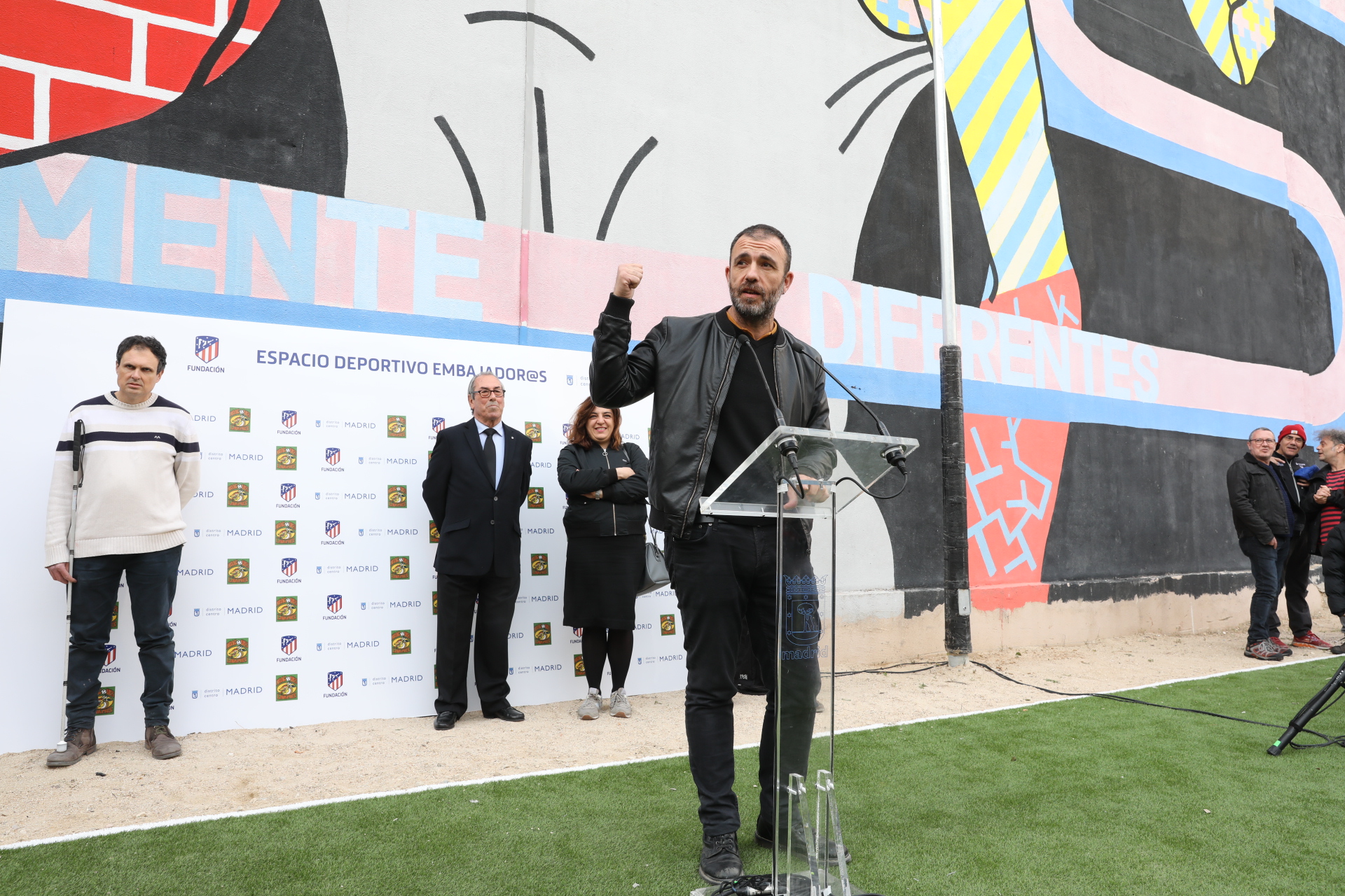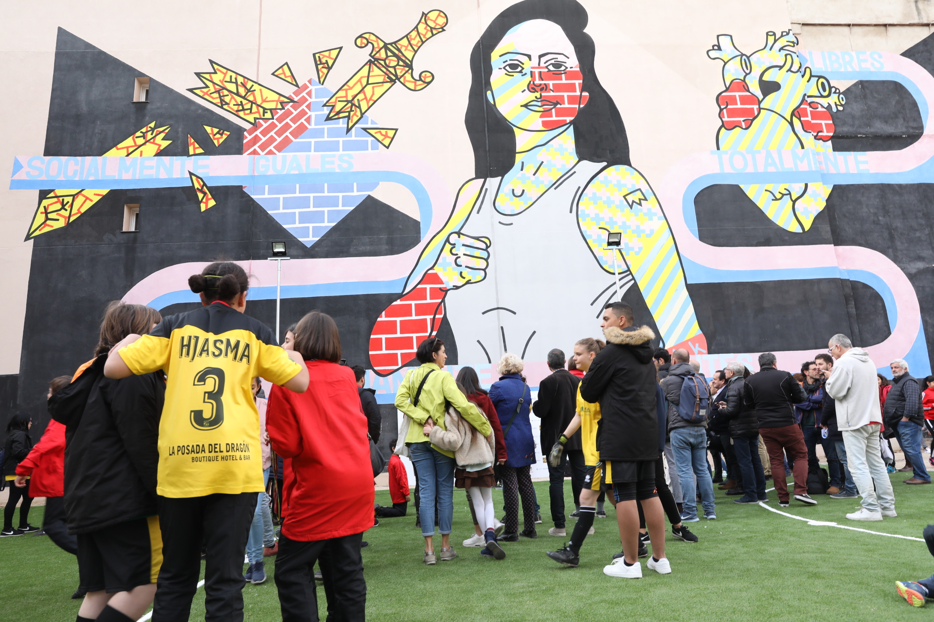 - El espacio deportivo situado en Embajadores 18 estrena césped artificial y un nuevo mural del artista y vecino del barrio El Rey de la Ruina con el lema ‘Mujeres cambiando las reglas del juego’
