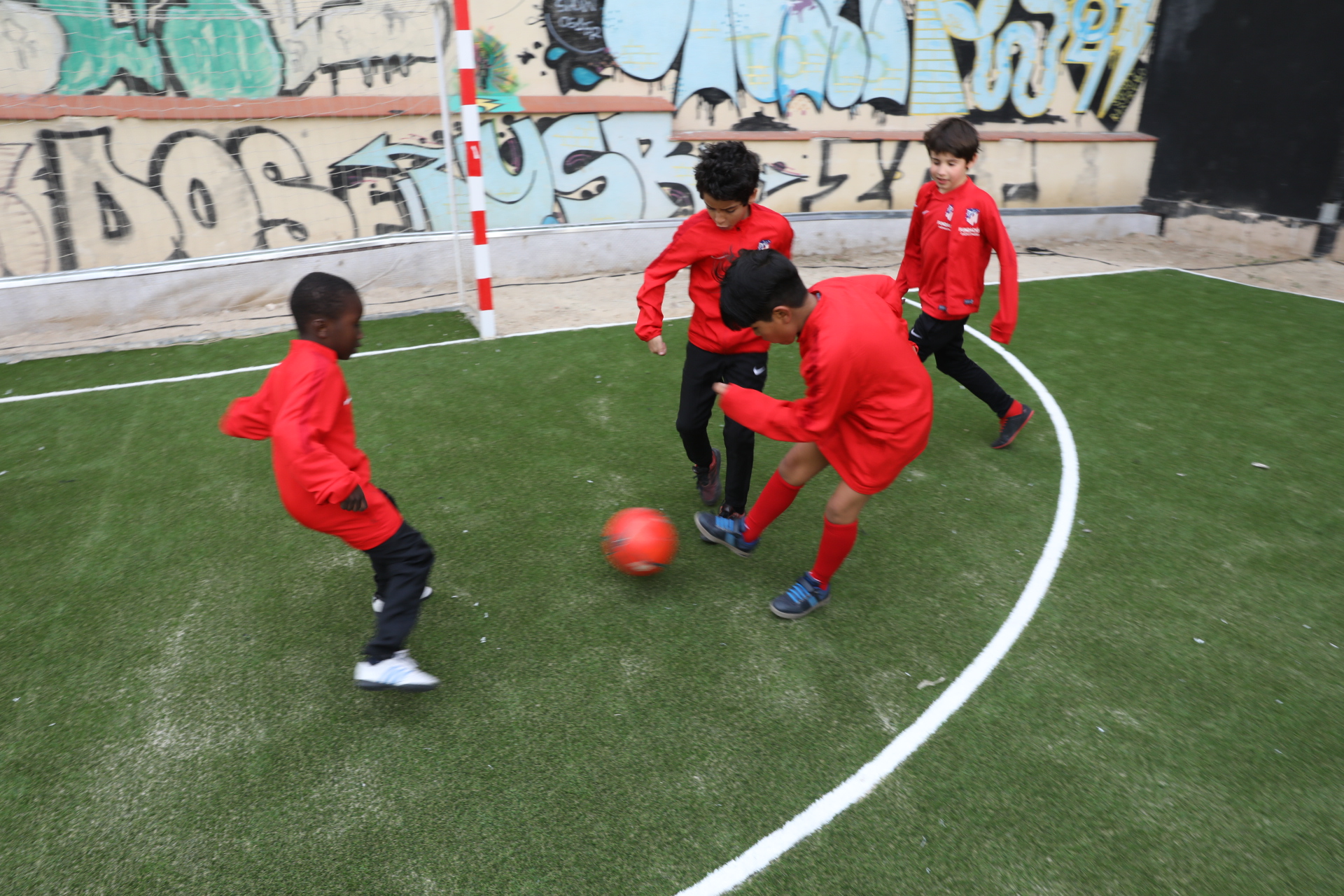 Pero sin duda la novedad que más entusiasmo ha despertado entre los participantes es la de contar con un campo de césped artificial para sus entrenamientos en el Espacio Deportivo Embajadoras. Durante las últimas dos semanas la Fundación del Atlético de Madrid ha realizado los trabajos necesarios para deshacerse de la tierra que ocupaba el terreno de juego e instalar cerca de 300 m2 del nuevo material.