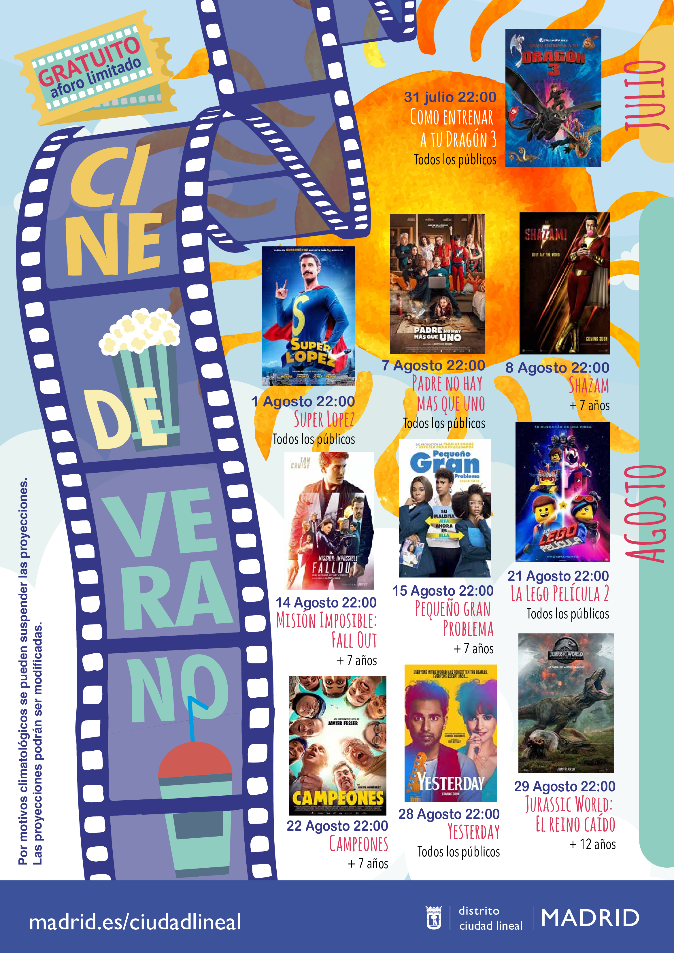 Durante los cinco fines de semana del mes de agosto, el vecindario del distrito podrá disfrutar de comedias como ‘Súper López’, ‘Pequeño gran problema’, ‘Padre no hay más que uno’ o ‘Campeones’, títulos de acción como ‘Misión imposible: fall out’, el musical ‘Yesterday’, ‘Shazan’ o ‘Jurassic World: el reino caído’ del género fantástico y para peques, ‘Cómo entrenar a tu dragón 3’ y ‘La Lego película 2’. En definitiva, serán diez títulos para públicos diversos que se proyectarán al aire libre y que recuperan la oferta cultural en el distrito de Ciudad Lineal.