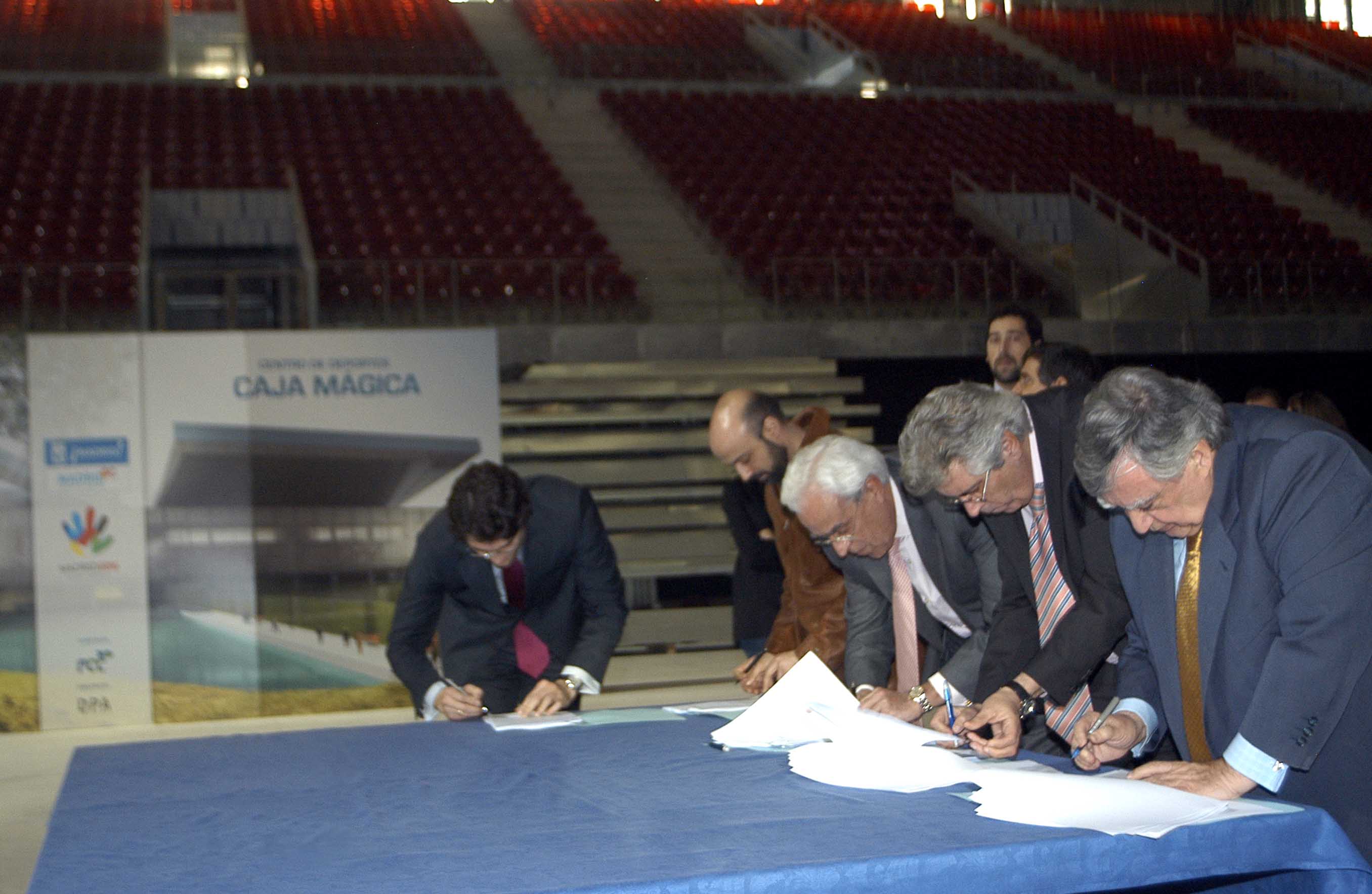En el acto de firma, celebrado en la pista central del edificio Caja Mágica, han participado, además de Madrid Espacios y Congresos, directivos de la empresa constructora, Fomento de Construcciones y Contratas; de la dirección facultativa, Dominique Perrault Architecture; de la asistencia técnica, LKS y de la asistencia técnica de control de calidad, el Instituto Técnico de Materiales y Construcciones.