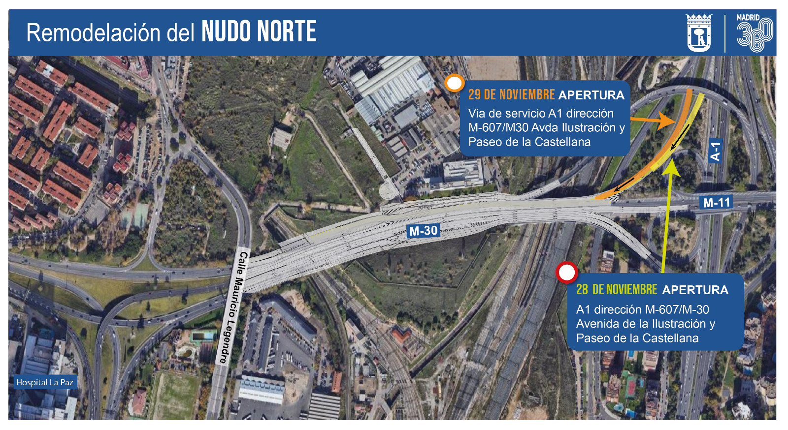 El próximo martes, 29 de noviembre, quedará restituido en su totalidad el acceso al Nudo Norte desde la A-1, carretera de Burgos. La apertura se realizará durante dos noches. En la primera de ellas, del domingo 27 al lunes 28, se habilitará el acceso al nudo desde el tronco principal de la A-1, mientras que la noche del lunes 28 al martes 29, se habilitará el acceso al nudo desde la vía de servicio de la A-1.