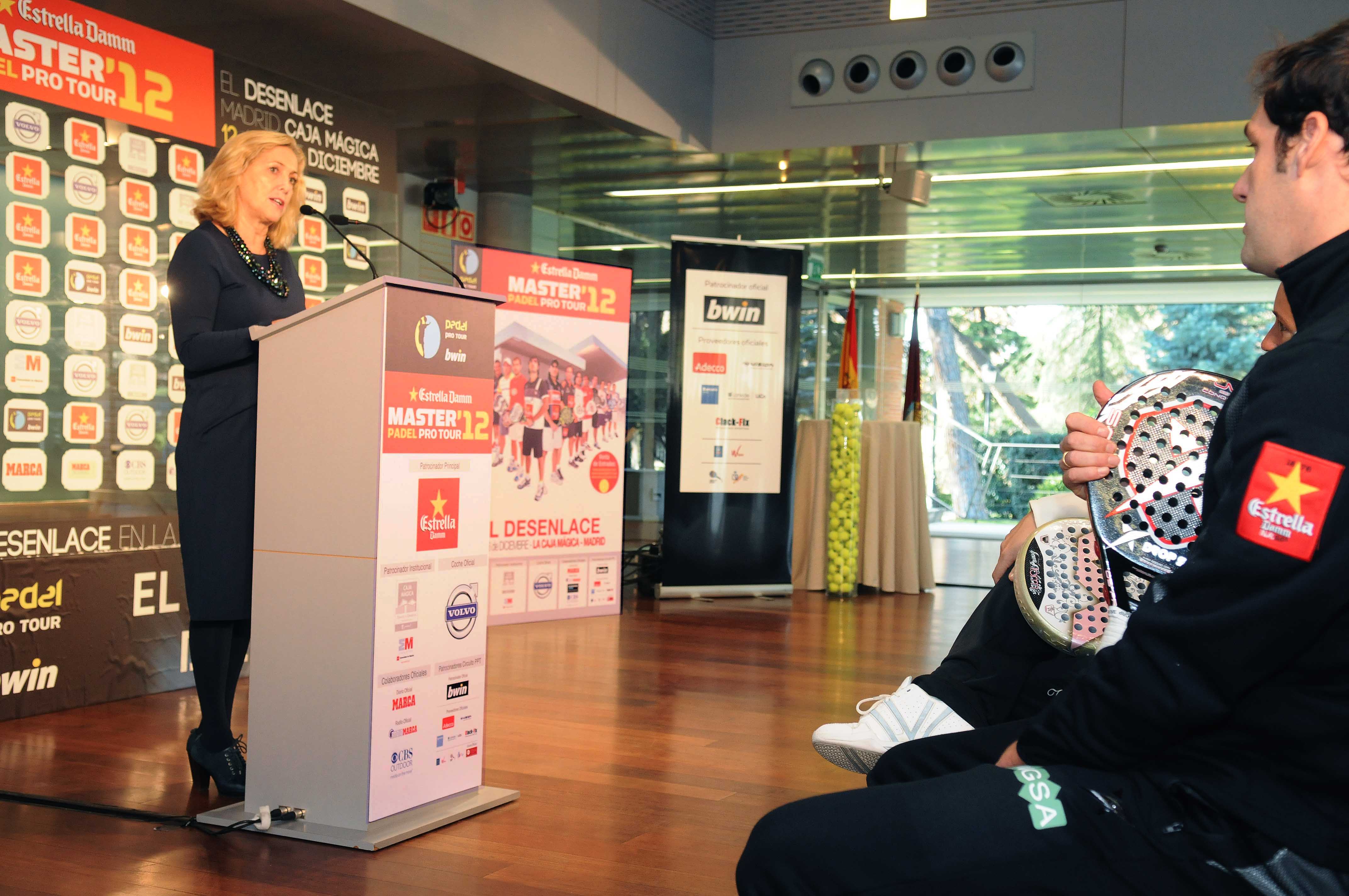 La delegada de Hacienda y Administración Pública, Concepción Dancausa, ha presentado hoy el Master Pádel Pro Tour 2012, la prueba que cierra la temporada del circuito de pádel profesional más importante del mundo y que este año se celebra del 12 al 16 de este mes de diciembre. En al presentación han participado Manuel Hernández, presidente del torneo; los deportistas Carolina Navarro y Juan Martín, números uno del mundo en categoría femenina y masculina, y diversos patrocinadores de la prueba.