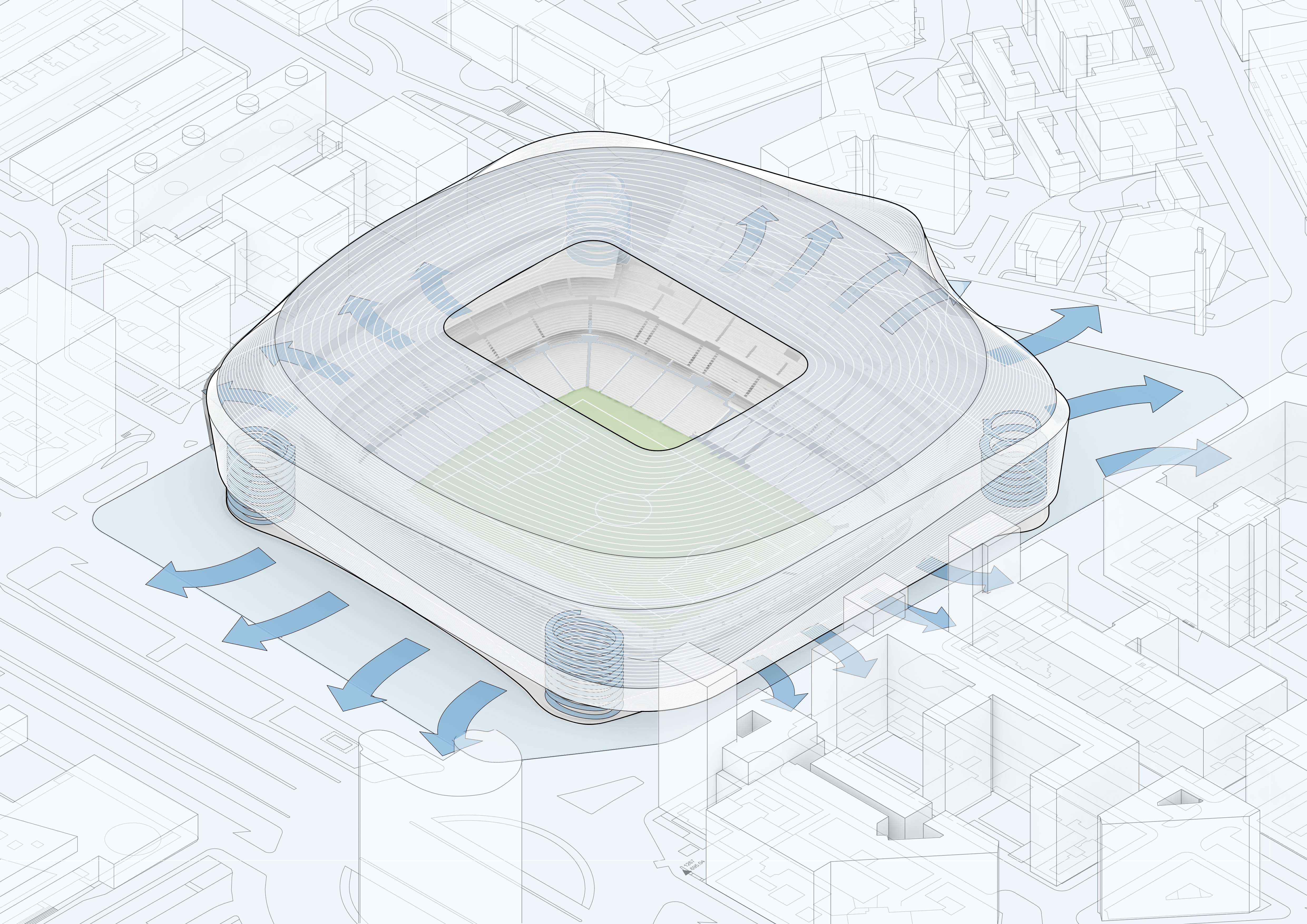 • La nueva imagen del estadio será la de un volumen luminoso, envuelto en una piel diseñada a base de bandas de acero y líneas vanguardistas, que incluirá la cubierta retráctil del terreno de juego y que reforzará al conjunto como imagen icónica de Madrid