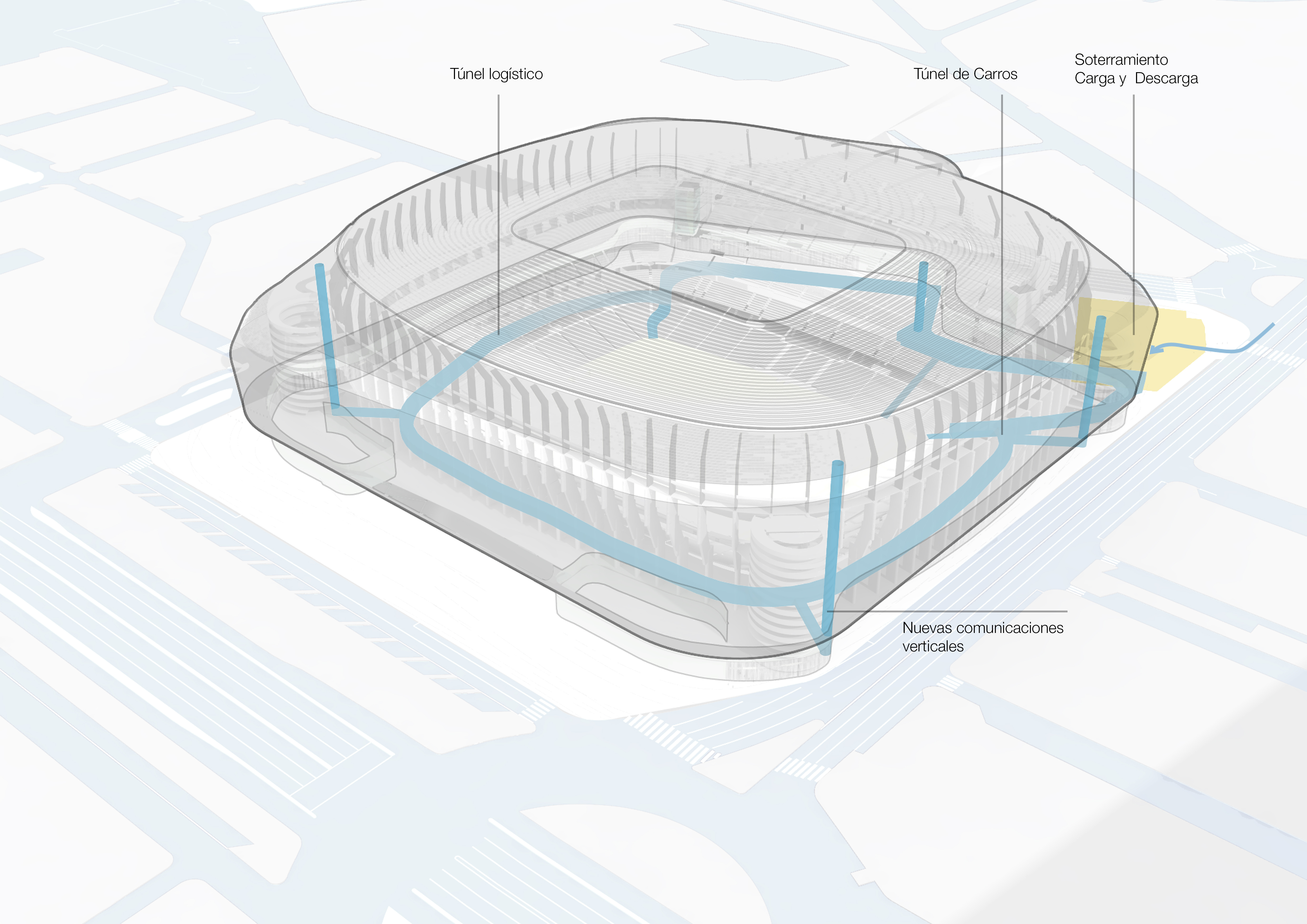 También disminuirá el ruido y las molestias a los vecinos, el acondicionamiento de zona de carga y descarga, que se realizará en el interior del lateral este del estadio, para su posterior traslado a través de un anillo distribuidor en el nivel -2. Además, la reubicación dentro del estadio de estas operaciones, liberará el espacio urbano actualmente ocupado y las molestias al tráfico.