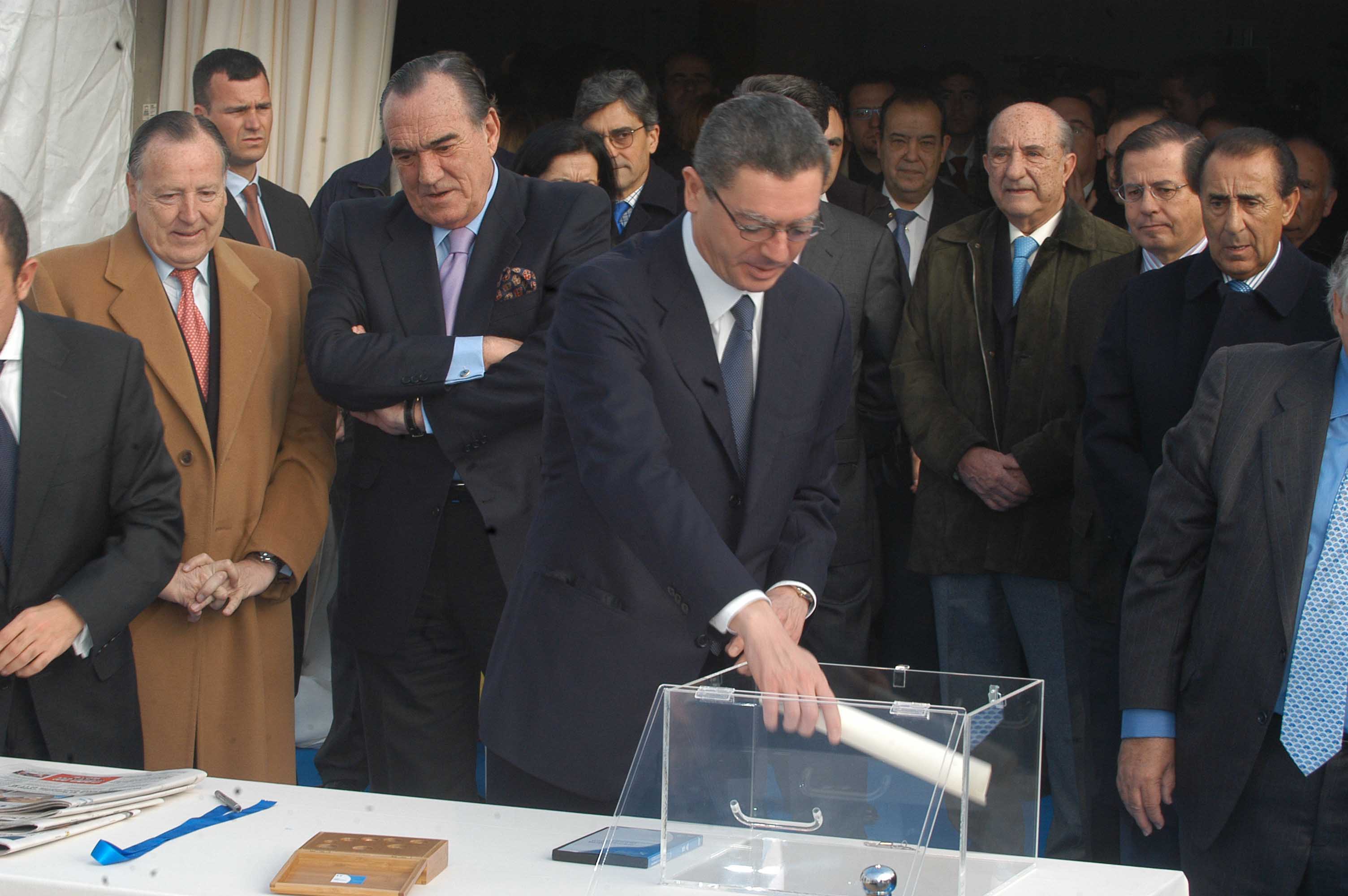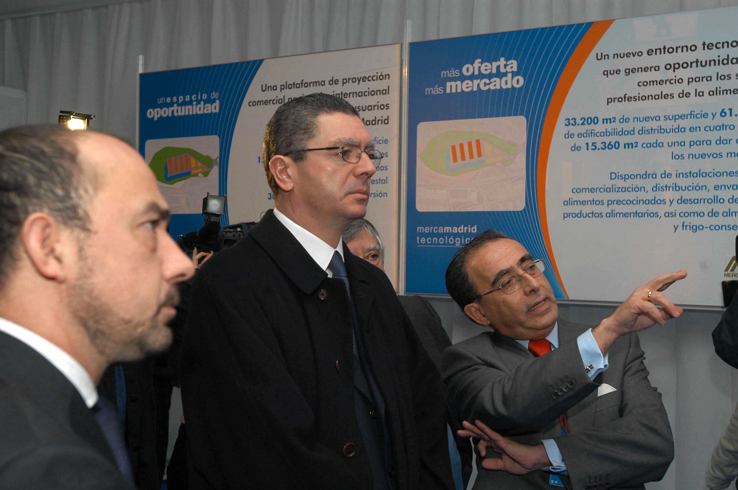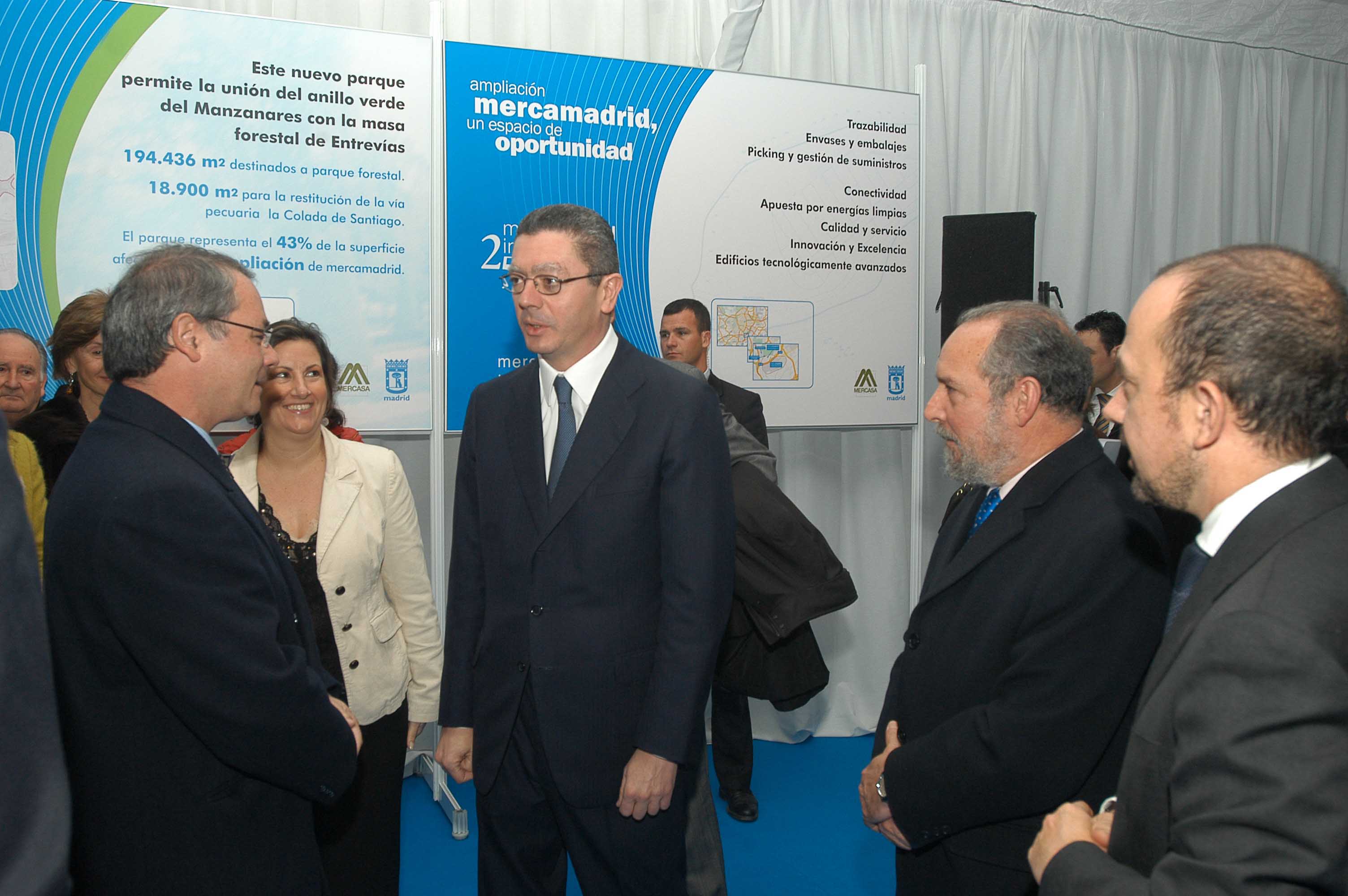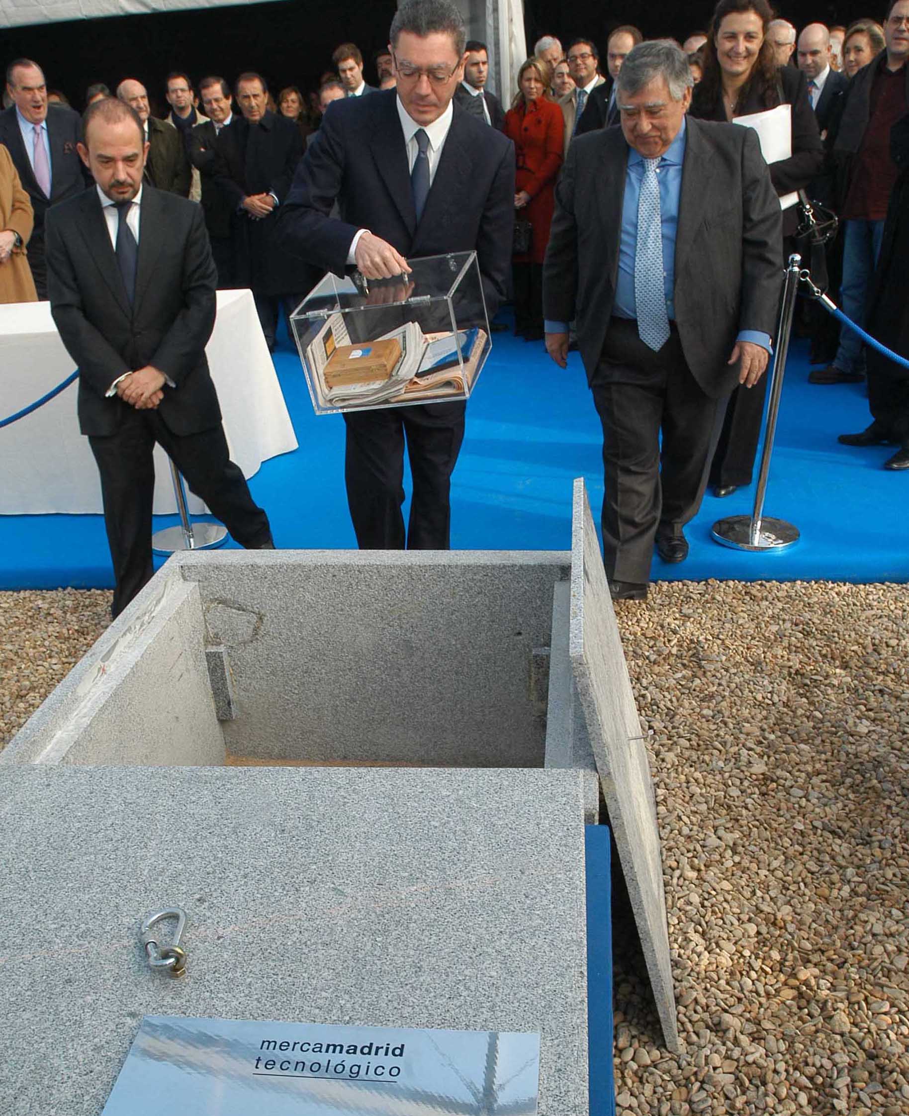 En las imágenes el alcalde de la Ciudad de Madrid, Alberto Ruiz-Gallardón, pone la primera piedra del nuevo complejo Mercamadrid Tecnológico, que va a permitir afianzar el liderazgo de la ciudad en la distribución comercial. El mercado se amplía en 453.000 metros cuadrados e incorporará nuevos sectores como el de las aves, lácteos, aceites o flores.