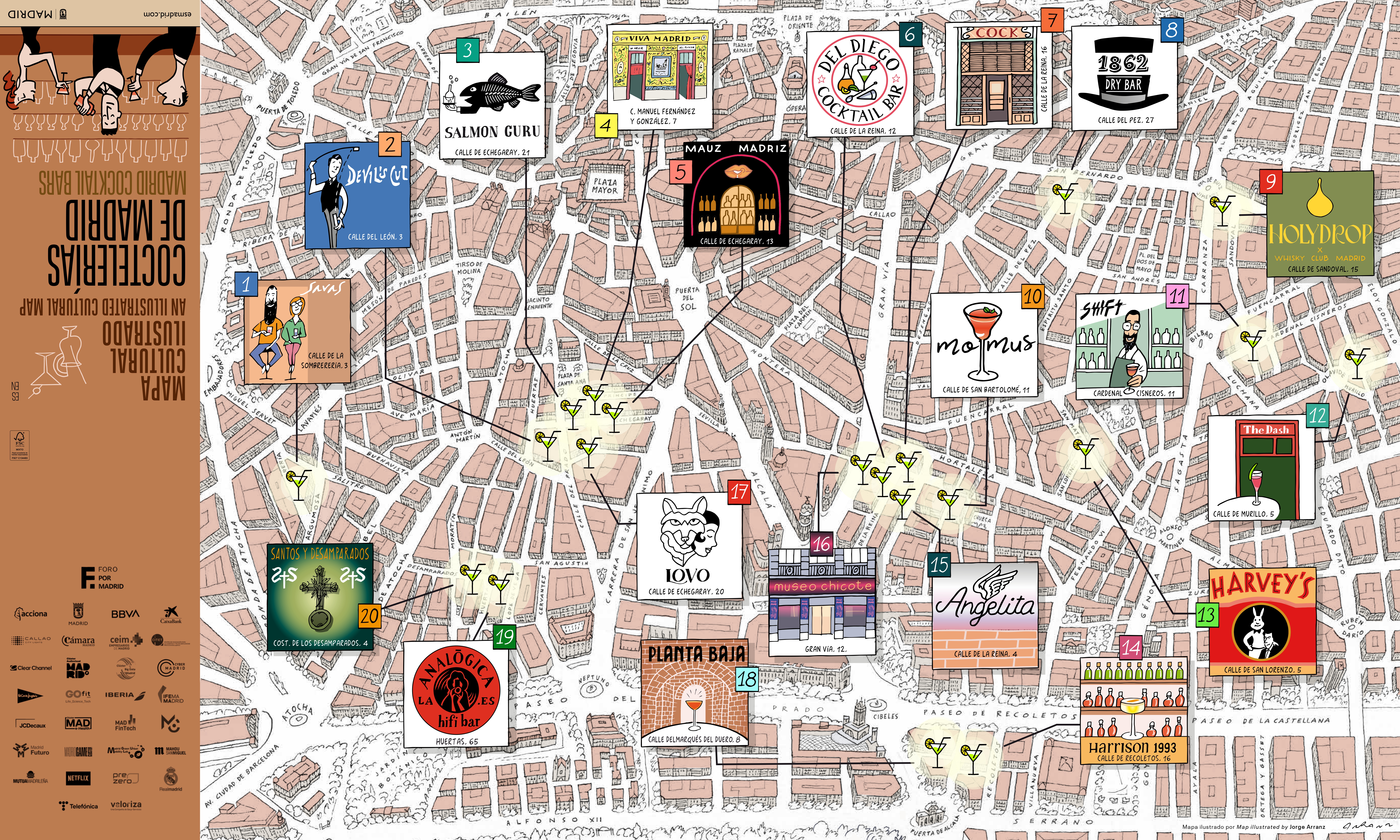 Este proyecto cuenta con el apoyo del Foro por Madrid, a través de la Oficina de Proyectos Estratégicos y Participación Empresarial del Área de Economía, Innovación y Hacienda. La selección de locales la ha realizado el barman Diego Cabrera y los textos que describen cada establecimiento llevan la firma de Miguel Ángel Palomo, periodista especializado en gastronomía. Las ilustraciones son obra de Jorge Arranz.
