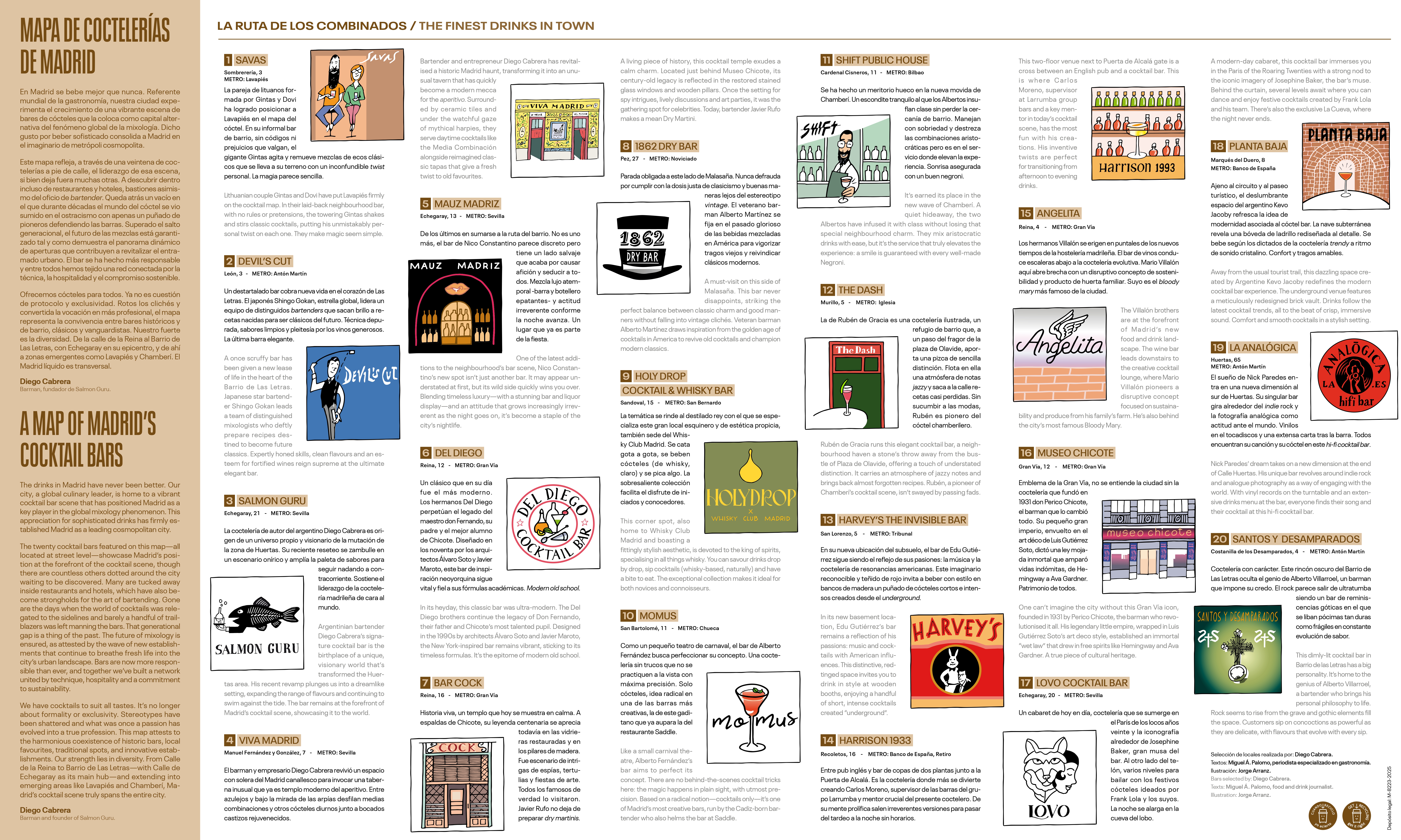 El argentino Diego Cabrera, al frente de Salmon Guru, es uno de los exponentes del auge de la alta coctelería en Madrid. Su establecimiento es la propuesta que recoge la tercera parada del mapa, en la calle de Echegaray, 21. Cabrera es también el responsable de haber revivido un espacio con solera de la ciudad convirtiéndolo en un templo moderno del aperitivo: se trata de Viva Madrid, la cuarta parada. Sin abandonar la zona, la quinta coctelería que propone el mapa es una de las últimas en sumarse a la ruta: Mauz Madrid, el local de Nico Constantino, que mezcla lujo atemporal con cierta actitud irreverente.