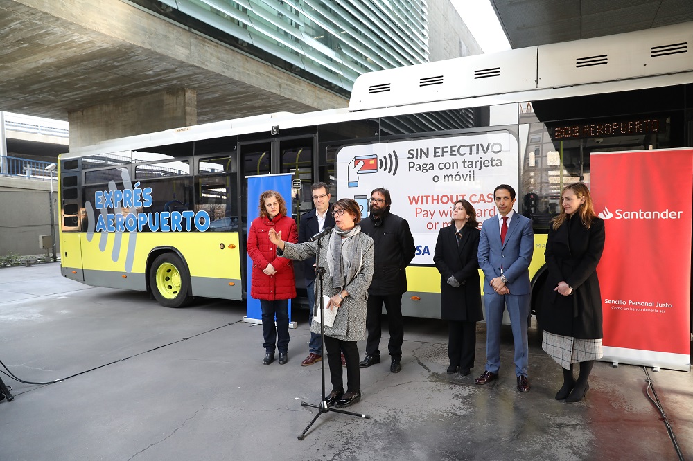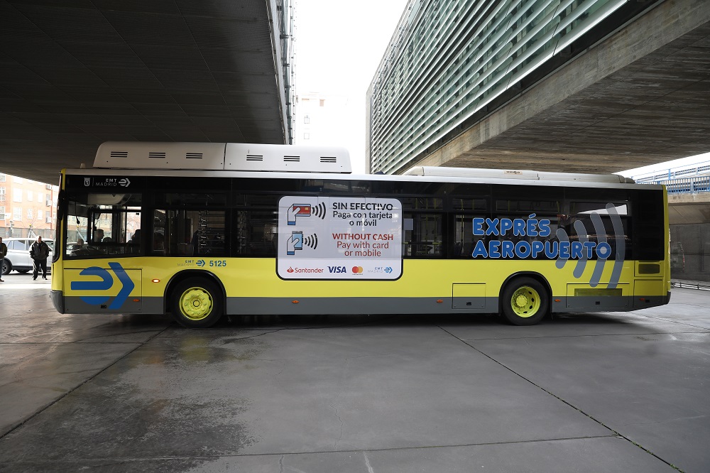 - El sistema se habilitará en tres fases: la primera, que arranca hoy, en la línea Exprés Aeropuerto; la segunda (abril-junio 2019), en toda la flota de EMT; y una tercera (finales 2019-principios 2020)