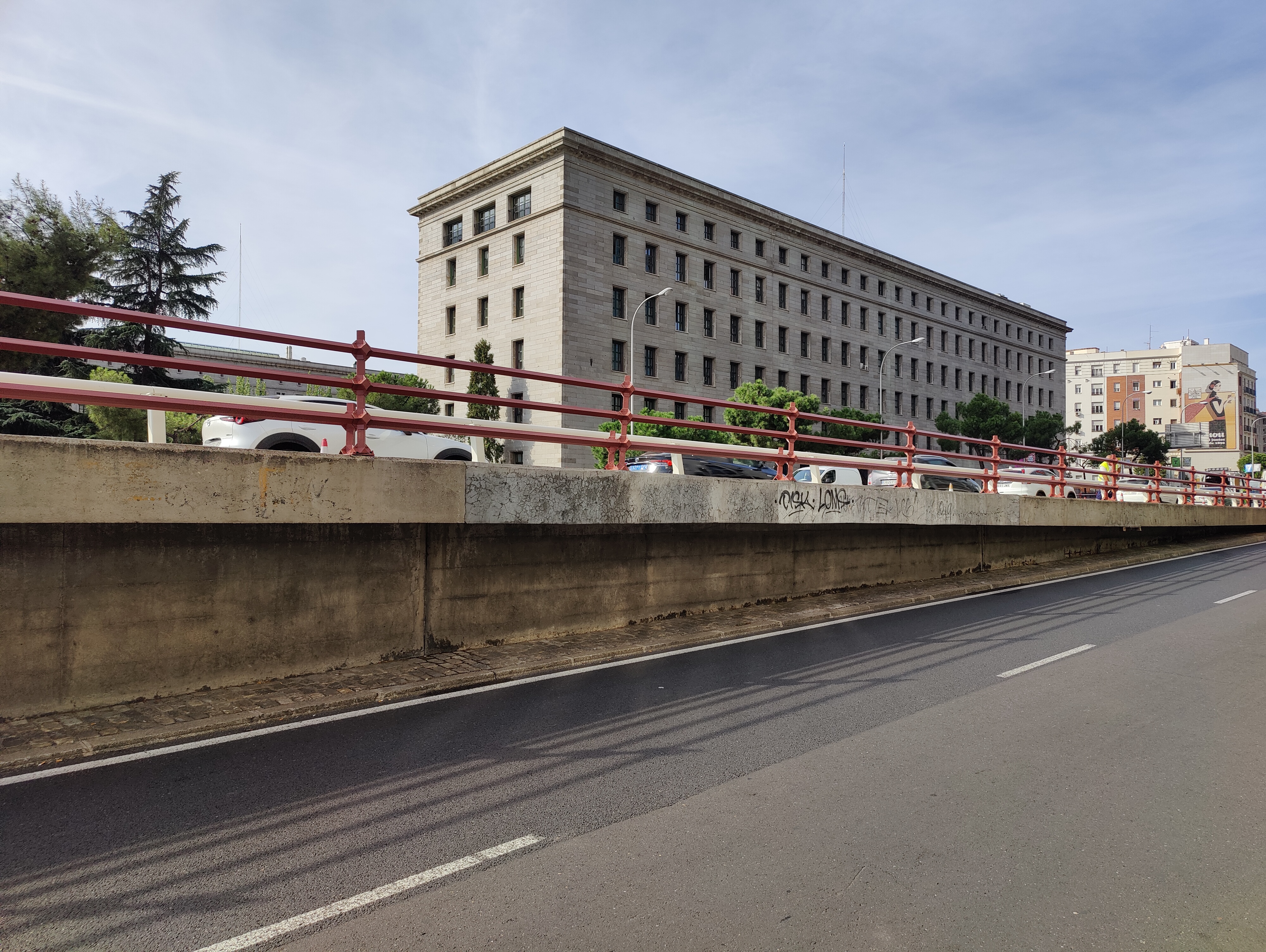 A la vez, se ha procedido al acondicionamiento de la parte superior del tablero del puente, que se encontraba deteriorado y envejecido por el paso del tiempo. En este caso, la intervención ha contemplado la renovación de la mediana, con demolición de la antigua y ejecución de una nueva, mejorando los puntos de recogida de agua del sistema de drenaje; restauración de las barandillas existentes en muretes de acceso y bordes laterales de tablero; ejecución de nuevas juntas de dilatación en el tablero; sustitución de la actual barrera metálica por un nuevo sistema de contención de vehículos más estético y ajustado al entorno urbano y a los requisitos la Unión Europea y renovación del pavimento de calzada existente con fresado y extensión de nueva capa de rodadura de asfalto y señalización horizontal.