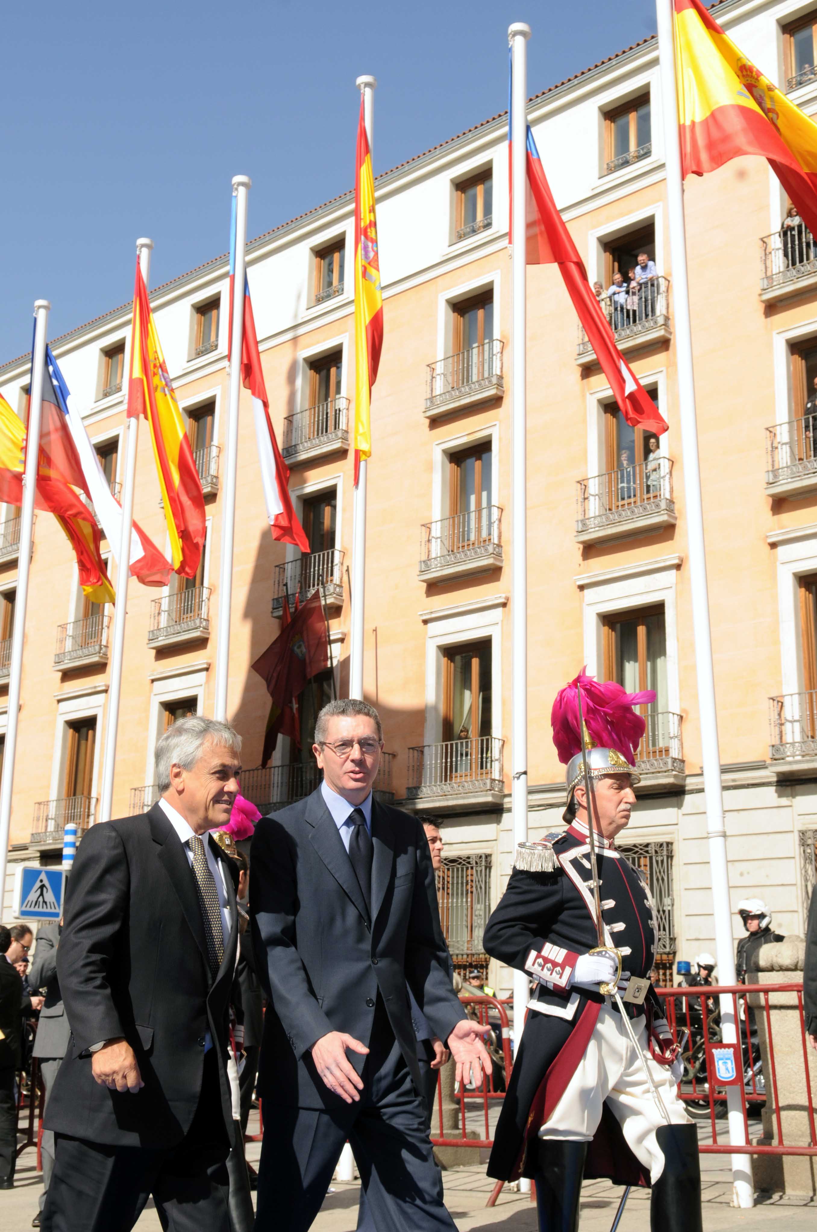 El presidente de Chile, Sebastián Piñera, de visita oficial en España, recibió esta mañana de manos del alcalde de Madrid, Alberto Ruiz-Gallardón, las Llaves de Oro de la Ciudad. Piñera fué recibido en la Plaza de la Villa donde el presidente chileno firmó en el Libro de Honor del Consistorio. Mañana martes, Sebastián Piñera inaugurará una placa del Plan Memoria de Madrid en recuerdo de su compatriota Carlos Morla Lynch, encargado de Negocios de la Embajada chilena durante la República y la Guerra Civil española y que salvó con su mediación a muchos españoles de uno y otro bando. En las imágenes, varios momentos de su visita al Ayuntamiento madrileño.