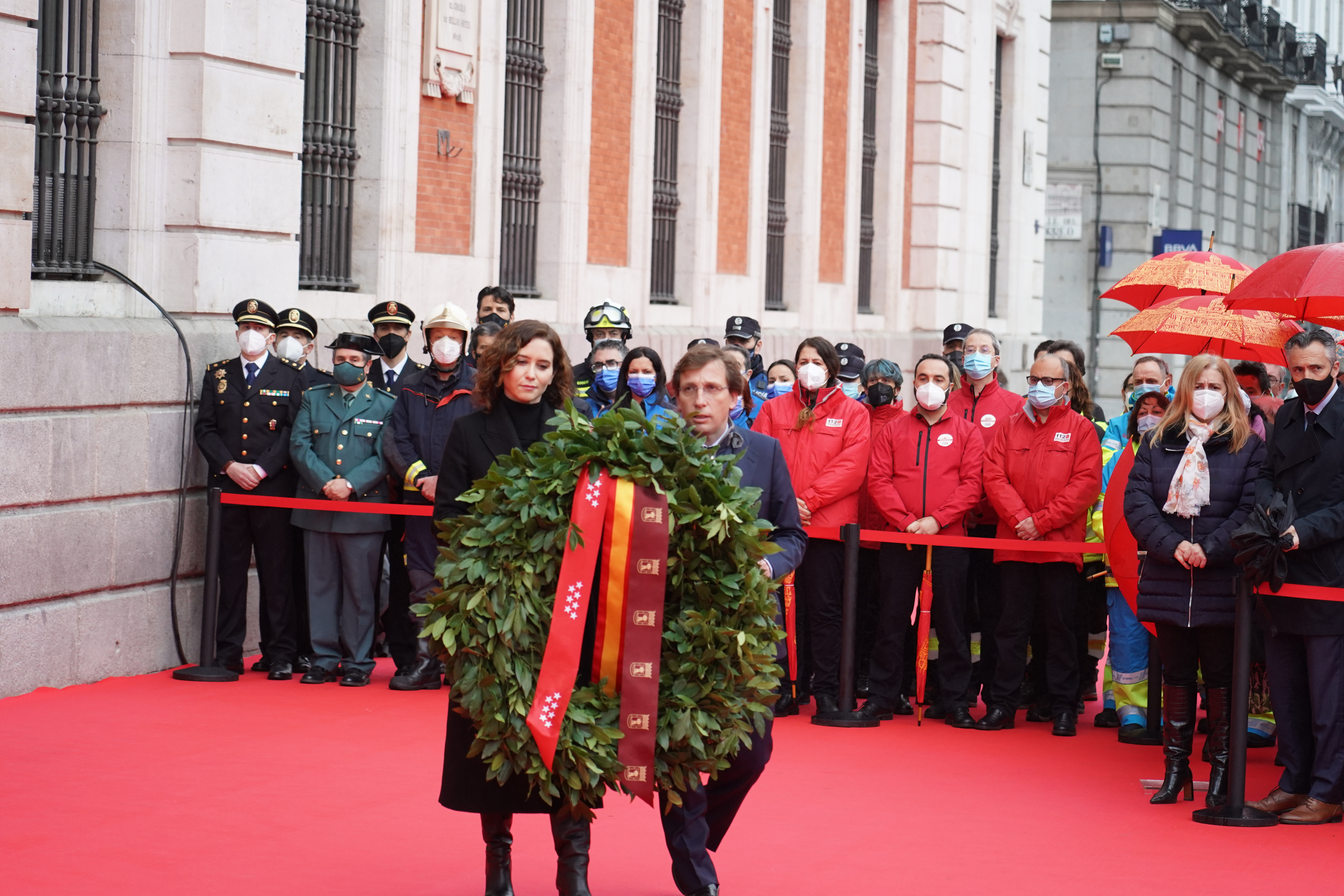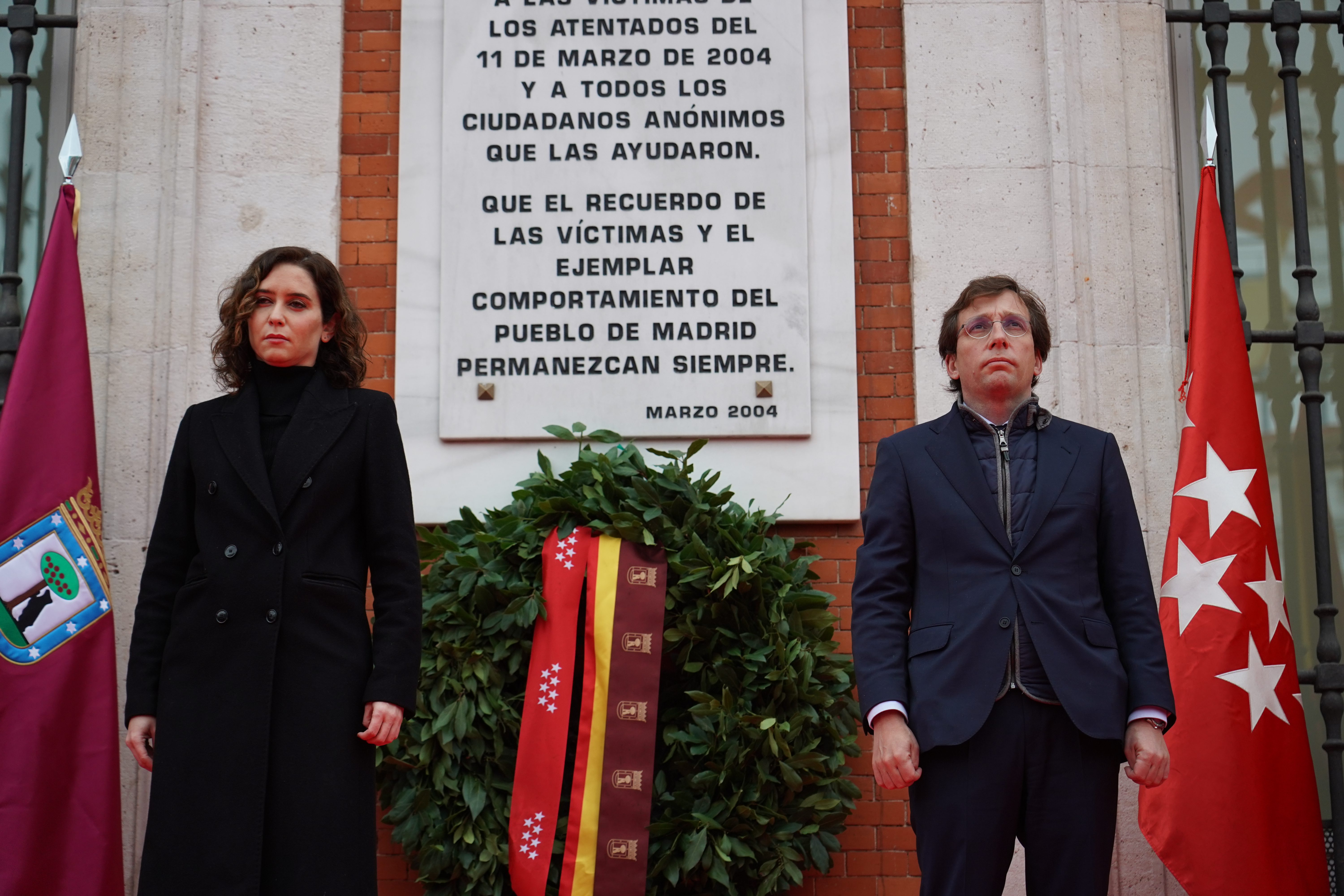 El alcalde de Madrid, José Luis Martínez-Almeida, junto a la presidenta regional, Isabel Díaz Ayuso, ha participado hoy en el acto de homenaje organizado por la Comunidad de Madrid para recordar a las 193 víctimas de los atentados terroristas que tuvieron lugar en Madrid el 11 de marzo de 2004. Mientras doblaban las campanas del Reloj de la Real Casa de Correos y las de iglesias cercanas a la Puerta del Sol, Almeida y Ayuso han depositado una corona de laurel junto a la placa que recuerda a los fallecidos. A continuación, la Orquesta y Coro de la Comunidad de Madrid, bajo la dirección de Krastin Nastev, ha interpretado las piezas Lacrimosa, del Réquiem de Mozart, y El cant dels ocells, de Pau Casals.