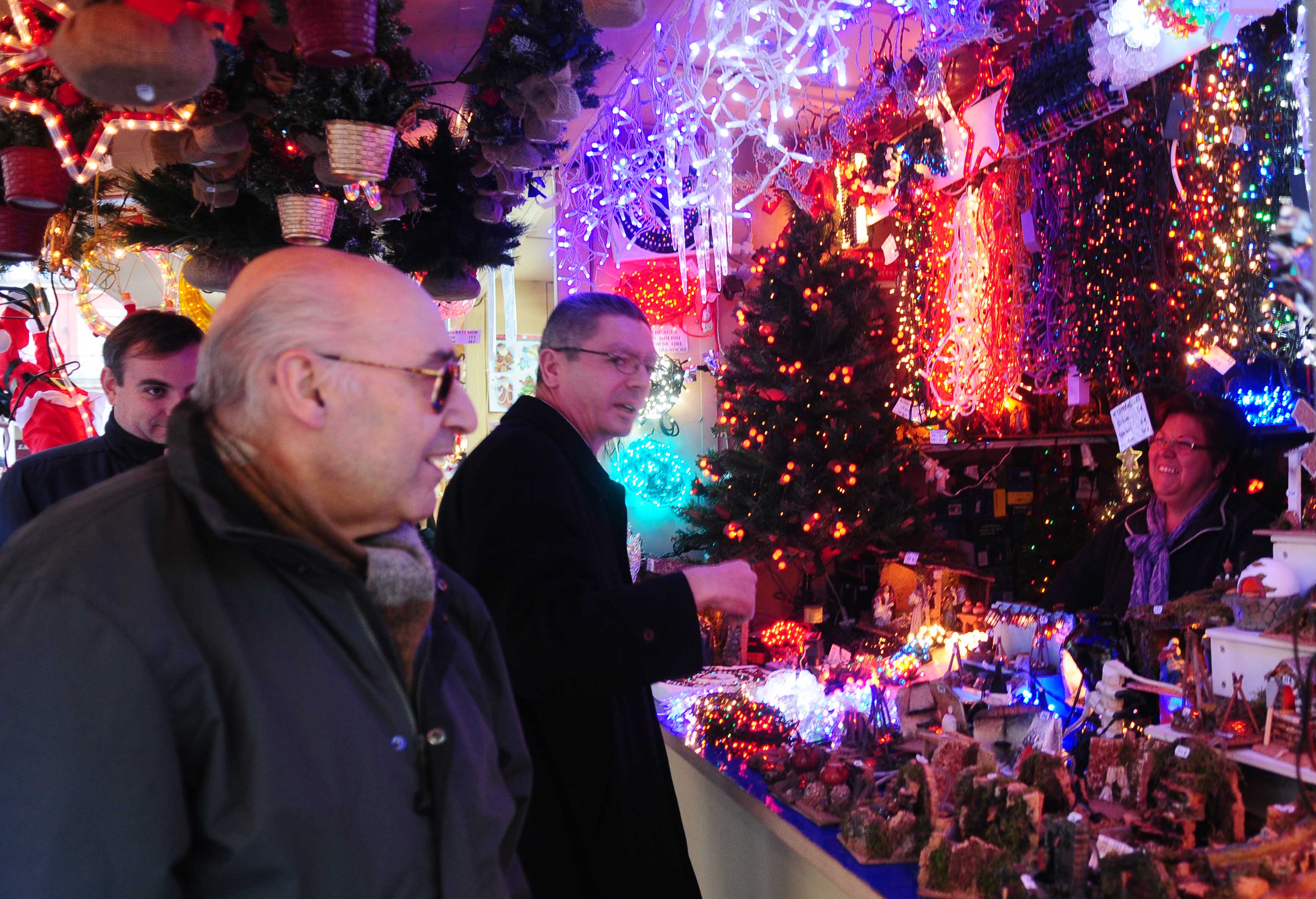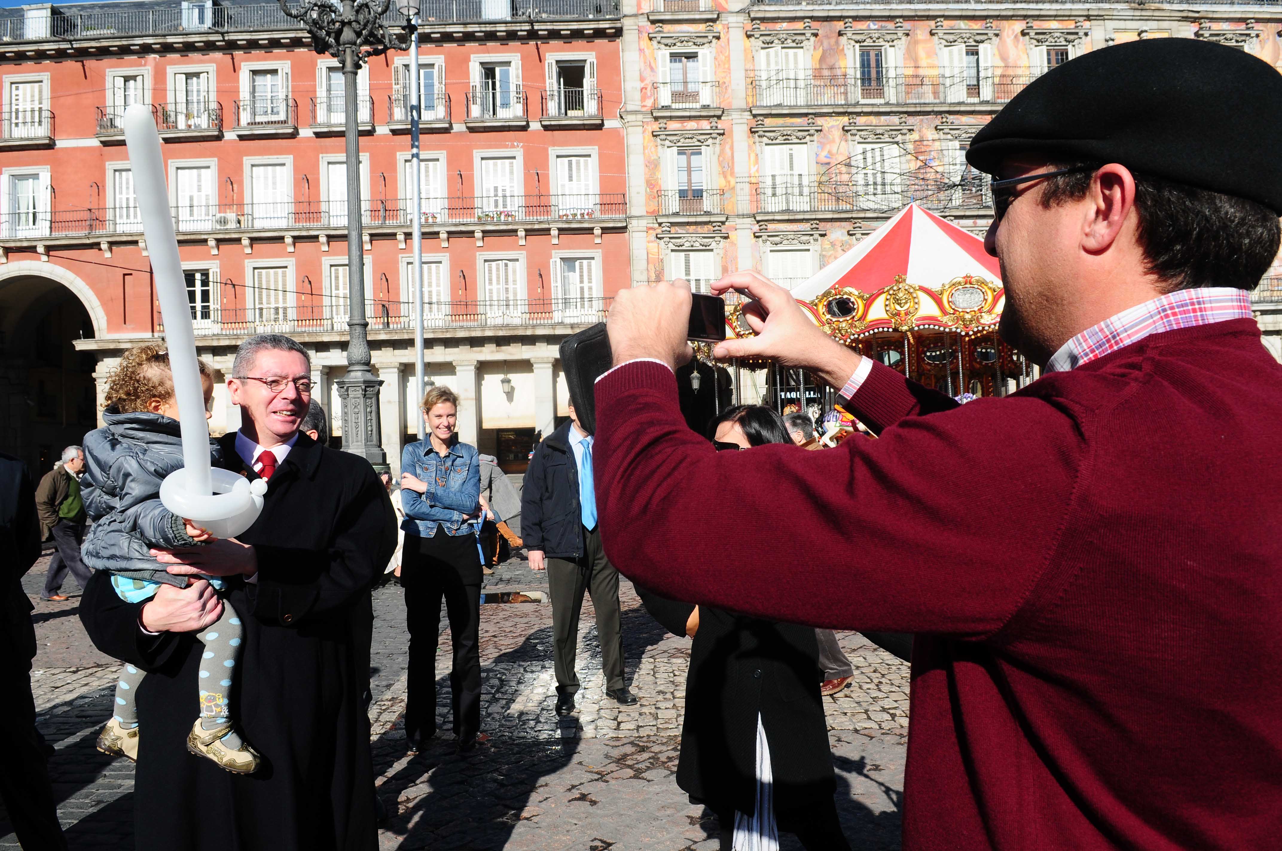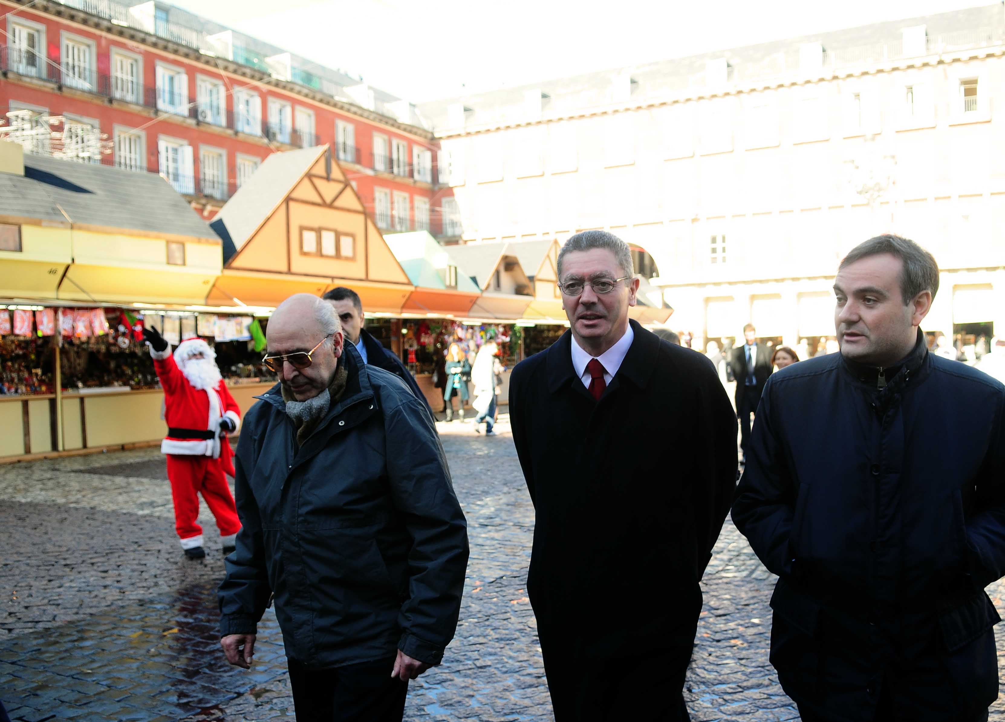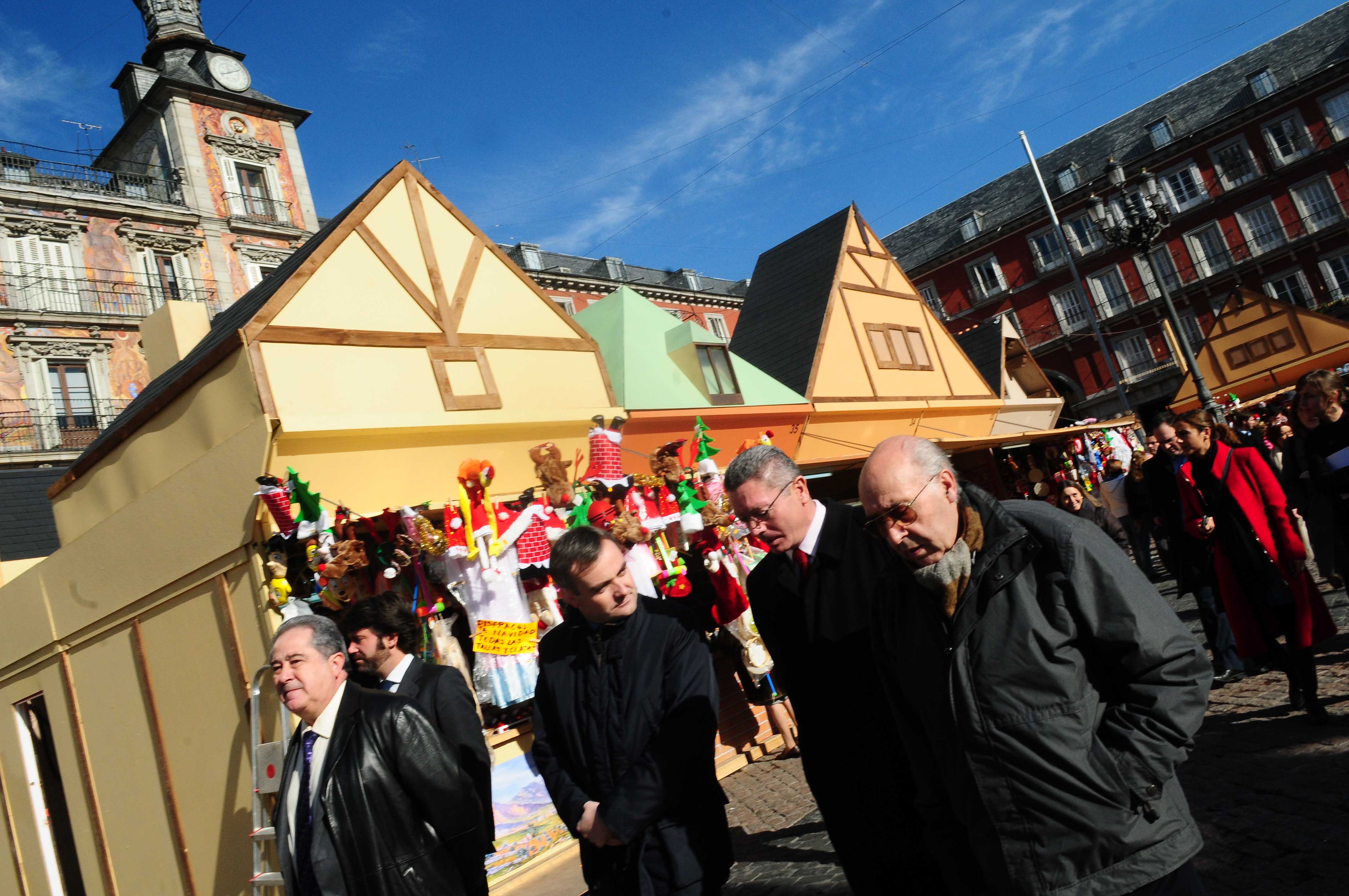 El alcalde de la Ciudad de Madrid, Alberto Ruiz-Gallardón, durante el recorrido que ha realizado este mediodía a lo largo de los puestos del Mercadillo Navideño de la Plaza Mayor, donde se ha apostado por la seguridad del recinto sin olvidarse de la estética.