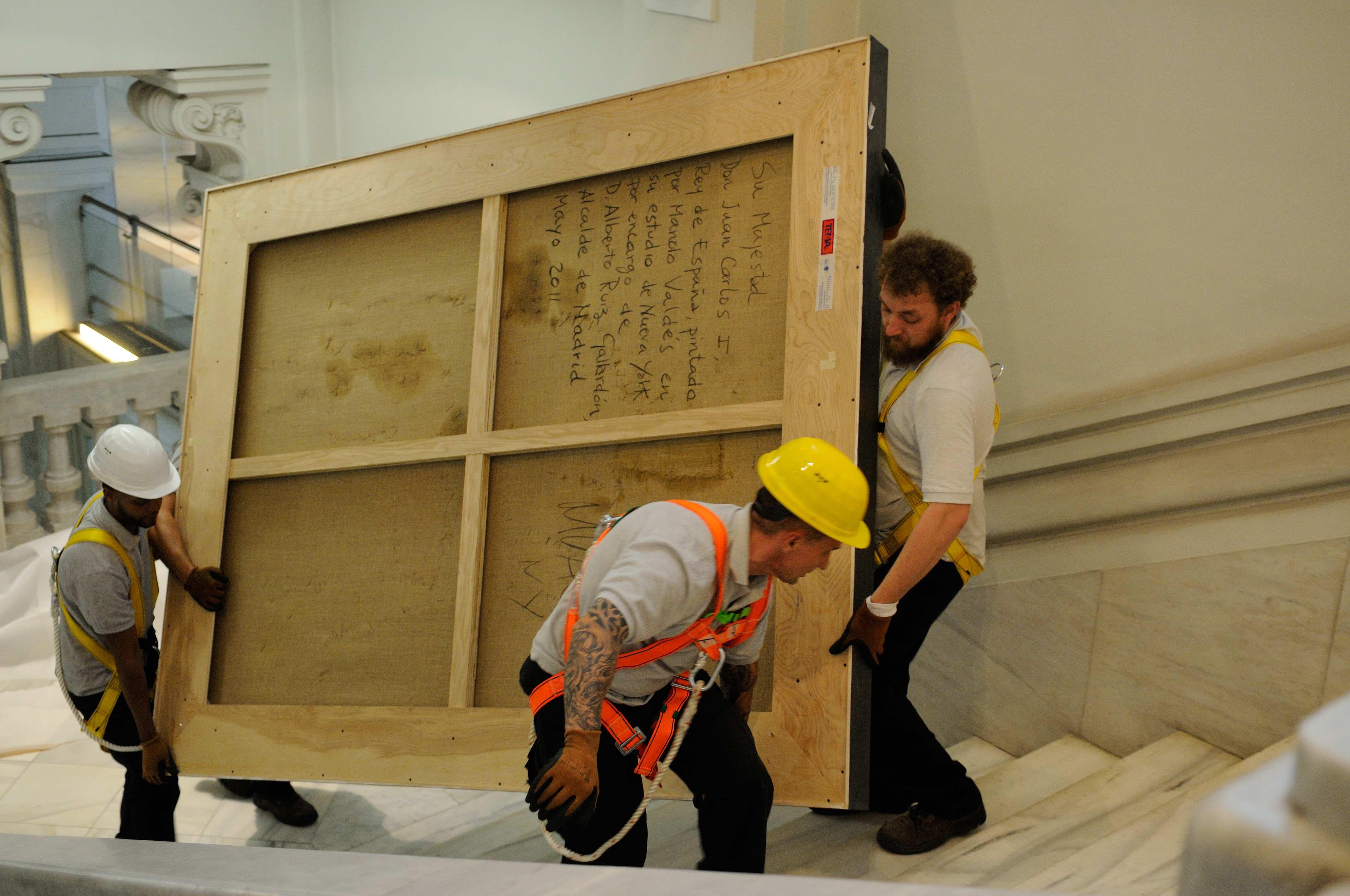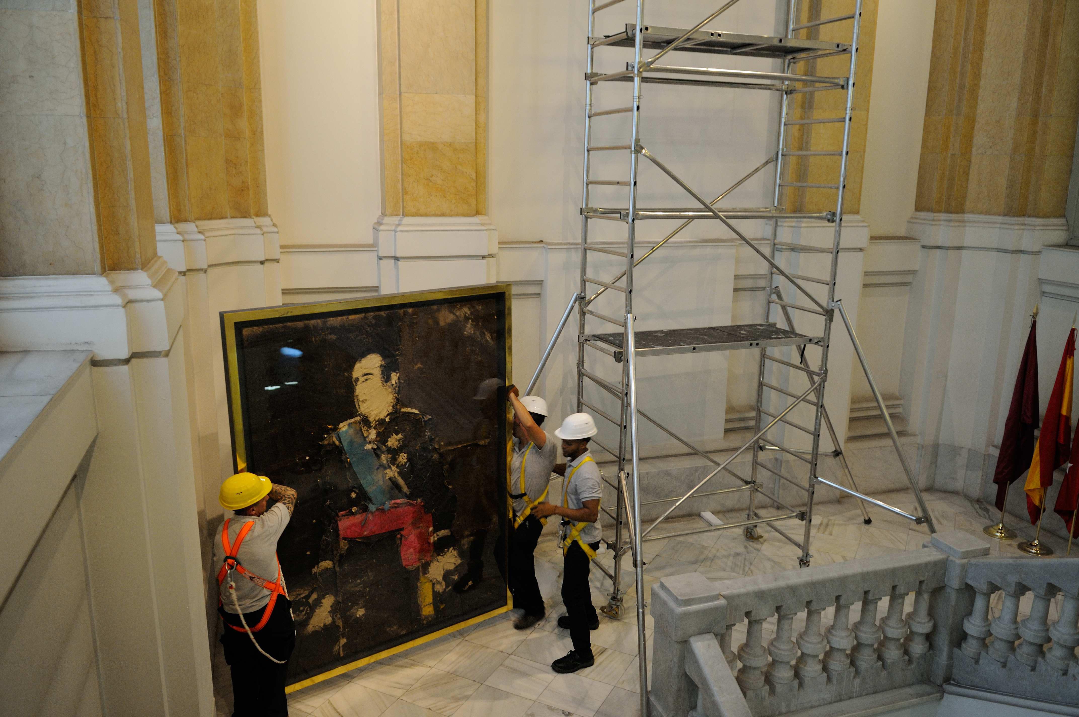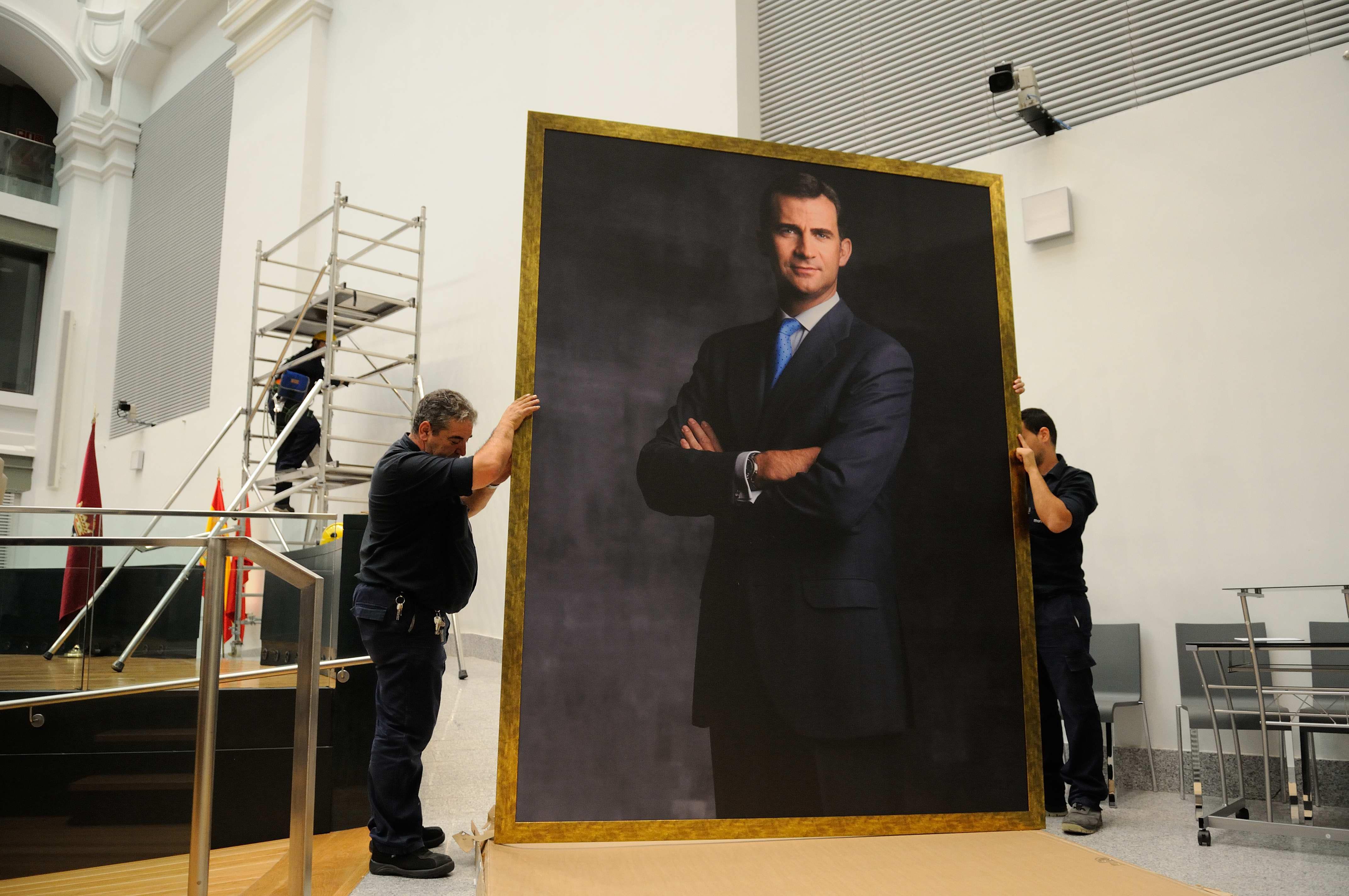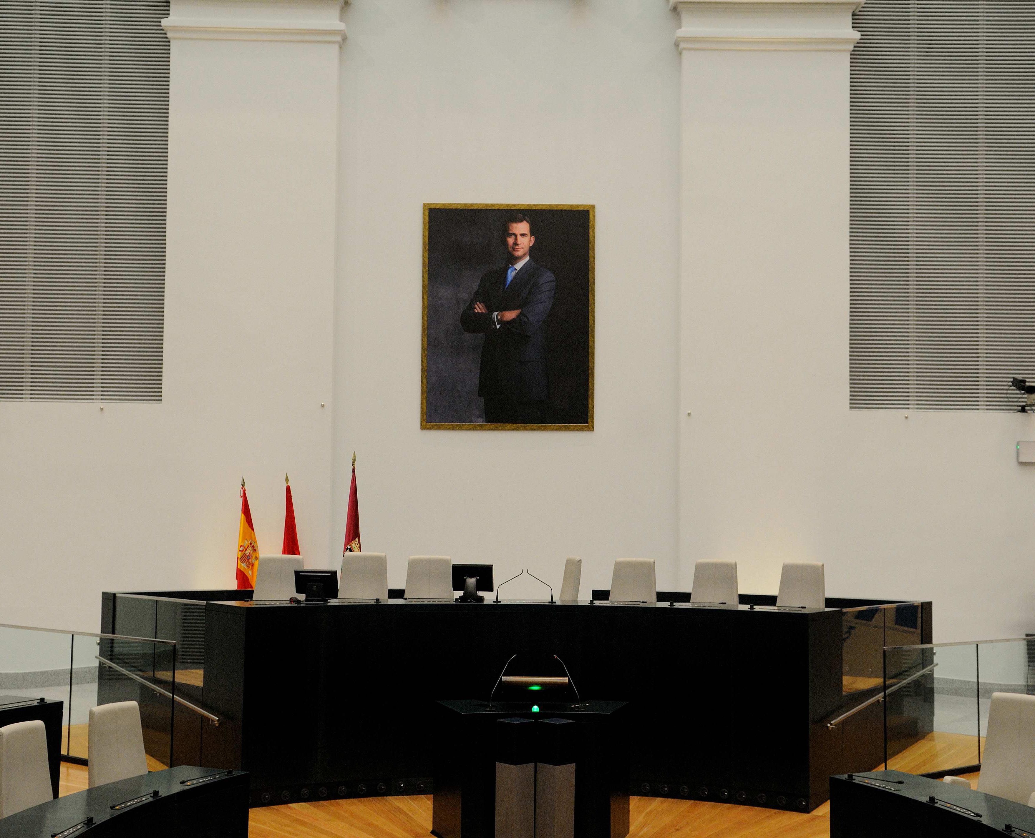 La foto de Felipe VI presidirá, desde hoy día 24 de junio, el Salón de Plenos del Palacio de Cibeles, mientras que el retrato del anterior monarca, Juan Carlos I, se ha trasladado a la planta tercera del edifico. Con ello se da cumplimiento a lo establecido en el artículo 85.2 del Reglamento de Organización, Funcionamiento y Régimen Jurídico de las Entidades Locales, aprobado por RD 2568/1986 de 28 de noviembre a tenor del cual "En lugar preferente del salón de sesiones estará colocada la efigie de S.M. El Rey". El salón de Plenos fue inaugurado en noviembre de 2011 por don Juan Carlos. Con motivo de aquella visita, que formaba parte de un recorrido por el proyecto ‘El corazón de la ciudad’, se colocó su retrato, donado por Manuel Valdés, para presidir la Sala. El de Felipe VI es una reproducción de la fotografía enviada a la Presidencia del Pleno por el Departamento de Comunicación de la Casa de Su Majestad el Rey ampliada a las medidas de 2,00 x 2,67 metros que presidirá las sesiones plenarias de la Corporación Municipal de Madrid. /