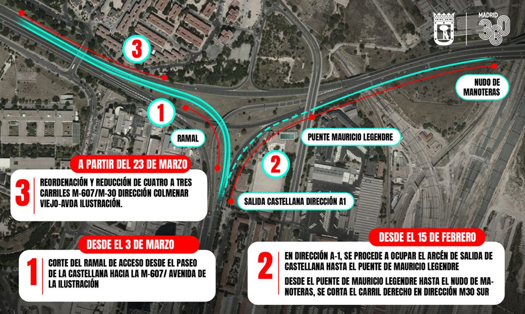 A fecha 3 de marzo se cortó el ramal desde el paseo de la Castellana hacia la M-607/avenida de la Ilustración (en dirección a Colmenar Viejo) y a partir del 15 de febrero se ocupó el arcén de salida del paseo de la Castellana hasta el puente de Mauricio Legendre.