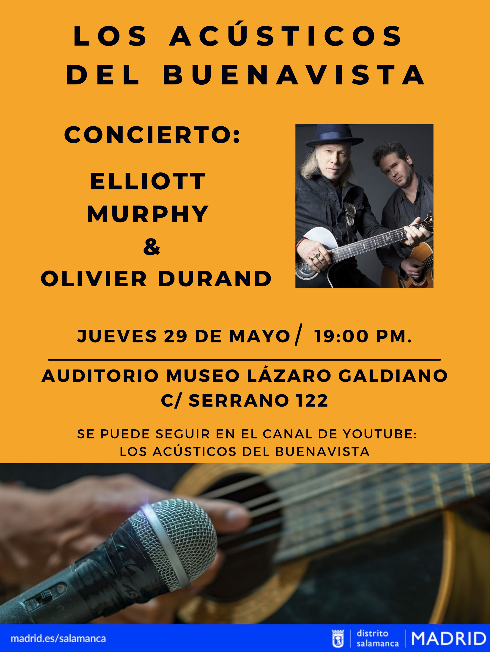 Los Acústicos del Buenavista reciben la visita de uno de los músicos americanos más importantes de las últimas décadas: Elliott Murphy. El neoyorkino será protagonista, junto al prestigioso Olivier Durand a la guitarra, de la próxima cita del ciclo musical del distrito de Salamanca que tendrá lugar el jueves, 29 de mayo, a las 19:00 h en el auditorio del Museo Lázaro Galdiano.
