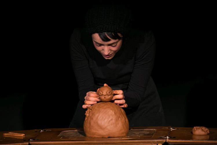 A mano es una pieza escénica de la compañía El Patio Teatro que aúna la cerámica y el teatro. Una historia contada con barro, a través de un pequeño personaje con un enorme deseo de escapar, un escaparate y sus inquilinos, una historia de amor, una historia de pequeños fracasos, un torno, una diminuta alfarería y cuatro manos que juegan.