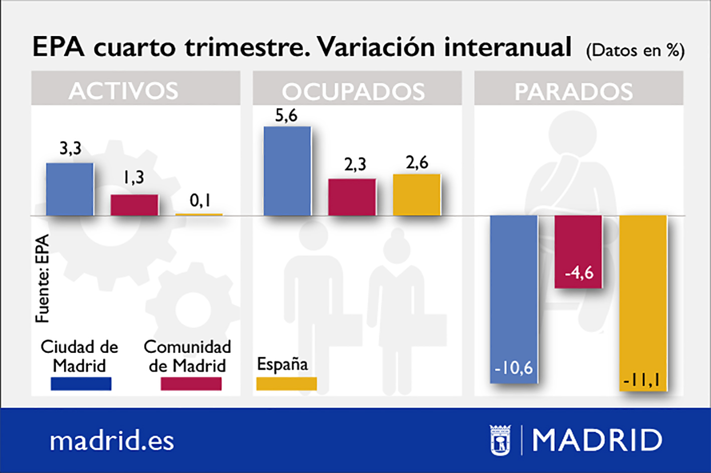 La variación interanual del desempleo en la ciudad de Madrid revela un descenso 10,6%, lo que representa 23.500 parados menos que hace un año, según los datos de la Encuesta de Población Activa (EPA) correspondientes al cuarto trimestre de 2017. Y la tasa de paro retrocede hasta el 12,5%, lo que reduce en 1,9 puntos la de hace un año, mientras que la de la Comunidad de Madrid se sitúa en el 13,7% y la tasa de paro del conjunto de España está en el 16,5%.