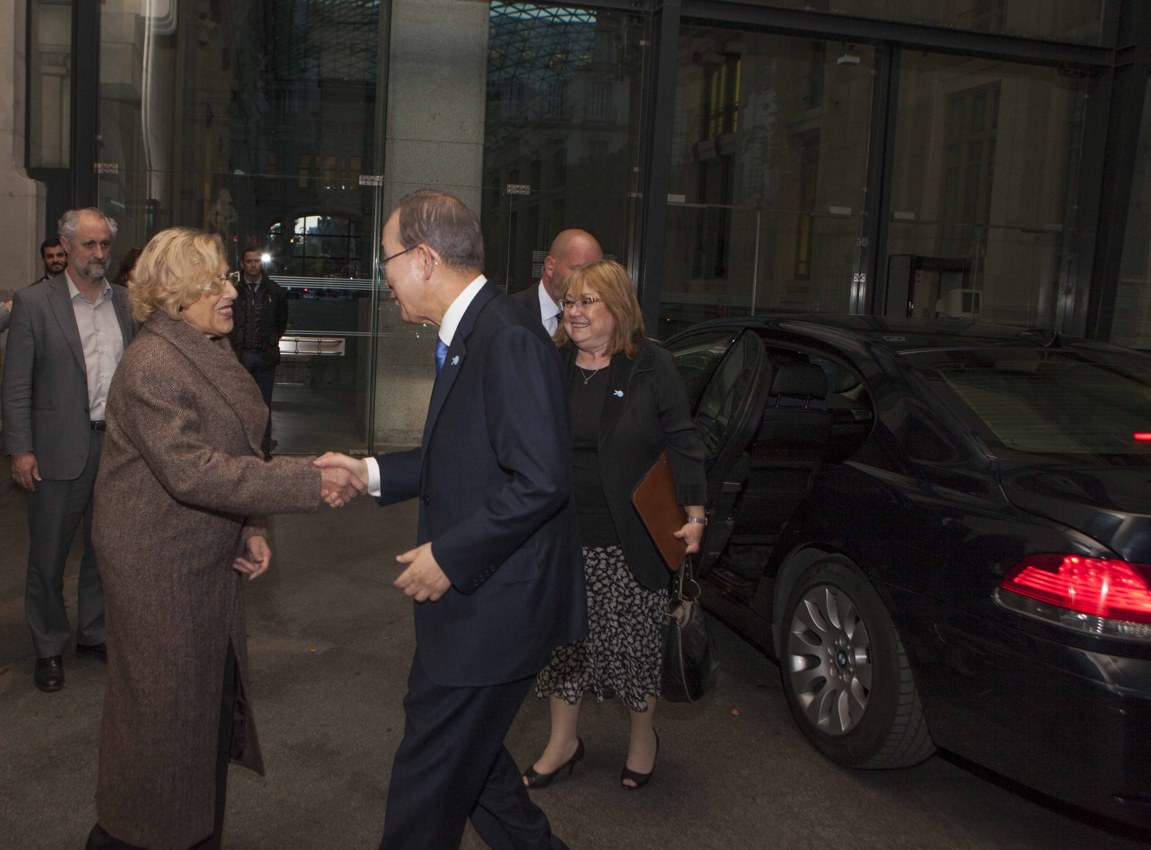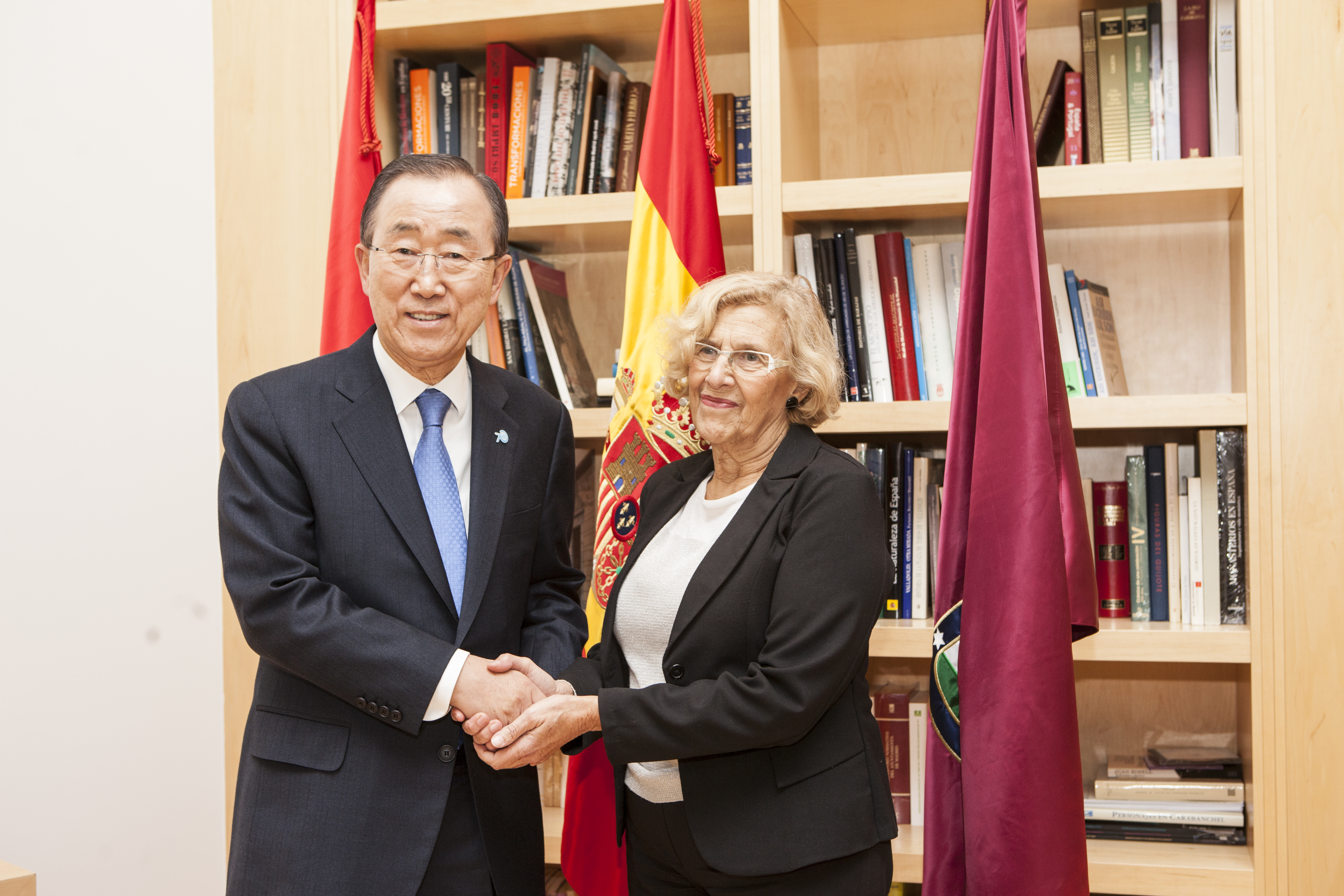 La alcaldesa de Madrid, Manuela Carmena, se ha entrevistado esta tarde (28 octubre) con el Secretario General de Naciones Unidas, Ban Ki-Moon, en la Sala de Juntas de Gobierno del Ayuntamiento. Carmena ha estado acompañada del Coordinador General de la Alcaldía, Luis Cueto y del Director del Gabinete de la Alcaldía, Felipe Llamas. Carmena y Ban Ki-Moon, además de tratar temas de actualidad, han hablado sobre la propuesta que la alcaldesa ha hecho recientemente para crear un Instituto por la Cultura de la Paz y de este modo convertir a Madrid en un referente internacional de la paz.