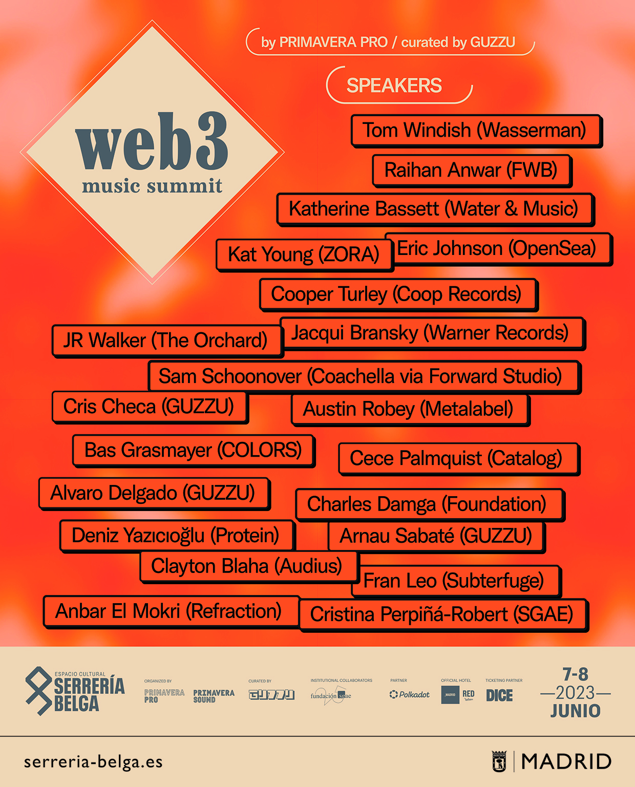 El Espacio Cultural Serrería Belga acogerá el 7 y 8 de junio Web3 Music Summit, un congreso organizado por Primavera Pro en colaboración con GUZZU y con el apoyo del Ayuntamiento de Madrid y Fundación SGAE. El encuentro pondrá la mirada en la colaboración y la innovación en el sector musical y abordará, por primera vez en España, las oportunidades que surgen al conectar la Web3 (una forma superior de la Web que promete ser más rápida, más segura y más privada) y la música.