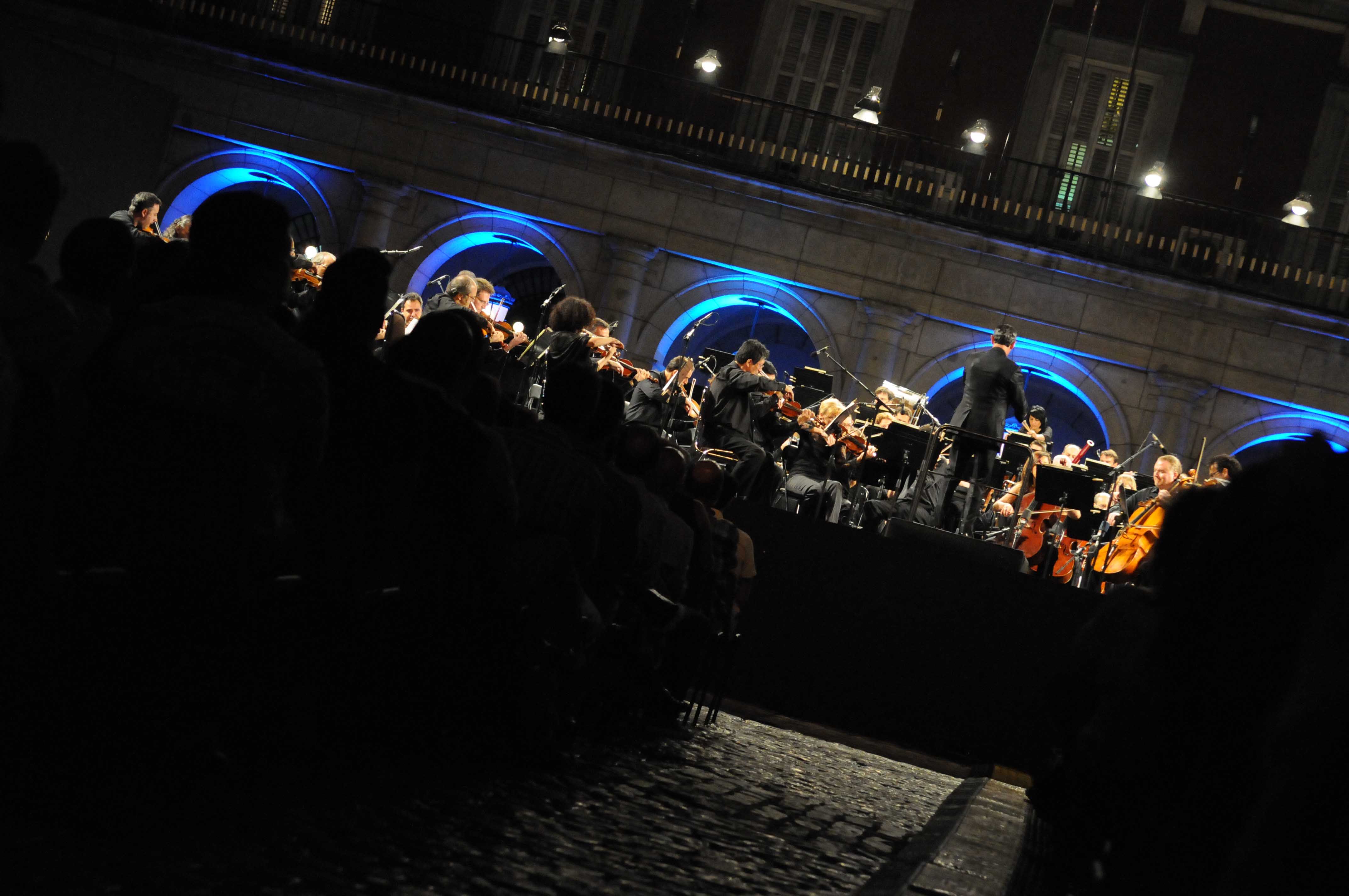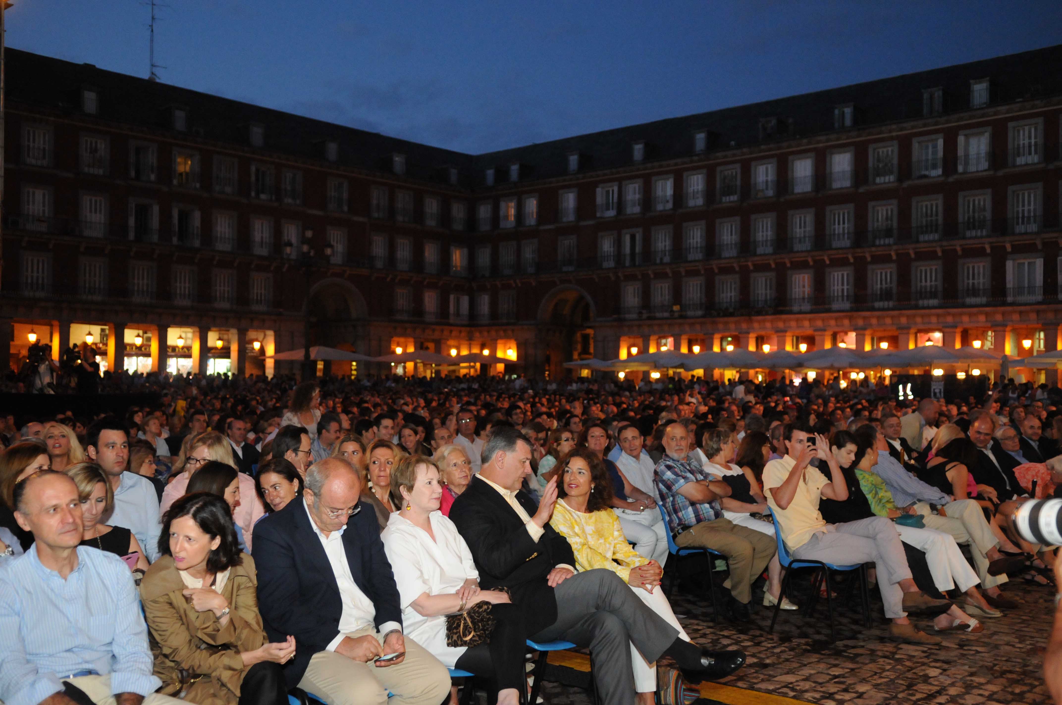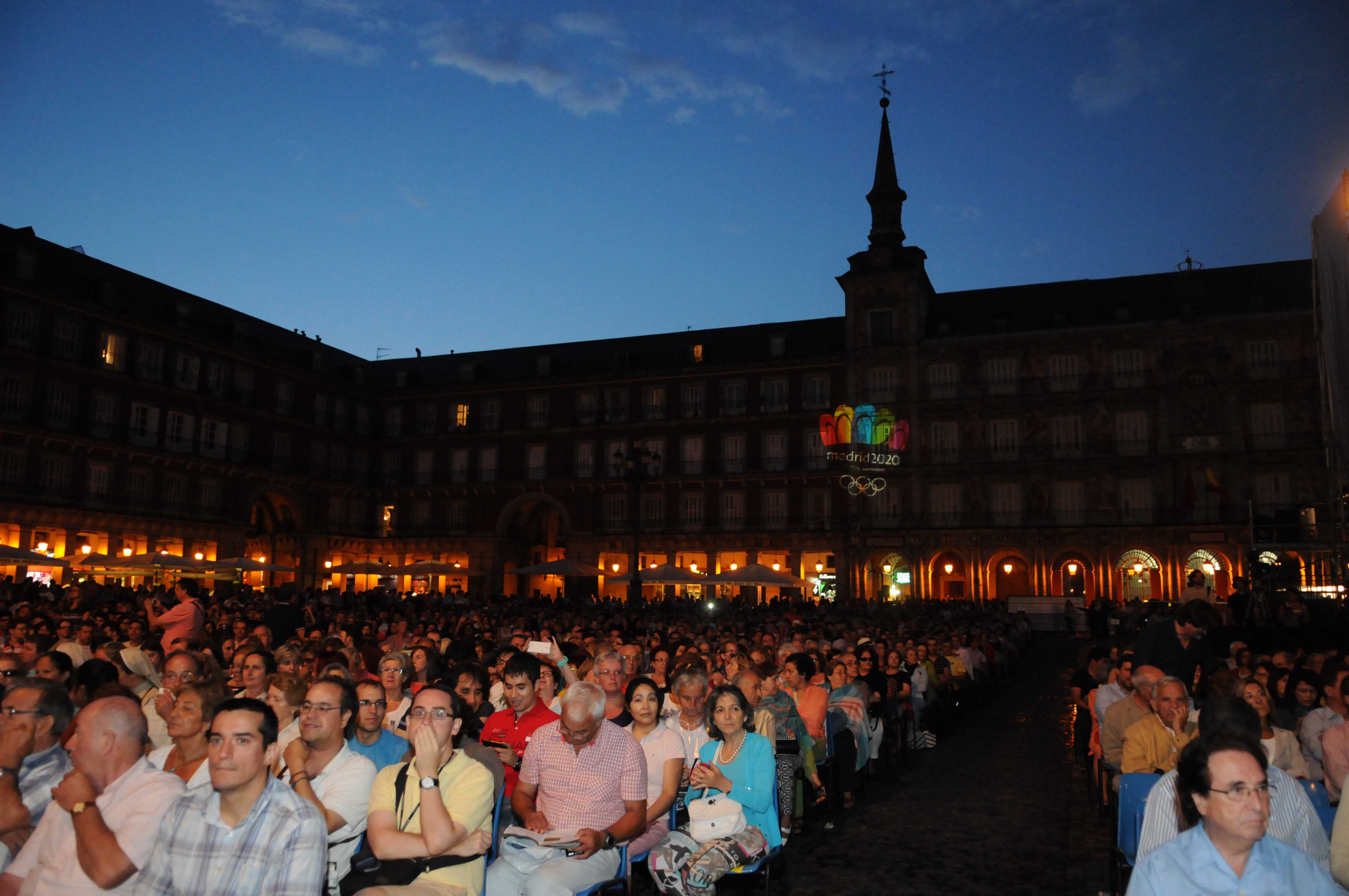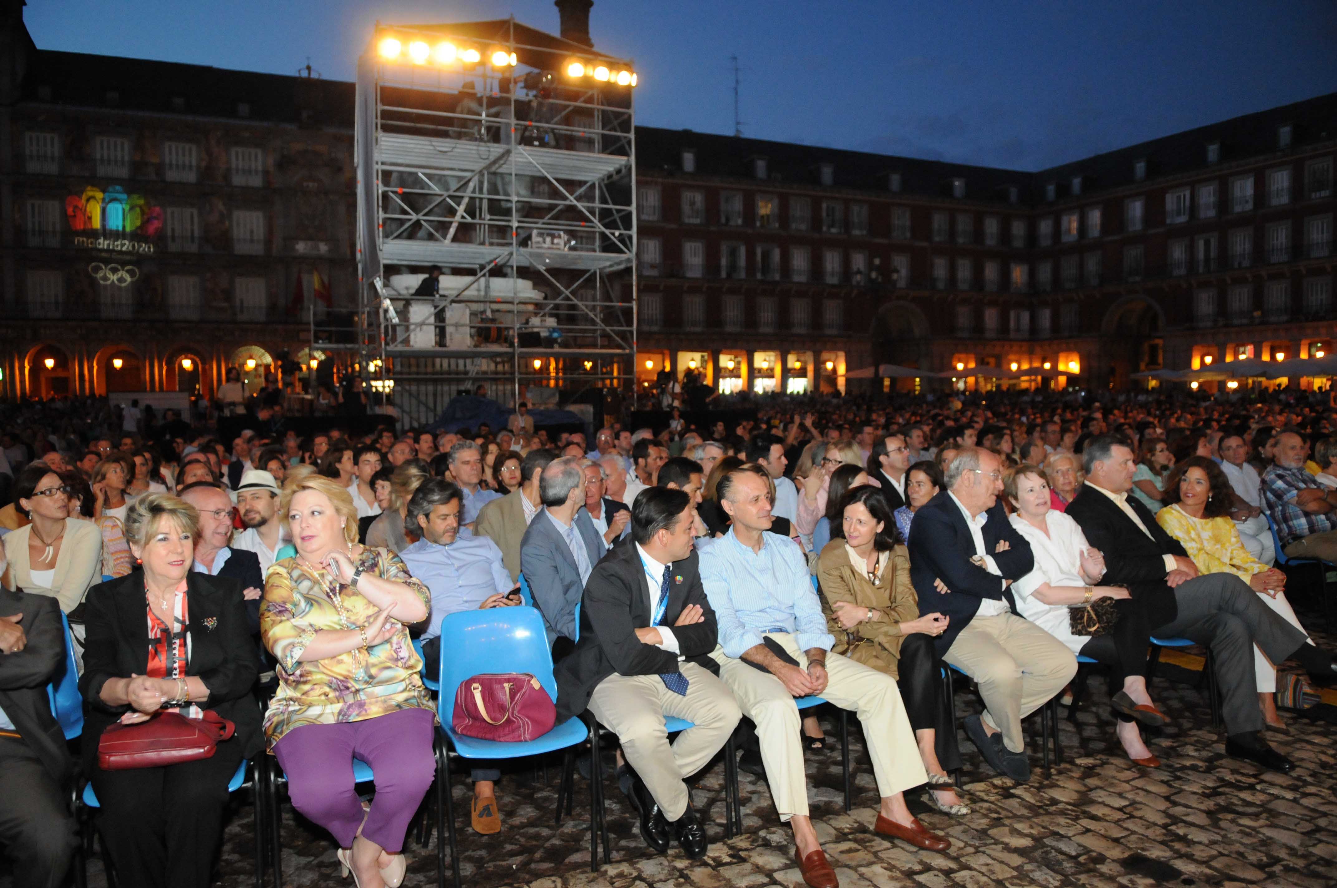 La Plaza Mayor acogió esta noche una de las citas musicales más esperadas de los Veranos de la Villa. Un concierto extraordinario en apoyo a la candidatura olímpica de Madrid 2020 interpretado por la Orquesta de la Comunidad de Madrid bajo la dirección de Miguel Ángel Gómez Martínez. Inicialmente el concierto iba a contar con la dirección de Plácido Domingo. El tenor, que el próximo 24 de julio será nombrado Hijo Predilecto en un Pleno Extraordinario, se sumó al acto con un mensaje de apoyo a la Candidatura de Madrid para albergar los Juegos Olímpicos y Paralímpicos de 2020 y agradeció a la alcaldesa Ana Botella y al público las muestras de apoyo y de cariño