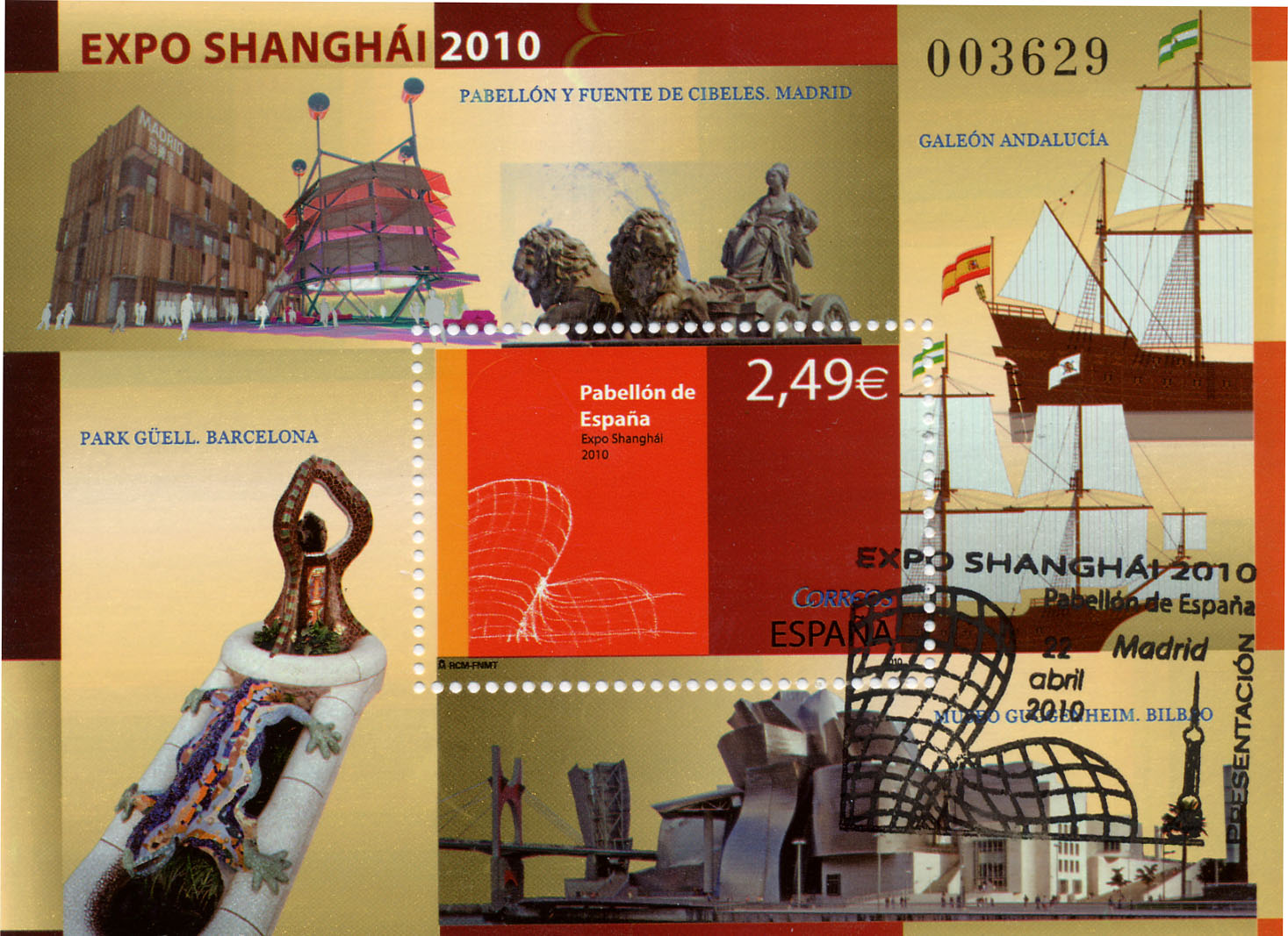 La emisión del sello de Expo Shanghái 2010, que se ha presentado en el marco de la XLII Feria Nacional del Sello que se celebra en la Plaza Mayor, contribuye a dar a conocer la participación de la Ciudad de Madrid en este certamen, mediante la reproducción de la imagen de su pabellón, formado por dos piezas singulares, que en el sello aparecen en recreación virtual, pero que al día de hoy ya están totalmente terminadas y listas para entrar en servicio el próximo día 1 de mayo.
