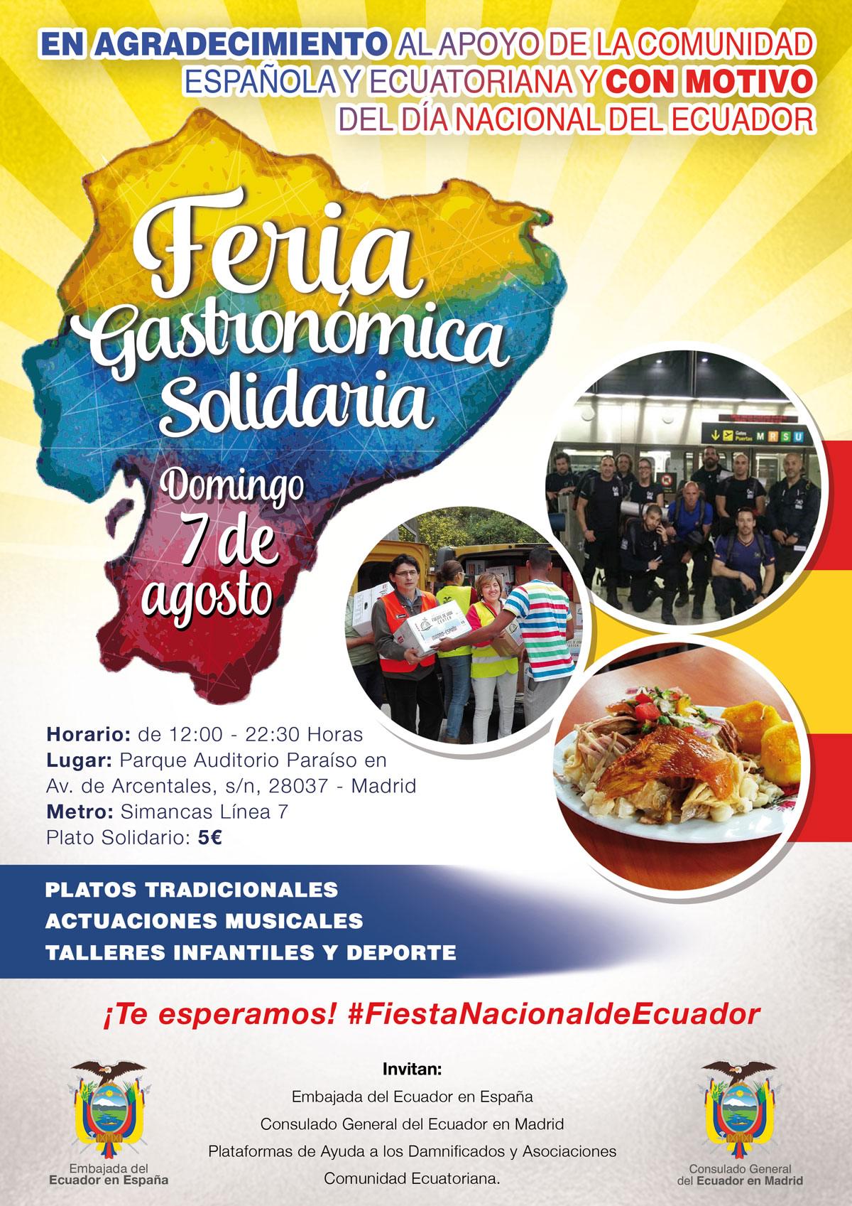 La comunidad ecuatoriana en Madrid conmemorará su Fiesta Nacional el próximo domingo 7 de agosto, desde las 12:00 a las 22:30 horas, en el distrito madrileño de San Blas. El Parque Auditorio Paraíso, cedido por el Ayuntamiento de Madrid, acogerá una Feria Gastronómica Solidaria.