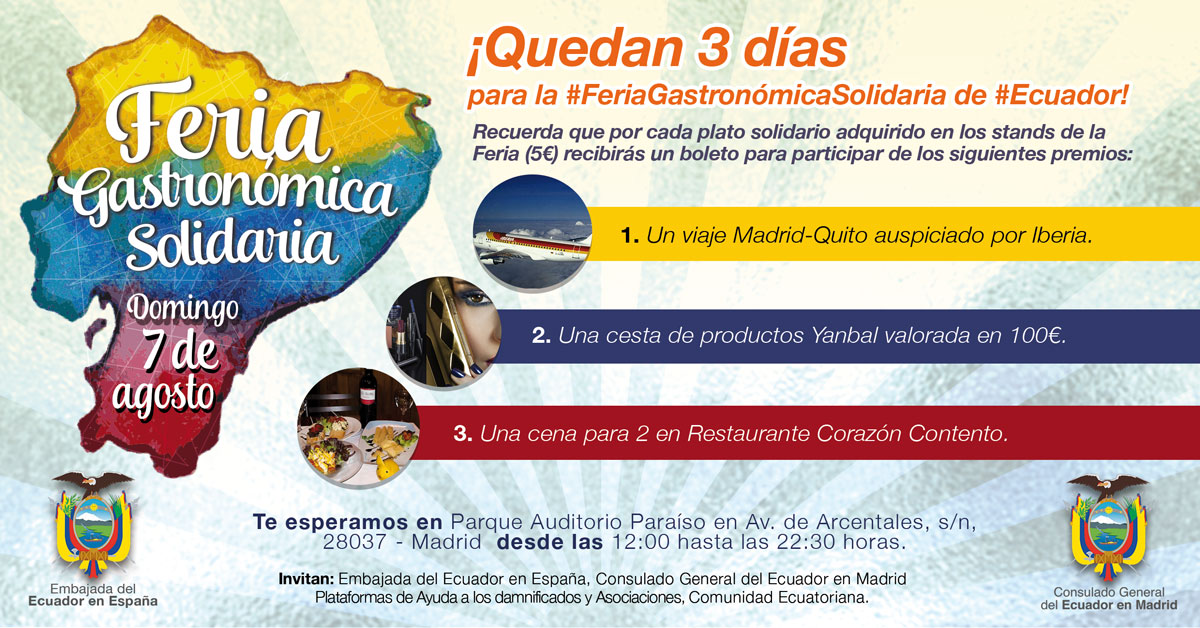 Se venderán platos ecuatorianos por cinco euros, junto con un boleto para participar en el sorteo de un viaje a Ecuador, una cesta de productos Yanbal y una cena para dos personas en el restaurante Corazón Contento de Madrid. La recaudación irá destinada a proyectos de reconstrucción de ciudades afectadas por el seísmo.