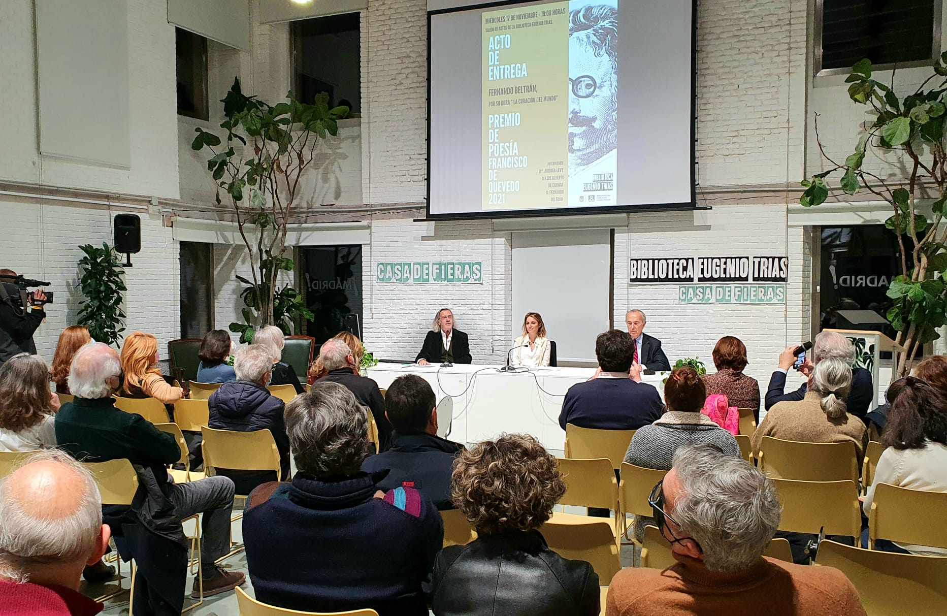 El jurado del Premio de Poesía Francisco de Quevedo correspondiente a 2021 ha otorgado este galardón a Fernando Beltrán por su obra La curación del mundo, publicada por Ediciones Hiperión. La delegada de Cultura, Turismo y Deporte, Andrea Levy, ha entregado hoy este galardón en un acto que ha tenido lugar en la Biblioteca Pública Municipal Eugenio Trías y en el que el premiado ha realizado un recital de algunos de sus versos.