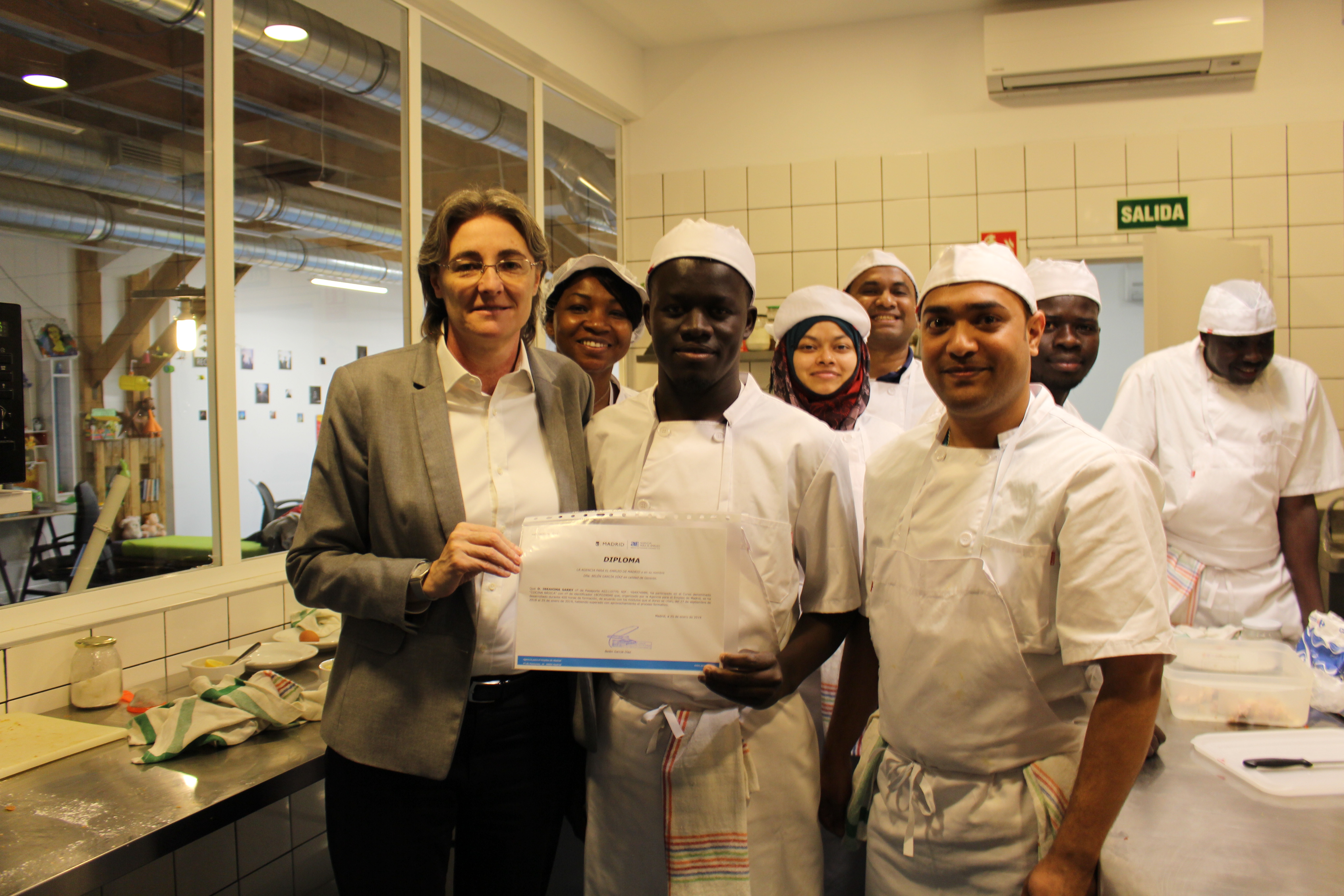La delegada de Equidad, Derechos Sociales y Empleo, Marta Higueras, visita a las 12 alumnas y alumnos que han finalizado el curso de cocina básica, organizado por la Agencia para el Empleo (AE) de forma experimental, dentro del proyecto piloto en el distrito Centro “tarjeta de vecindad”, un documento que visibiliza la condición de vecina y vecino de la ciudad de Madrid. La gerente de la AE, Belén García, les ha entregado los diplomas en el Centro de Formación del mercado de San Fernando, donde se ha impartido este curso becado por la propia agencia.