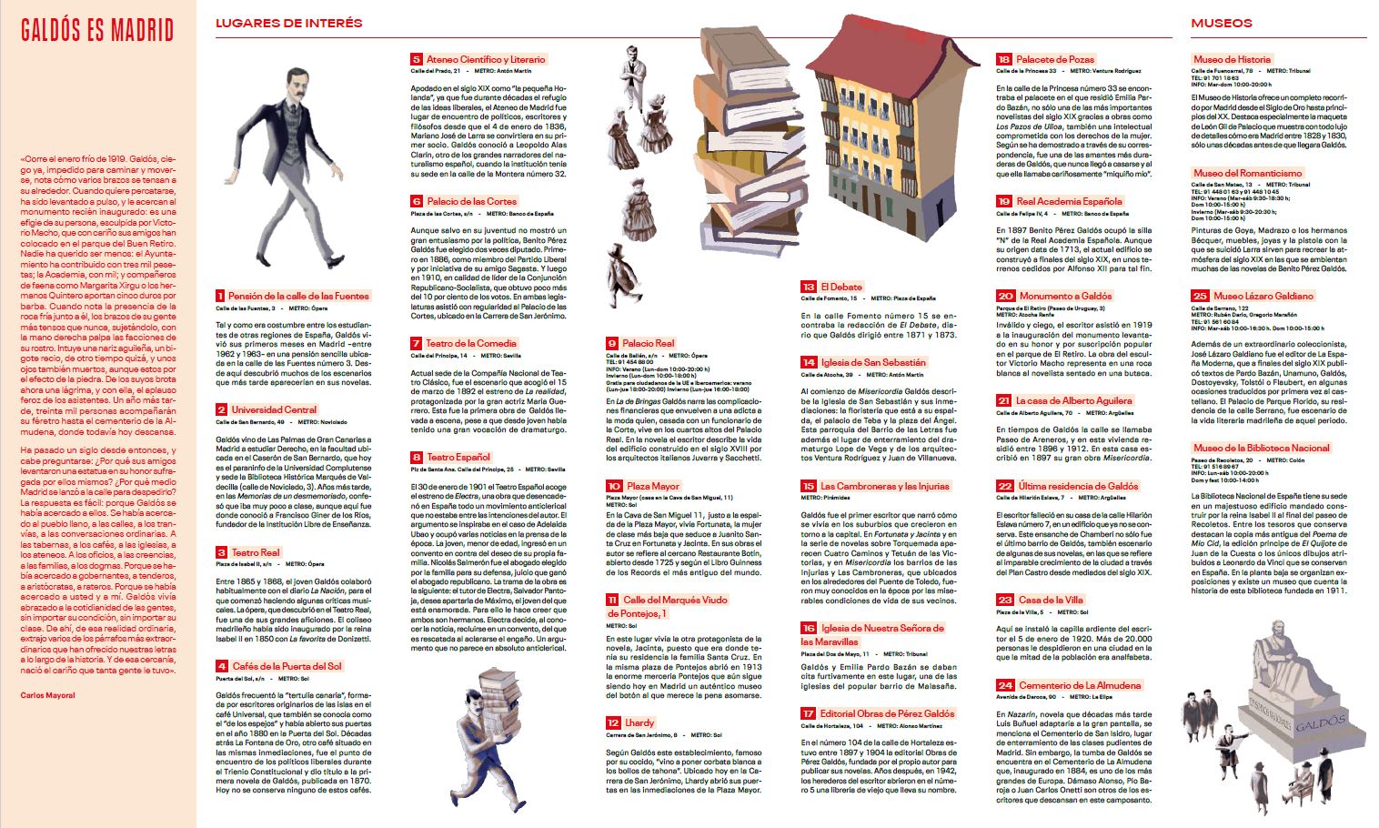 El mapa cultural ha sido ilustrado por Gonzalo Izquierdo y cuenta con el texto de apertura del escritor Carlos Mayoral, que ofrece su mirada sobre el autor en la inauguración de su estatua en el parque del Buen Retiro. Entre los lugares que forman parte de la ruta galdosiana se encuentran la Universidad Central, el Teatro Español, la Plaza Mayor, Lhardy y la redacción de El Debate, el diario que dirigió entre 1871 y 1873.