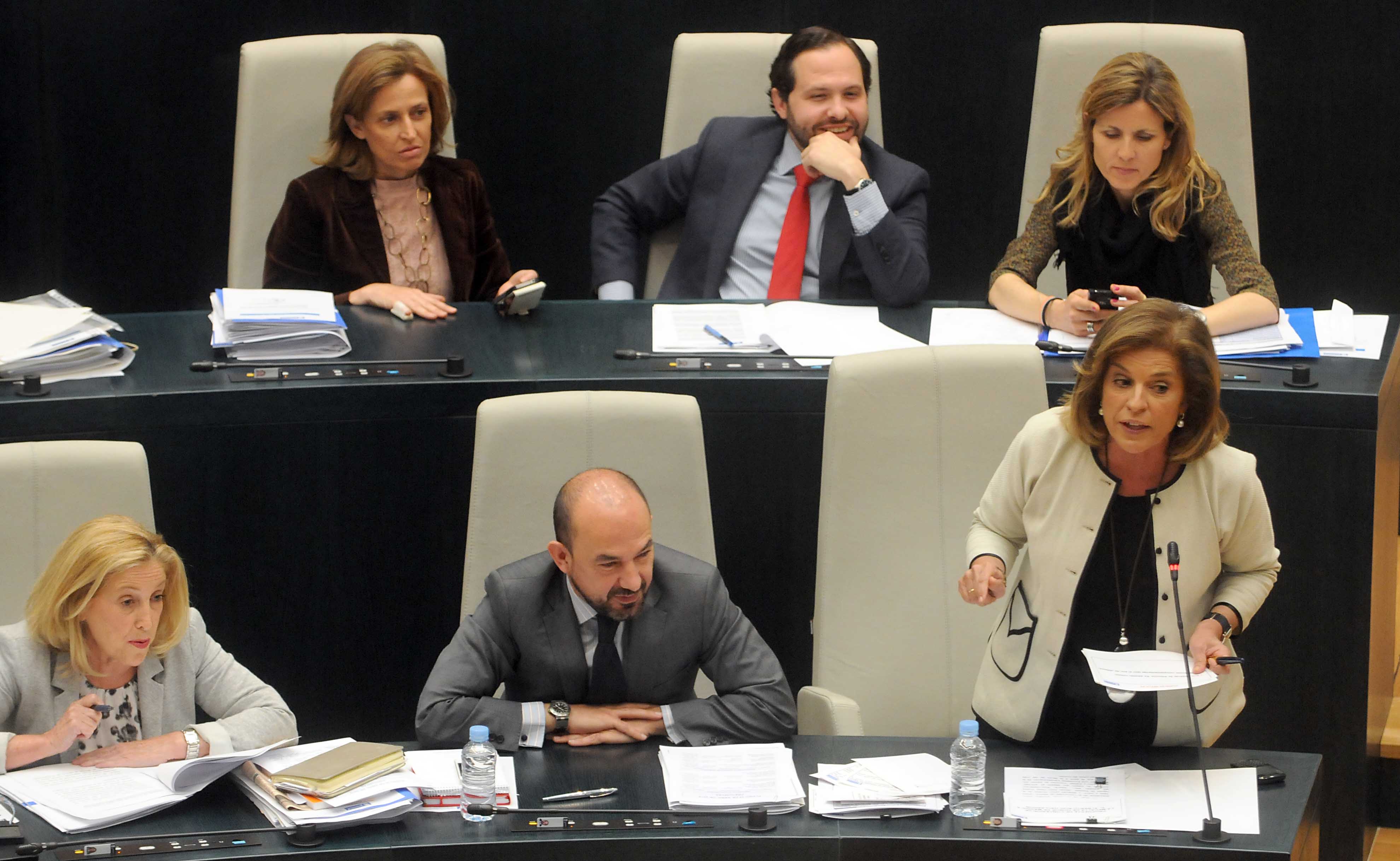 La alcaldesa de Madrid, Ana Botella, y diversos concejales de la corporación, durante la sesión del Pleno municipal celebrado hoy en el Palacio de Cibeles, en el que se ha aprobado la concesión de las Medallas de Oro de Madrid al ex alcalde y actual ministro de Justicia, Alberto Ruiz-Gallardón; al padre Jaime Garralda, por su dedicación a los más necesitados y a las labores sociales; y el cineasta Alejandro Amenábar, por su exitosa carrera en el mundo del cine.