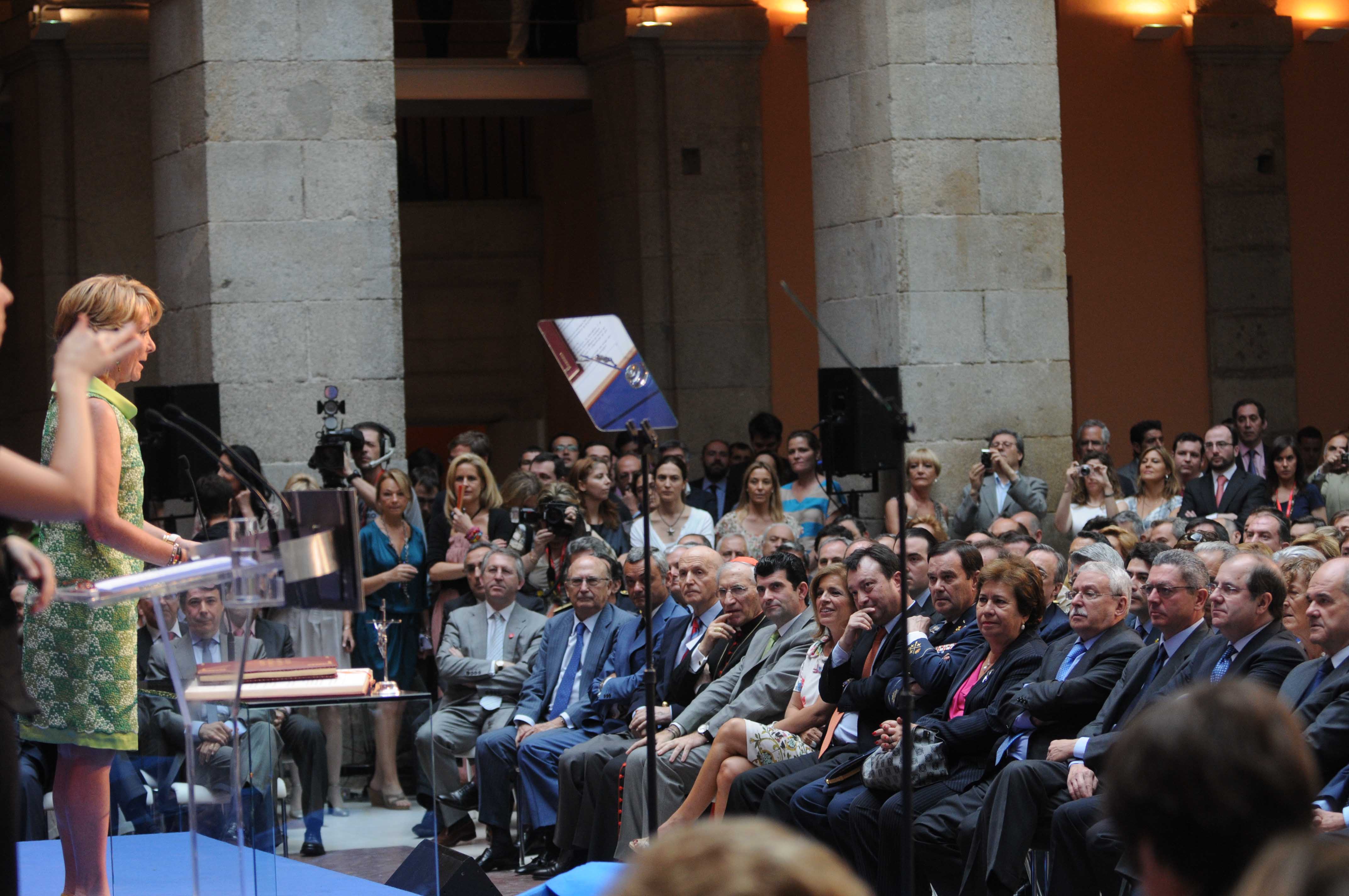 Imágenes de la toma de posesión de la presidenta de la Comunidad de Madrid, Esperanza Aguirre. Al acto, celebrado en la Real Casa de Correos, han asistido el alcalde de Madrid, Alberto Ruiz-Gallardón; el líder del PP, Mariano Rajoy; el vicepresidente tercero del Gobierno, Manuel Chaves; el presidente de Castilla y León, Juan Vicente Herrera, y el expresidente de la Comunidad, Joaquín Leguina, entre otros.