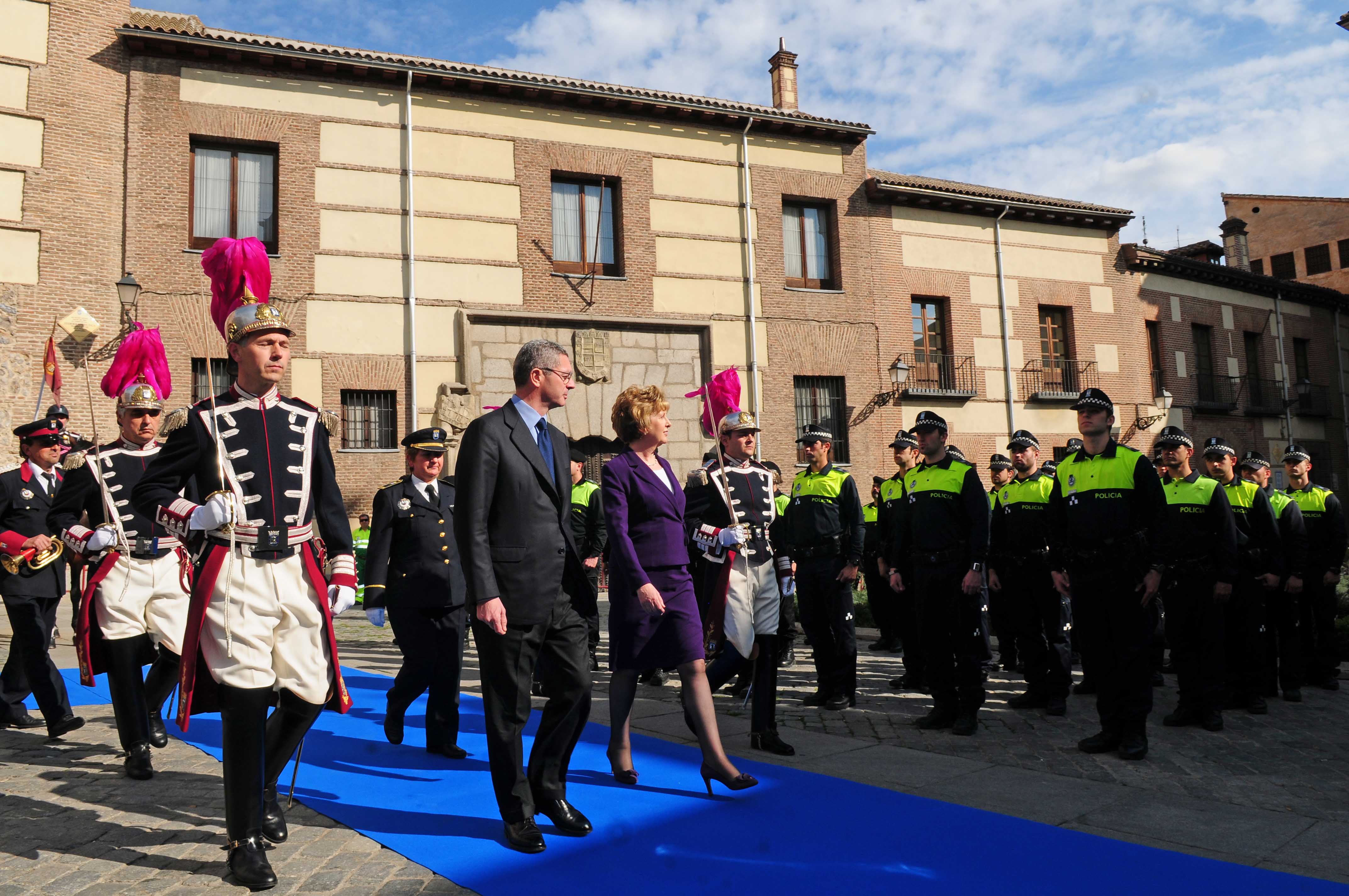 Imágenes de la entrega de las Llaves de Oro de la Ciudad de Madrid a la presidenta de Irlanda, Mary McAleese. El alcalde, Alberto Ruiz-Gallardón, ha recibido esta tarde a McAleese, de viaje oficial en España, en la Plaza de la Villa y le ha entregado las Llaves de Oro en el Salón de Plenos.
