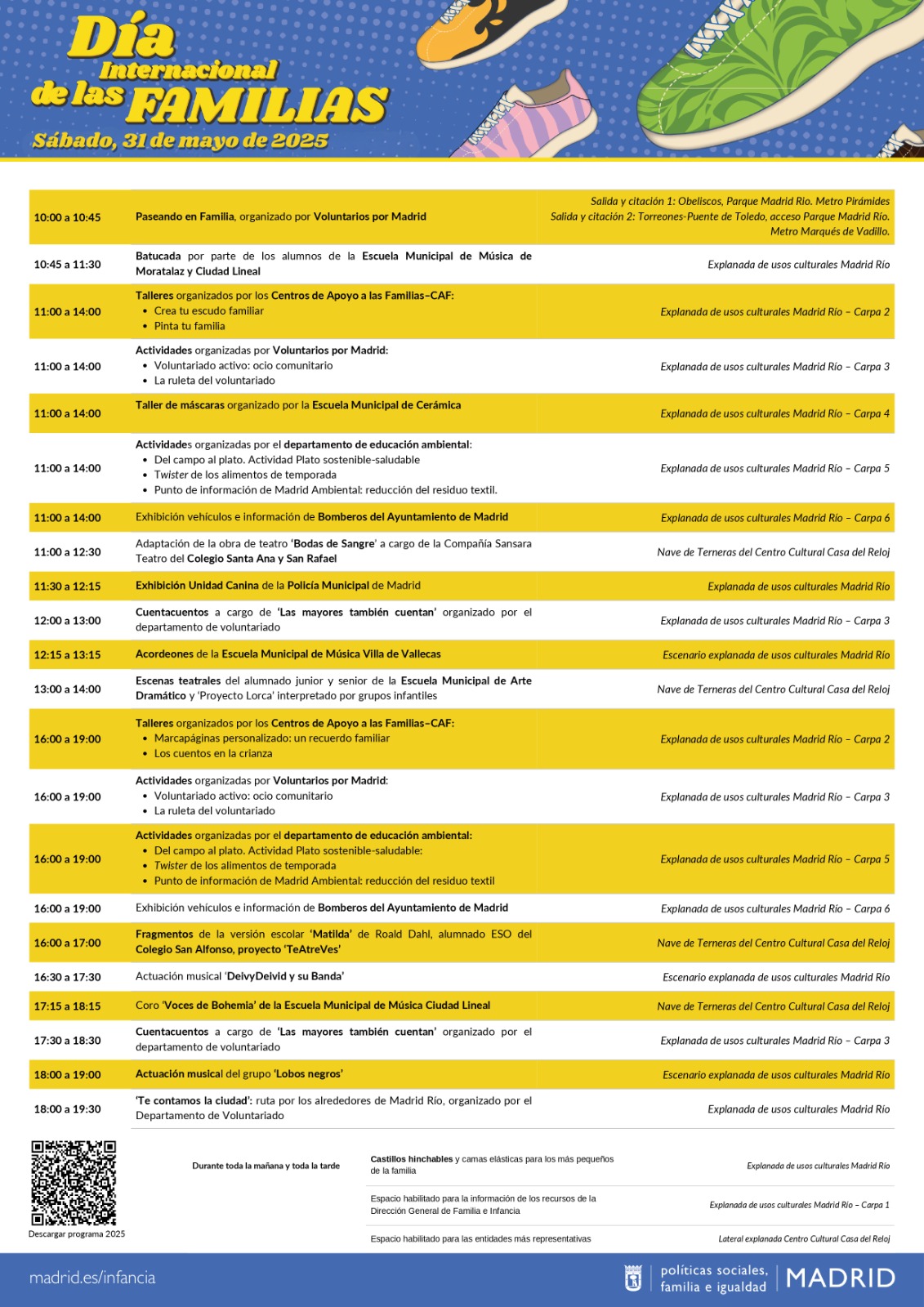 El Ayuntamiento de Madrid organiza este sábado, 31 de mayo, una jornada festiva abierta a las familias madrileñas con la que conmemorará el Día Internacional de las Familias, que se celebra cada año el 15 de mayo. Por segundo año consecutivo, la explanada de usos culturales de Madrid Río (junto a Matadero) acogerá más de una veintena de actividades, juegos, talleres, representaciones teatrales y actuaciones musicales en horario de 11:00 a 14:00 horas y de 16:00 a 19:00 horas.