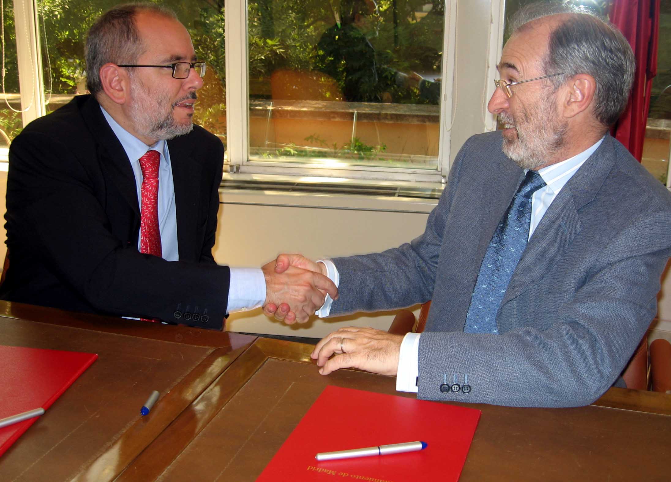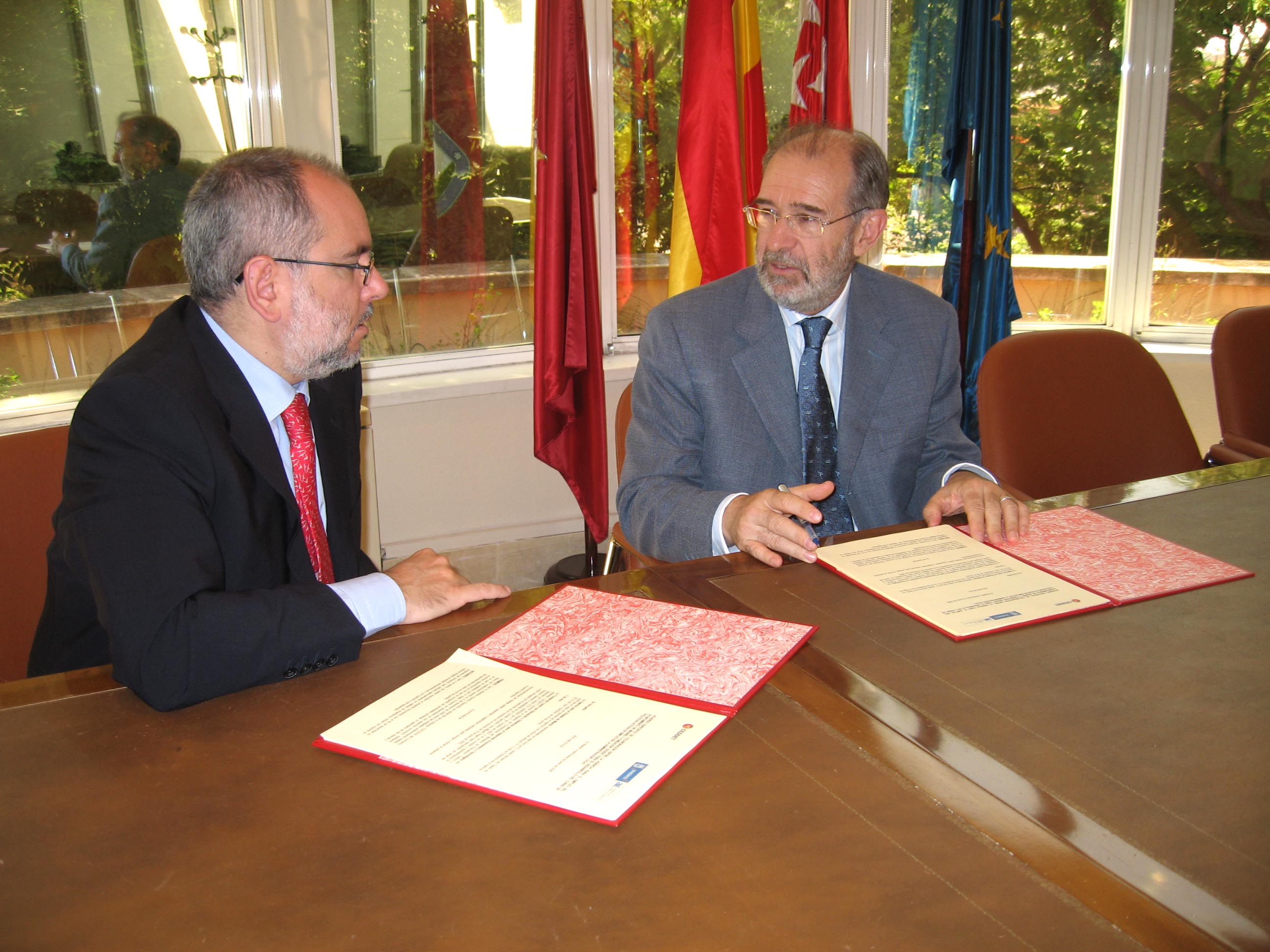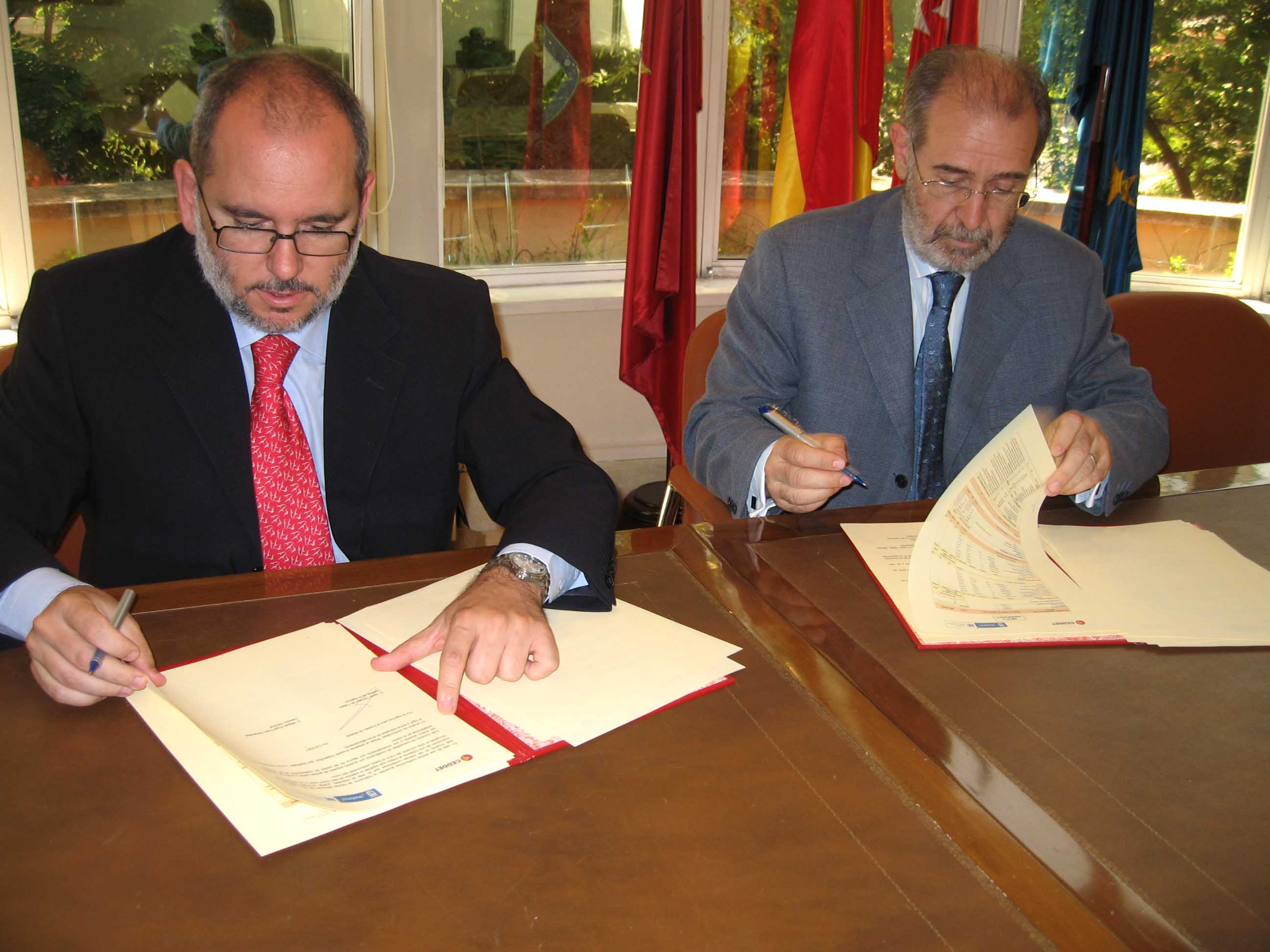 El gerente de la Agencia para el Empleo (AE), Javier Serrano, y el director General de la Fundación CEDDET, durante la firma de un convenio mediante el cual se impartirá un curso en Internet para que los inmigrantes latinoamericanos aprendan a buscar empleo.