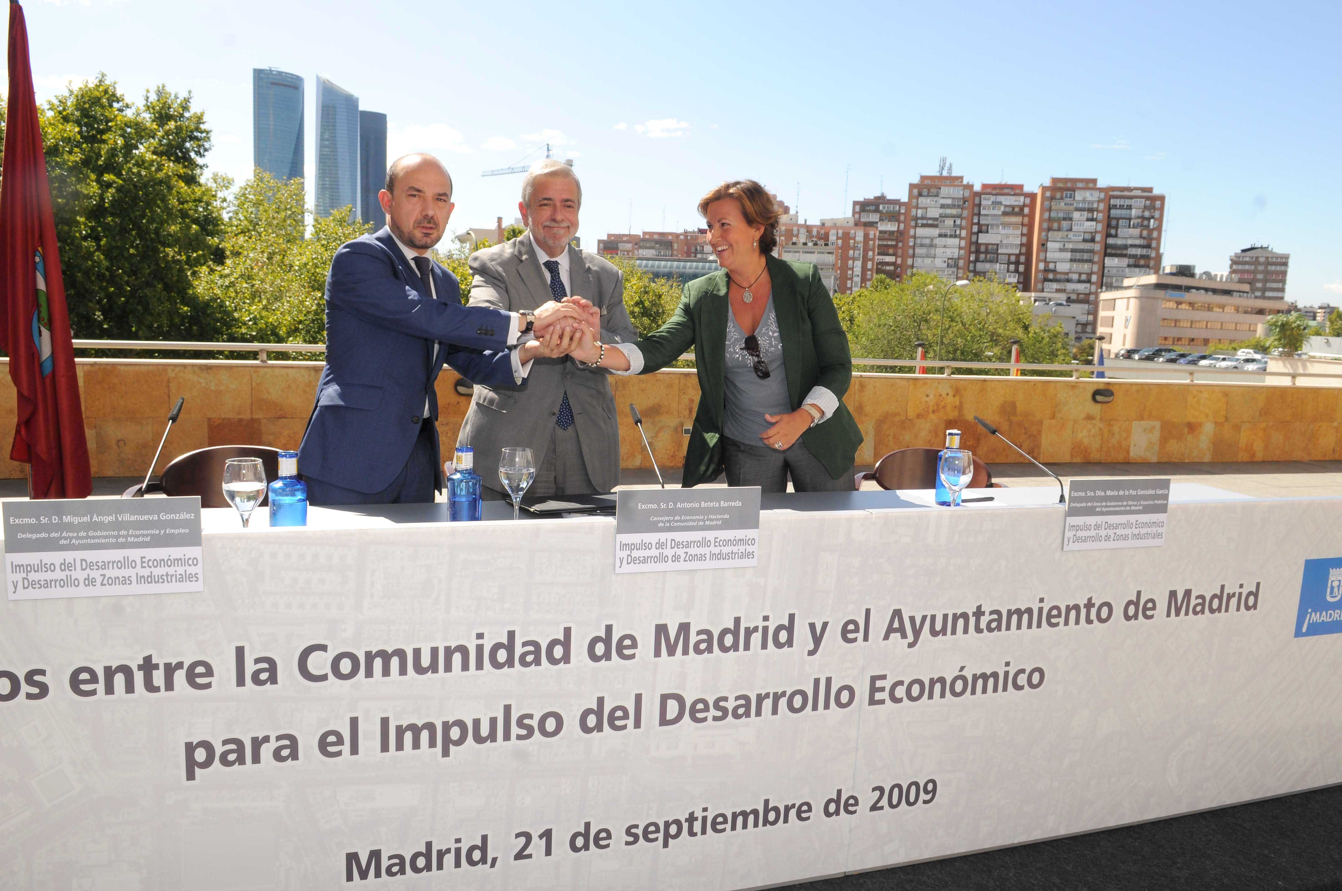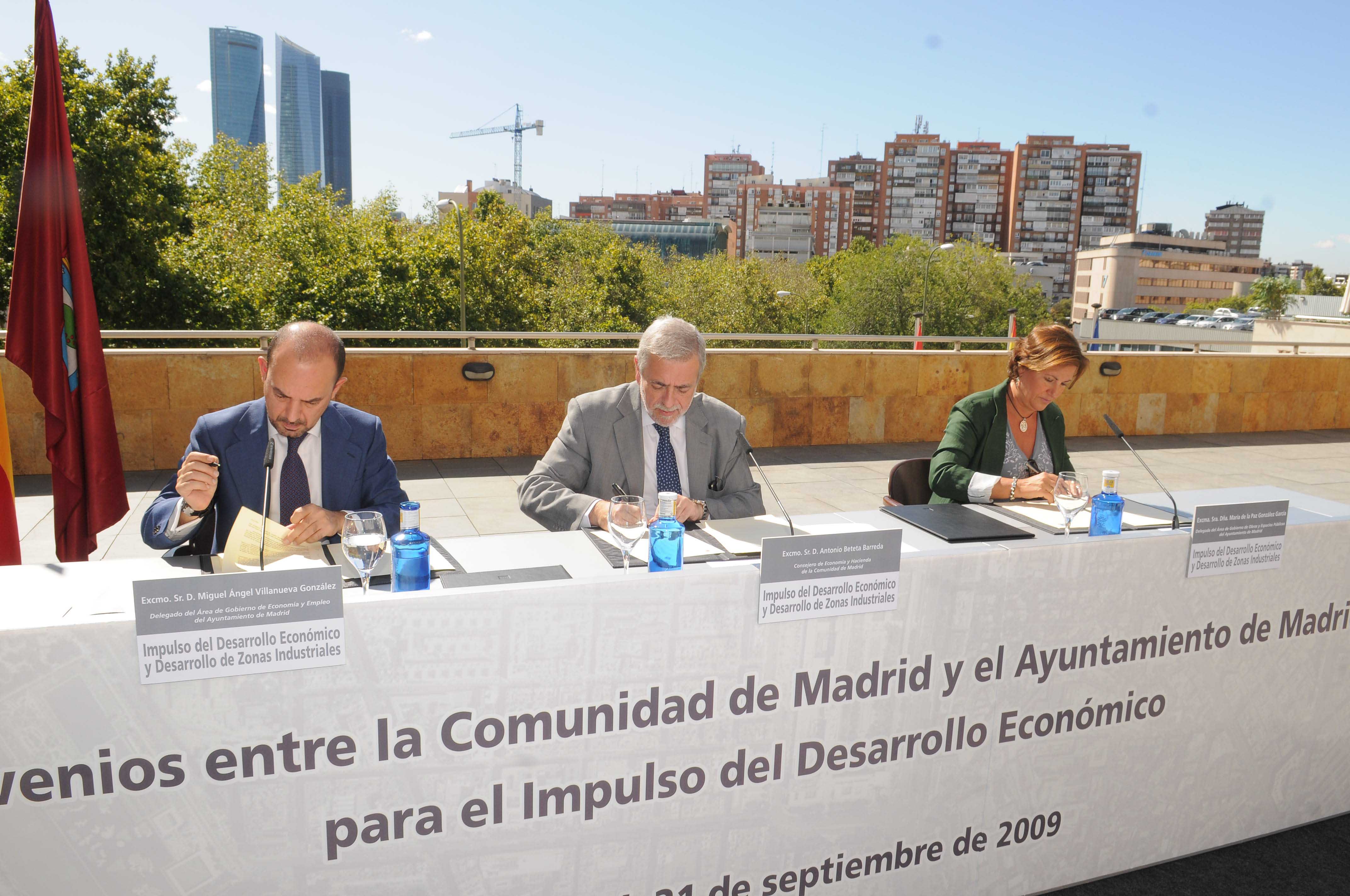 El Ayuntamiento y la Comunidad de Madrid han suscrito dos convenios para el desarrollo de la economía y la industria. Se trata de iniciativas dirigidas a fortalecer la competitividad del tejido productivo madrileño, crear y mejorar las infraestructuras empresariales entre las que se encuentran la instalación de un parque tecnológico en Villaverde y el fortalecimiento de los sectores de automoción, biotecnología y audiovisual. La rúbrica ha corrido a cargo del delegado de Economía y Empleo, Miguel Ángel Villanueva, y del consejero de Economía y Hacienda, Antonio Beteta, en un acto al que ha asistido también la delegada de Obras y Espacios Públicos, Paz González.
