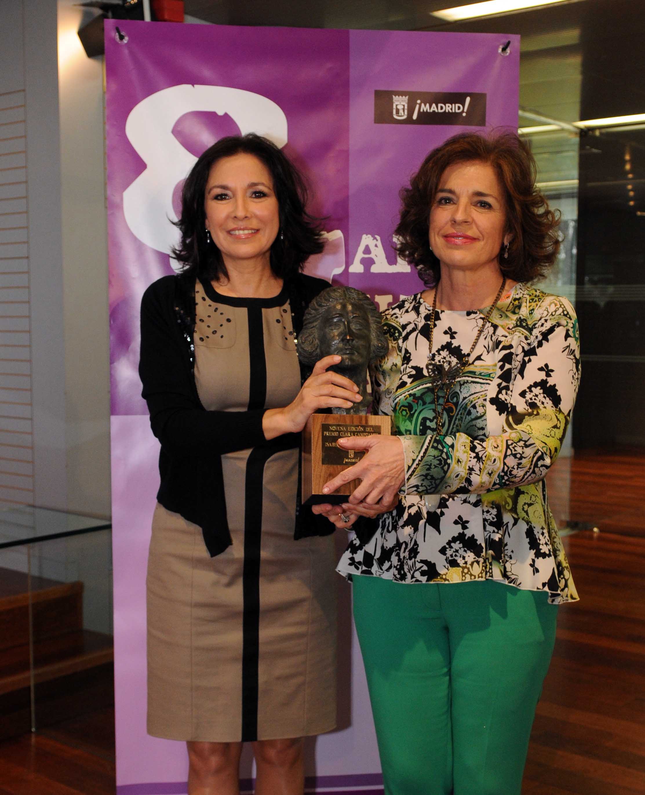 El premio entregado a Isabel Gemio es fruto de una propuesta de la hoy alcaldesa cuando era, en 2006, segunda teniente de alcalde y concejal de Empleo y Servicios a la Ciudadanía. "No encontré mejor nombre para darle que el de Clara Campoamor", recordó Ana Botella, al tiempo que hacía una breve semblanza de esa madrileña de Chamberí que cambió la historia española al conseguir, hace más de ochenta años, el derecho al voto femenino. "Luchó ante los prejuicios de izquierda y derecha, para defender contra viento y marea que, sin contar con la mitad de la población, ni hay democracia, ni hay futuro. No eran arengas de una feminista de salón; sino la batalla de una mujer esforzada que lo tenía todo en contra y que logró, con mucho sacrificio y valor, un lugar privilegiado en nuestra historia. Gracias a ella España entró en la modernidad".