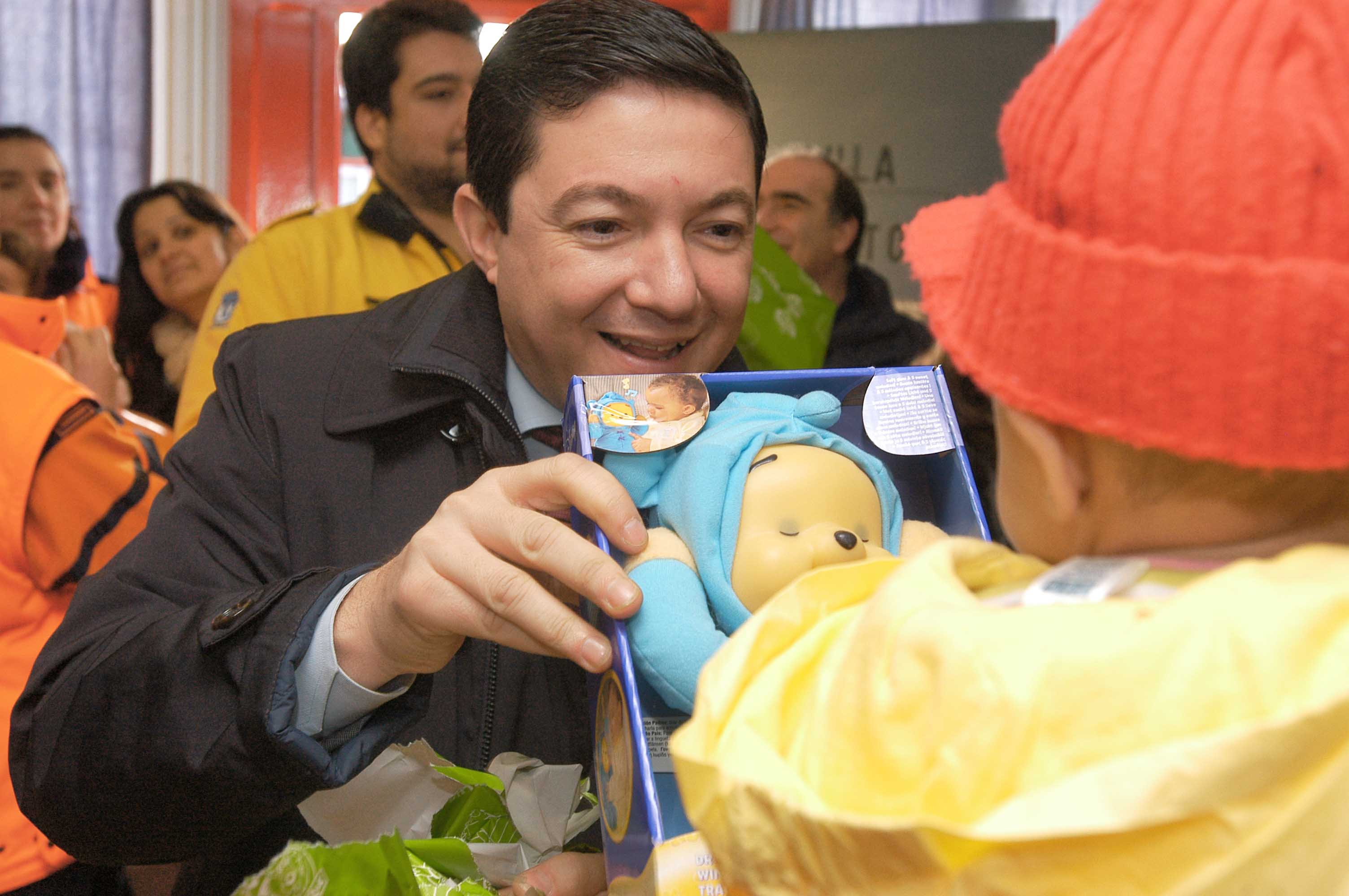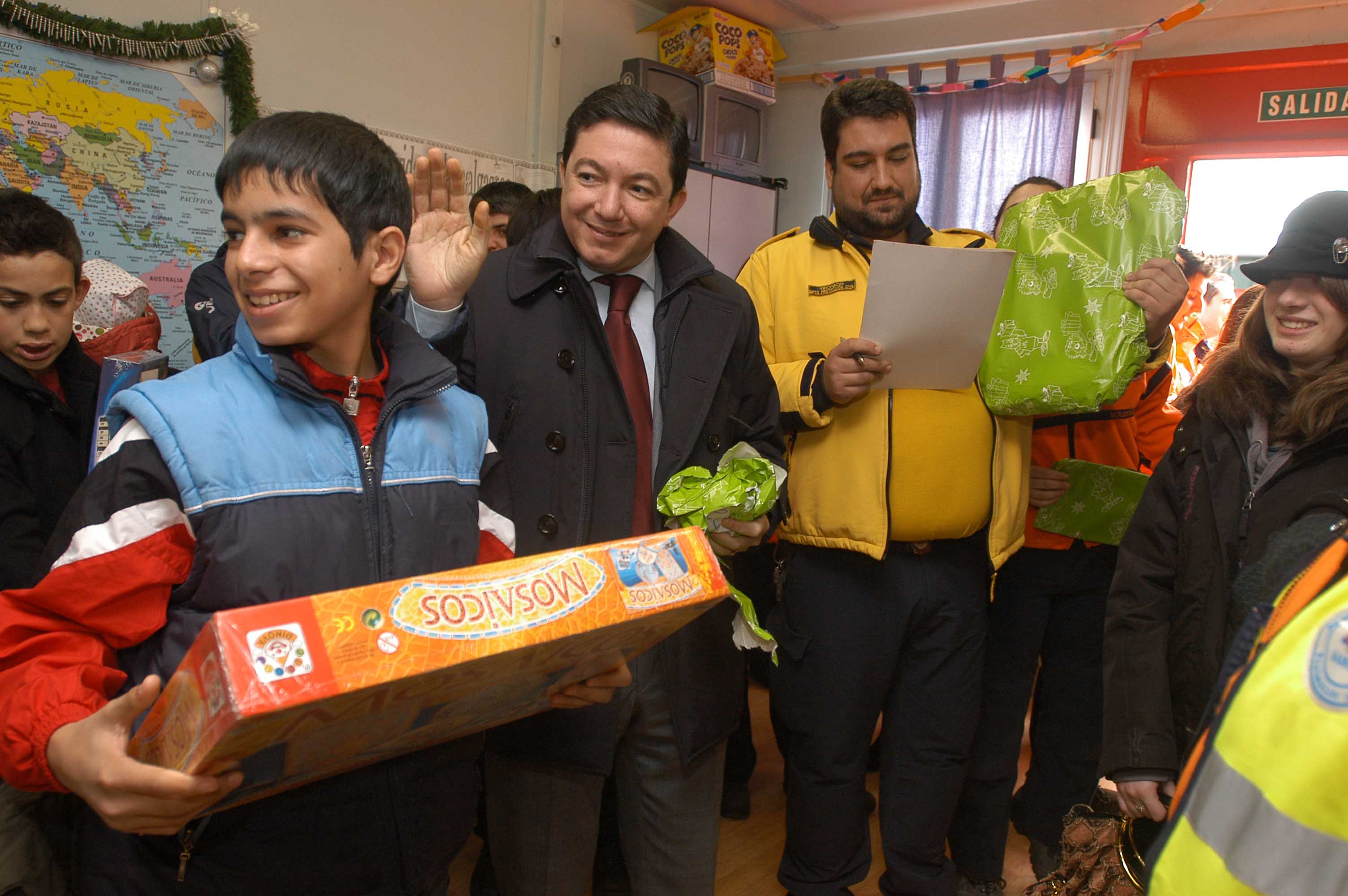 El delegado de Seguridad y Movilidad, Pedro Calvo, entregó esta mañana -en nombre de los Reyes Magos- juguetes (donados por los hipermercados Alcampo)a los niños acogidos en los centros municipales de San Roque y Valdelatas. En el lugar de los pajes de los Reyes, actuaron varios voluntarios de Samur Social y como caravanas utilizaron los populares coches amarillos de Samur. En las imágenes, Calvo y sus pajes reparten los juguetes.
