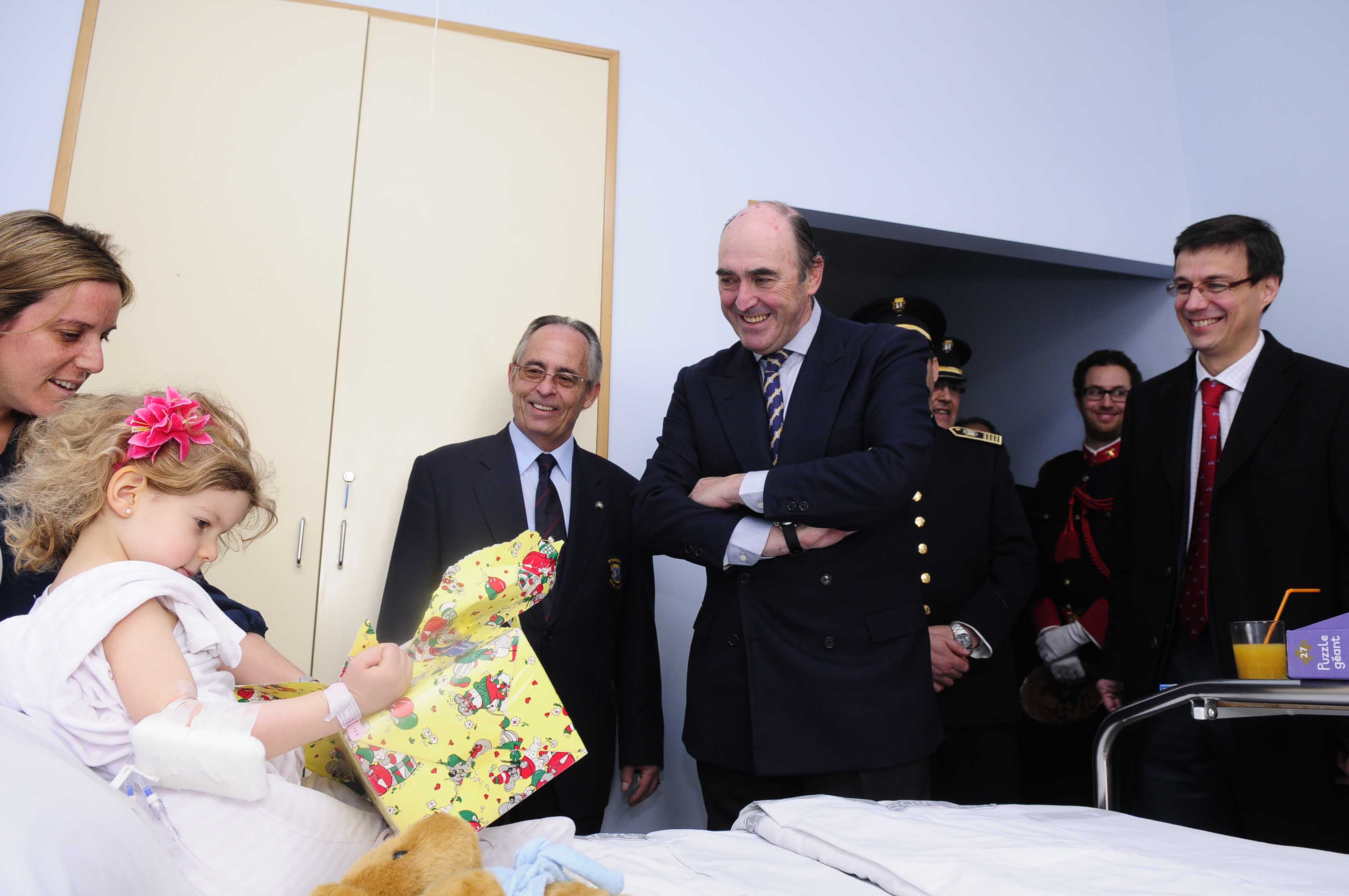 Antonio de Guindos durante la entrega de juguetes y exhibición que los bomberos han realizado en el hospital de San Rafael