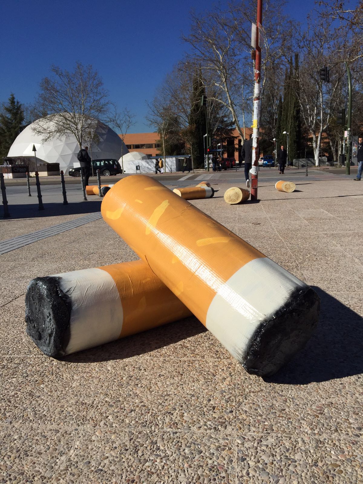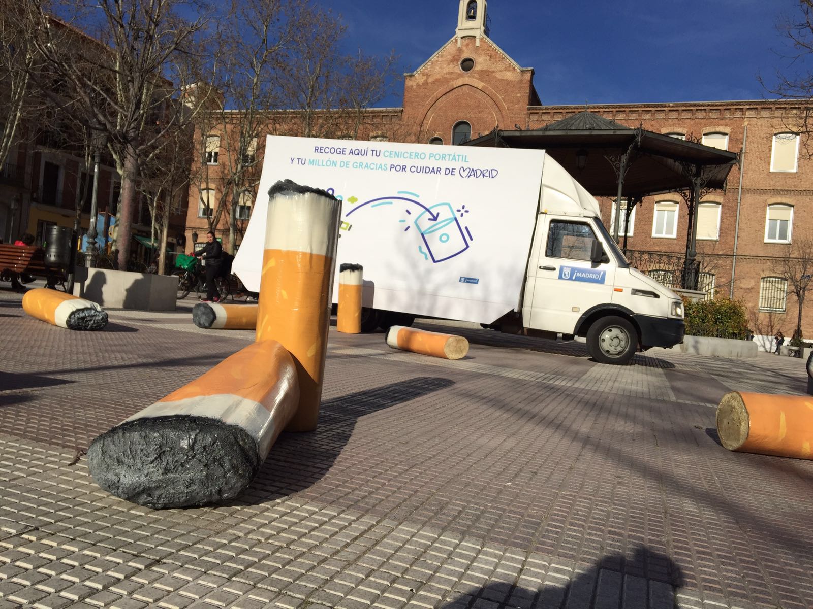 Tras ofrecer la información, los voluntarios entregan un cenicero portátil reutilizable. Para llamar la atención de los transeúntes, junto a un camión rotulado con mensajes de la campaña, se “esparcen” una decena de “colillas gigantes” de goma espuma y que miden de más de un metro de altura.