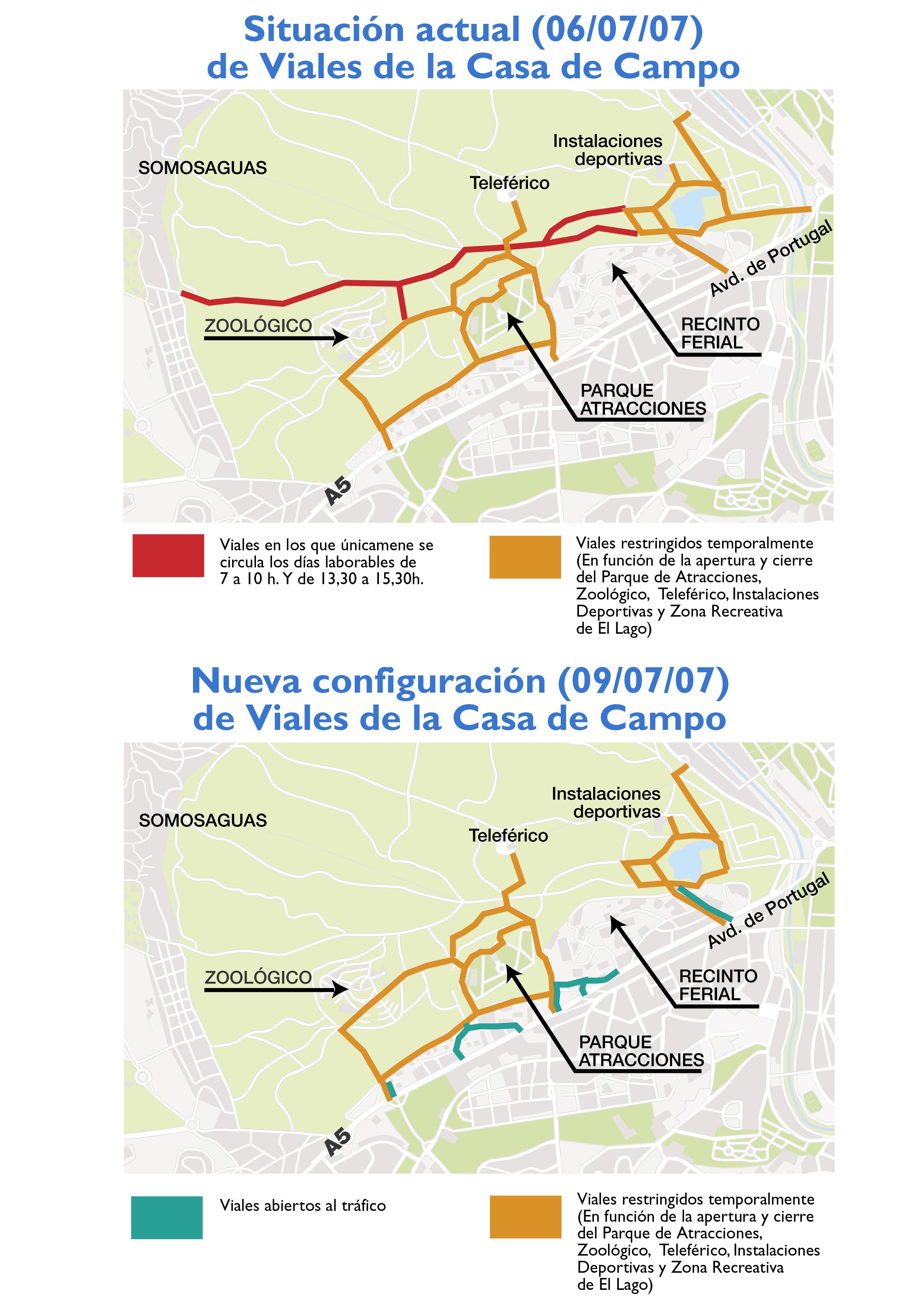 - Sólo podrán circular los vehículos que acudan a sus instalaciones: Zoo, Parque de Atracciones, Recintos Feriales, el Lago o las estaciones del Teleférico