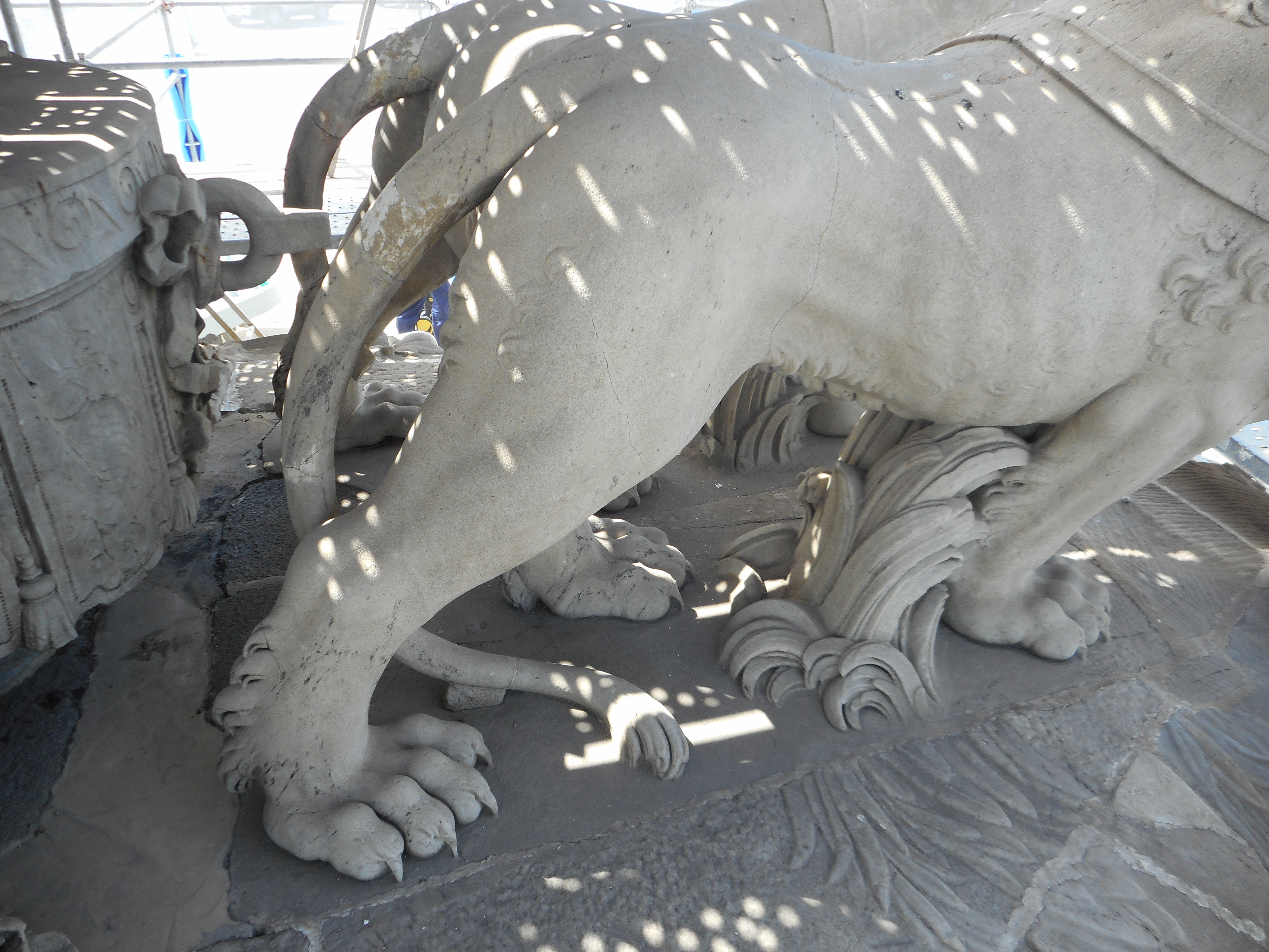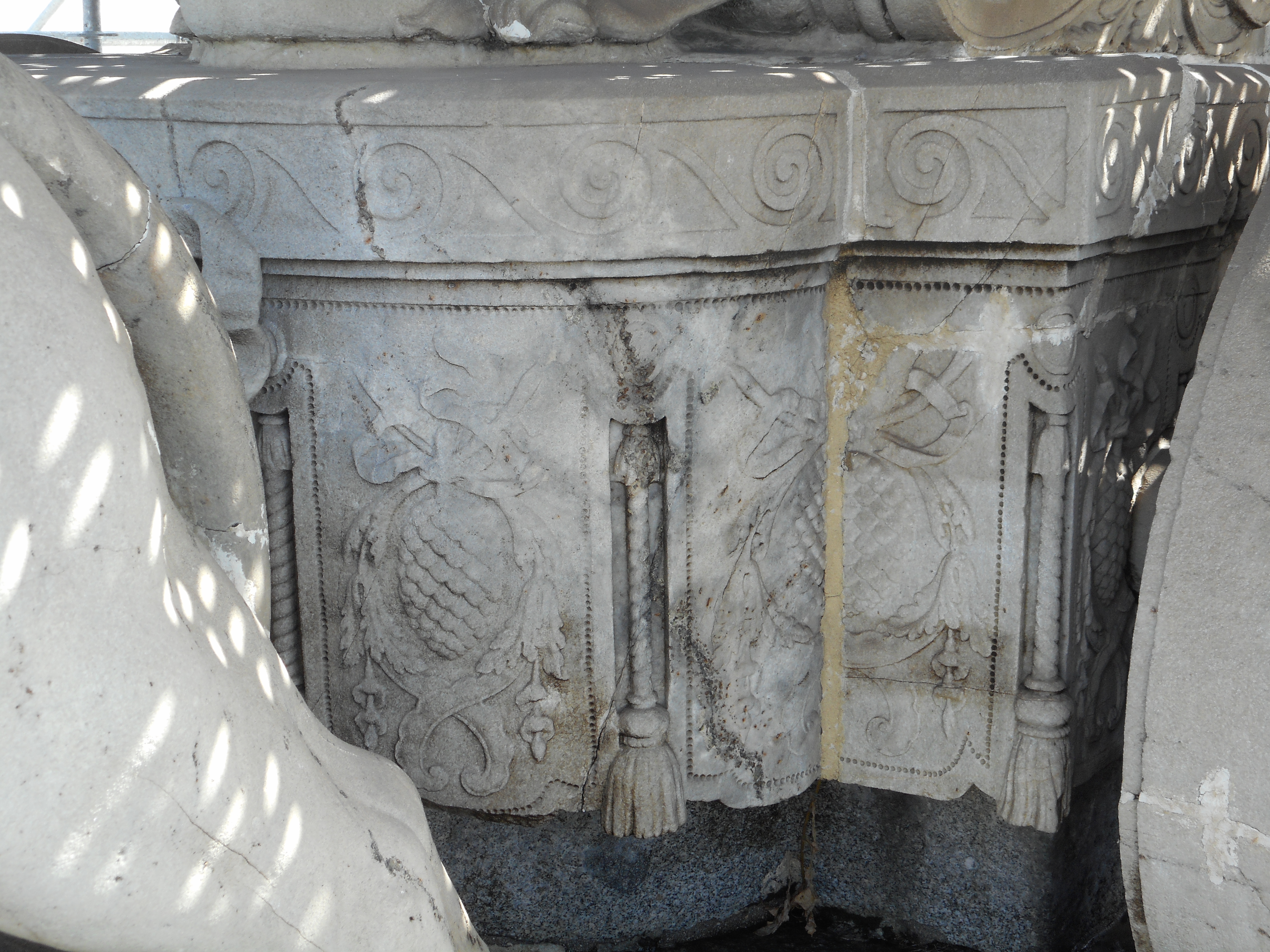 Se realizó también un estudio exhaustivo de todos los elementos del grupo escultórico, eliminando morteros agrietados y asegurando los elementos que estaban inestables. Tanto el rejuntado y sellado de grietas como las pequeñas reintegraciones y la entonación general se han ejecutado con mortero de cal hidráulica natural pigmentada en masa.
