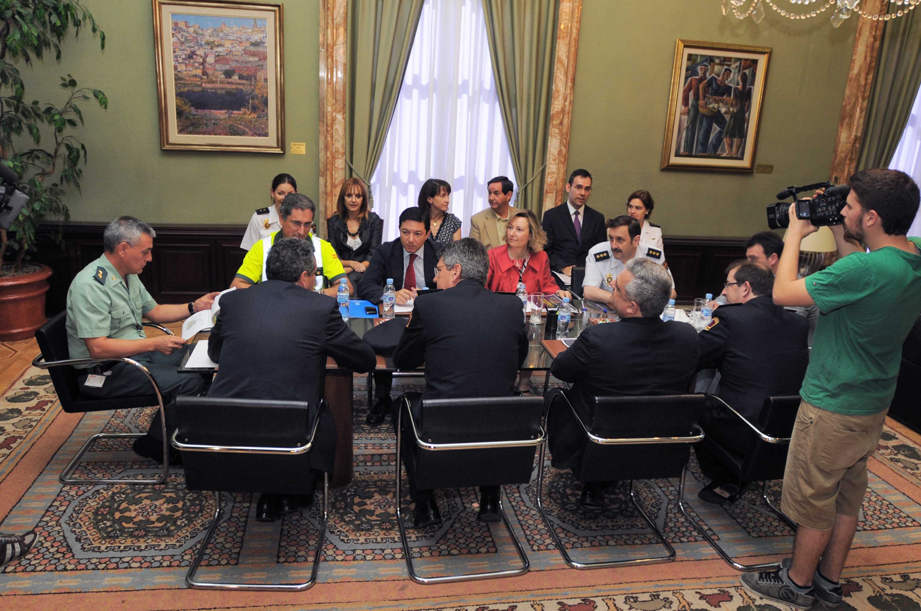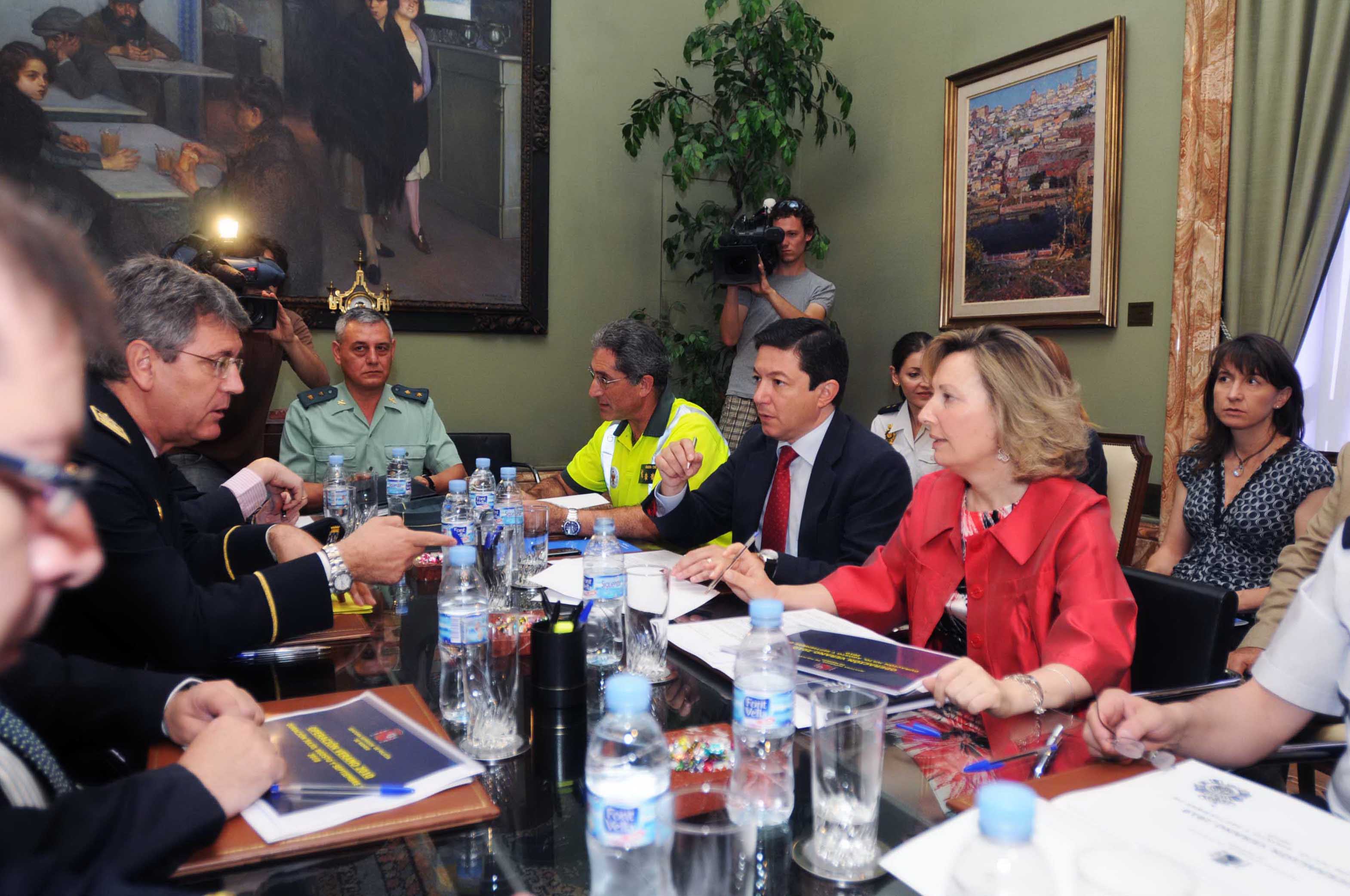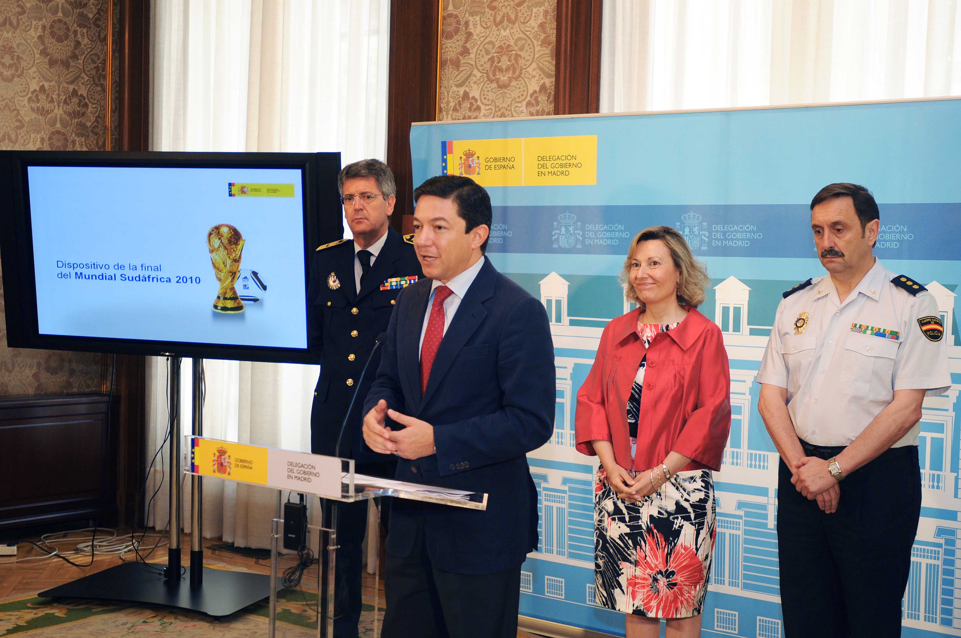 El delegado de Seguridad y Movilidad, Pedro Calvo, ha presentado en rueda de prensa el dispositivo del Ayuntamiento para la celebración el domingo de la Final del Mundial de Fútbol y para el recibimiento que Madrid brindará a la Selección. Está previsto que un autobús descubierto lleve a los jugadores por las calles más céntricas de la ciudad. En las imágenes, varios momentos tanto de la rueda de prensa como de la reunión que mantuvieron Calvo, la delegada del Gobierno, Amparo Valcarce, y otras autoridades de las Fuerzas de Seguridad del Estado.