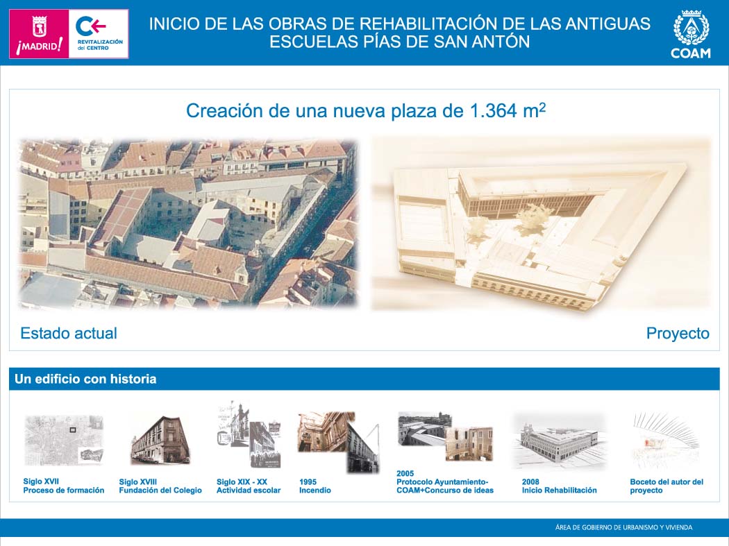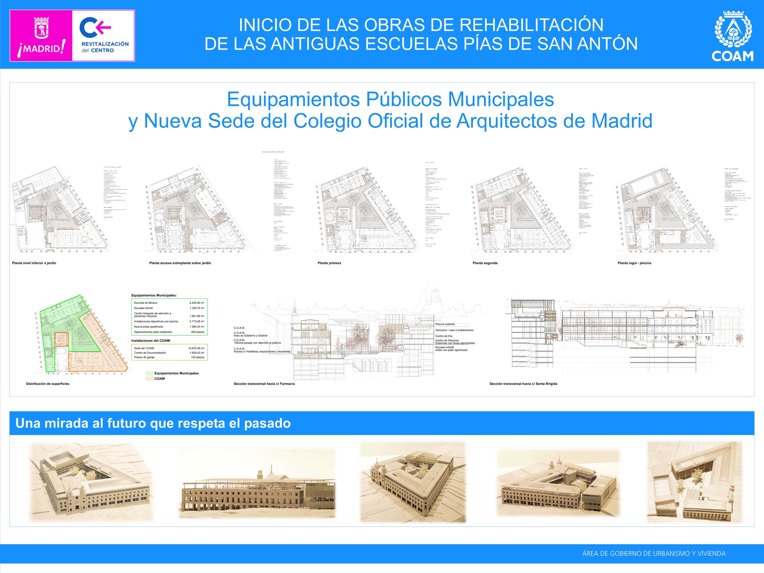 La reforma de las Escuelas Pías de San Antón permitirá reintegrar a la ciudad una de sus construcciones más singulares, convertida -más de 200 años después de su construcción- en moderna sede del COAM y en nuevos espacios de encuentro. Nuevos usos, anunció el alcalde, que harán de este edificio uno de los principales referentes de la actividad cultural, social y deportiva del centro de Madrid.