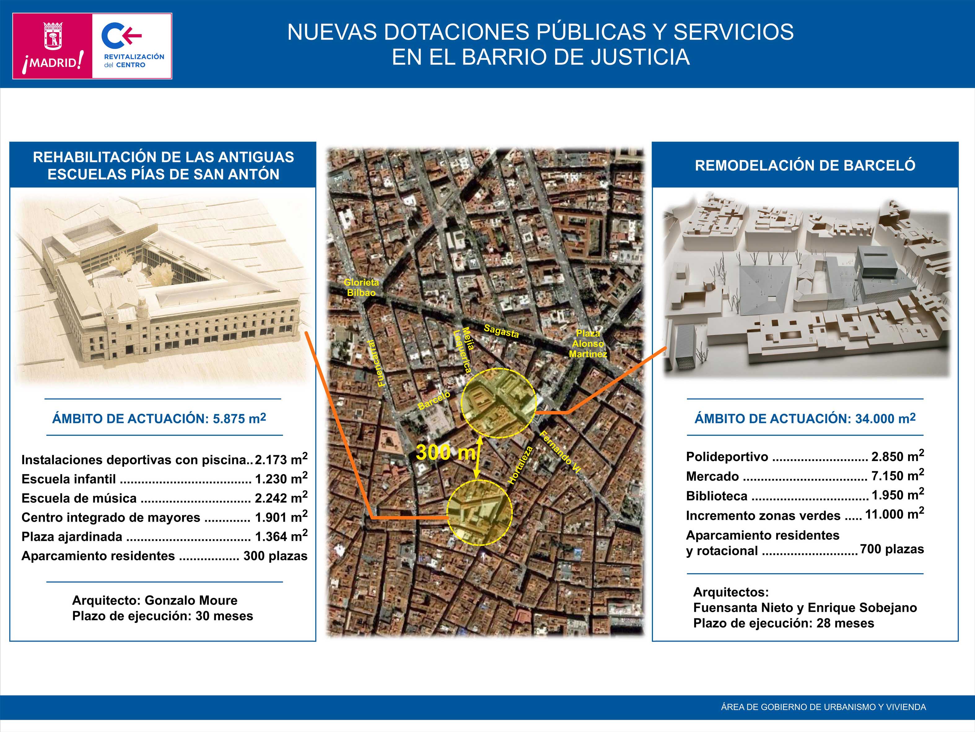 Todos estos nuevos equipamientos municipales se suman a los que también se van a crear dentro de este mismo barrio de Justicia, en el ámbito de Barceló. Porque a 300 metros de estas Escuelas el Ayuntamiento de Madrid está impulsando otro proyecto que permitirá incrementar las zonas ajardinadas en 11.000 m2, construir un polideportivo, una biblioteca y un moderno mercado, así como crear 700 nuevas plazas de aparcamiento.