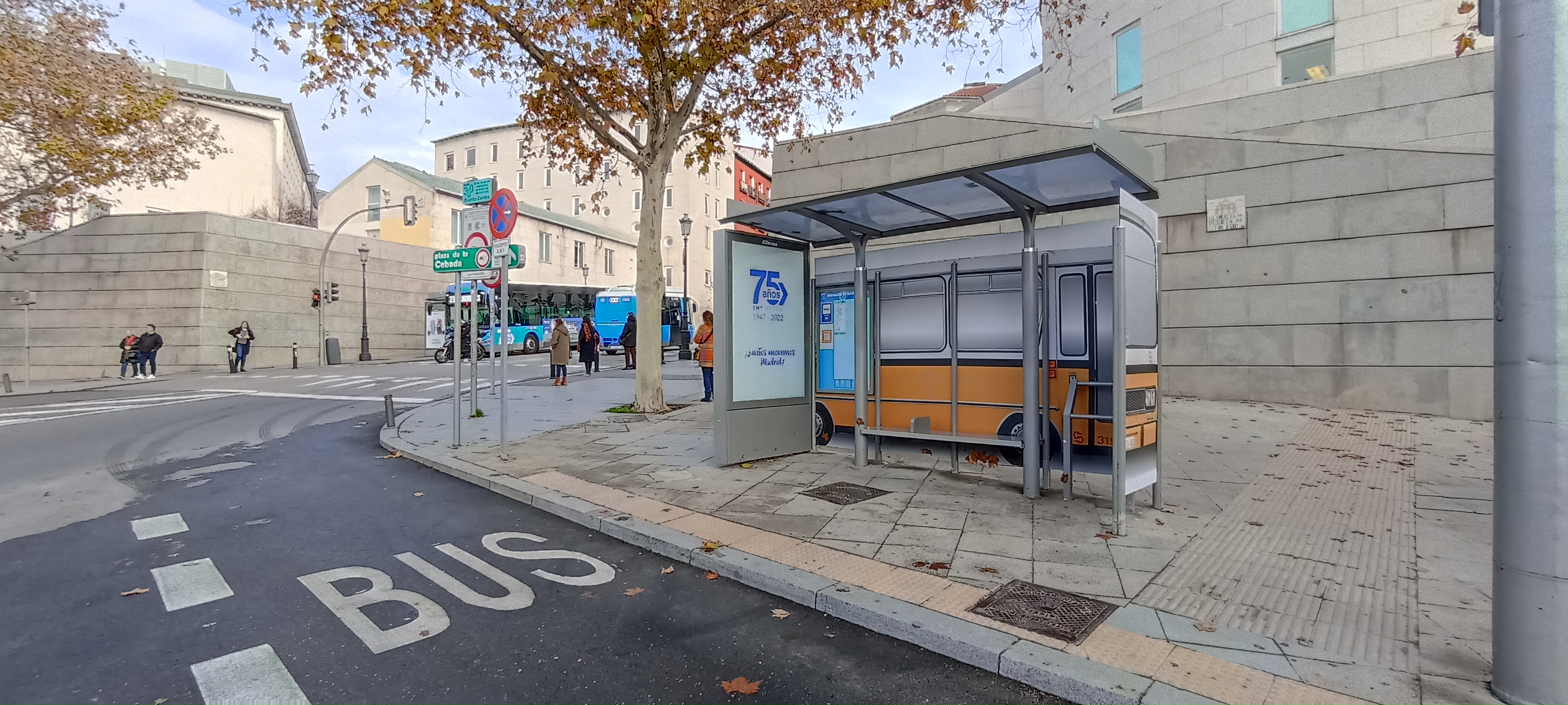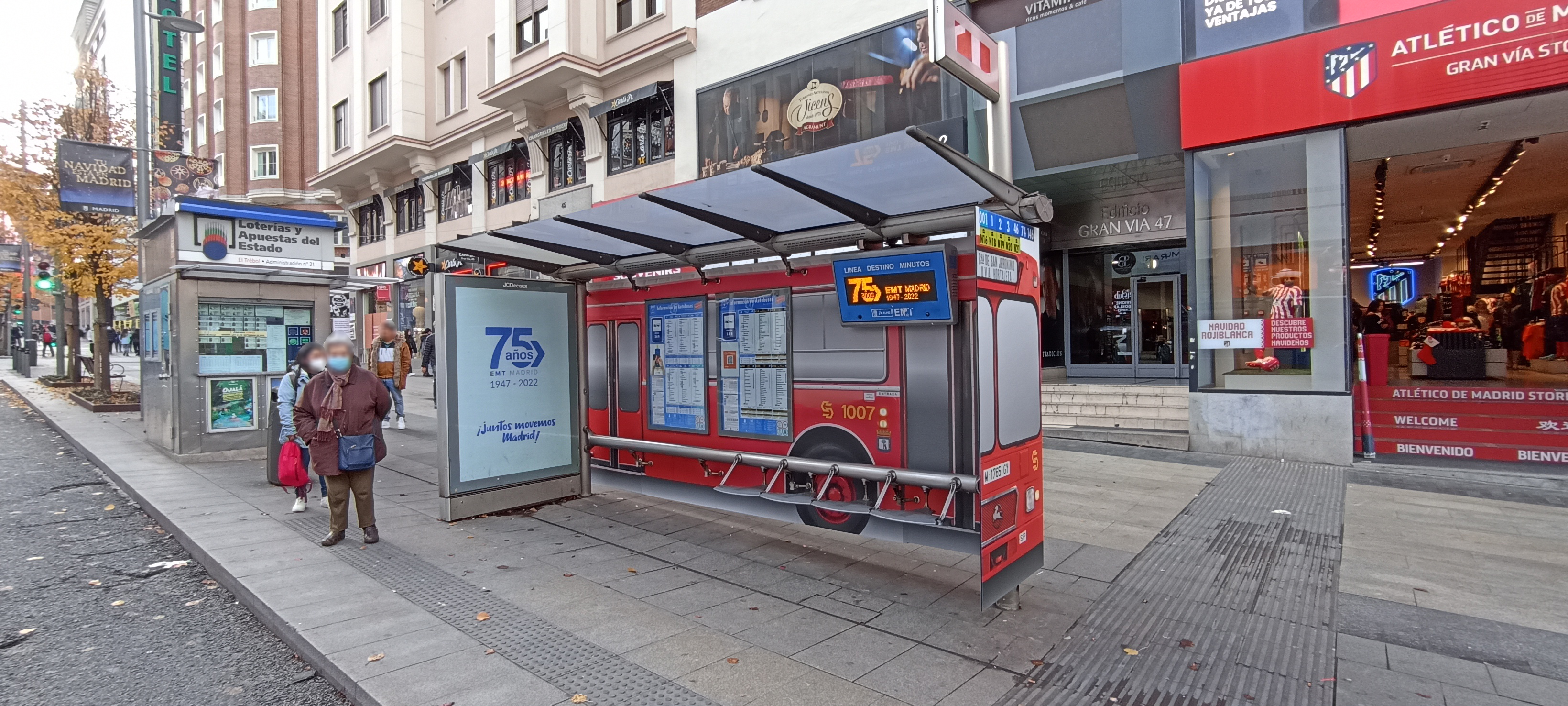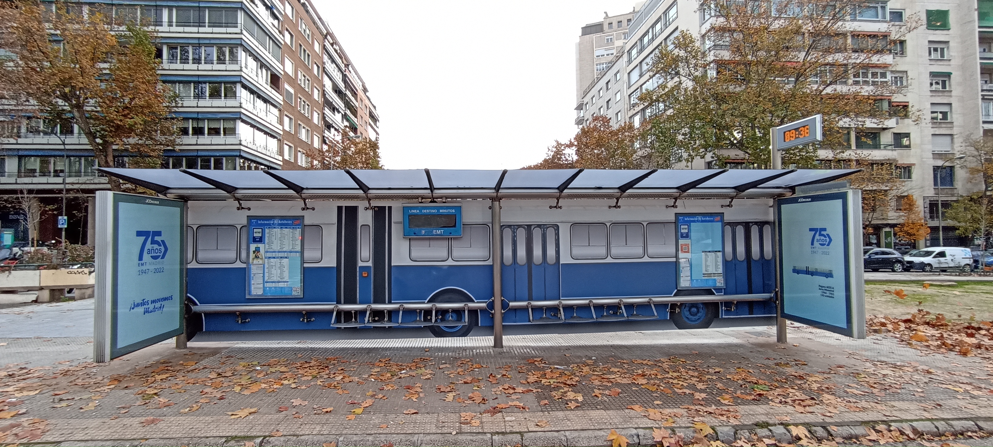 La Empresa Municipal de Transportes de Madrid (EMT), dentro de las numerosas acciones conmemorativas organizadas este año por su 75 Aniversario, ha transformado cinco marquesinas de Madrid en autobuses históricos y legendarios de los que un día recorrieran las calles de la capital, quedando para siempre en el recuerdo de los viajeros. Los cinco nodos de parada han sido especialmente elegidos por ser emplazamientos muy céntricos y con mucha afluencia de público.