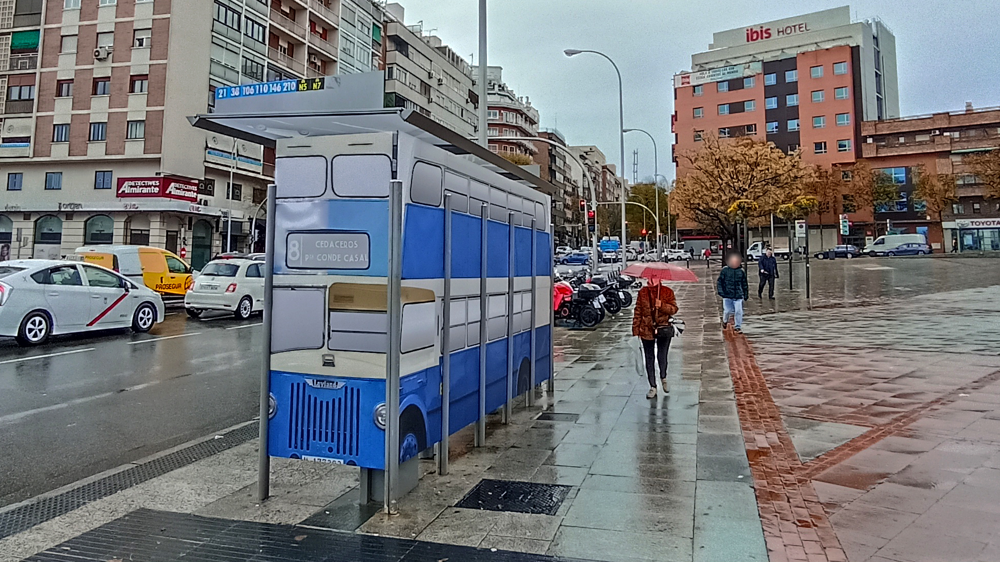 Desde esta semana y durante todo el período navideño, los madrileños podrán contemplar cinco marquesinas convertidas, cada una de ellas, en un autobús histórico en formato integral. Estos son los nodos de parada y el autobús legendario correspondiente que está vinilado sobre las marquesinas: