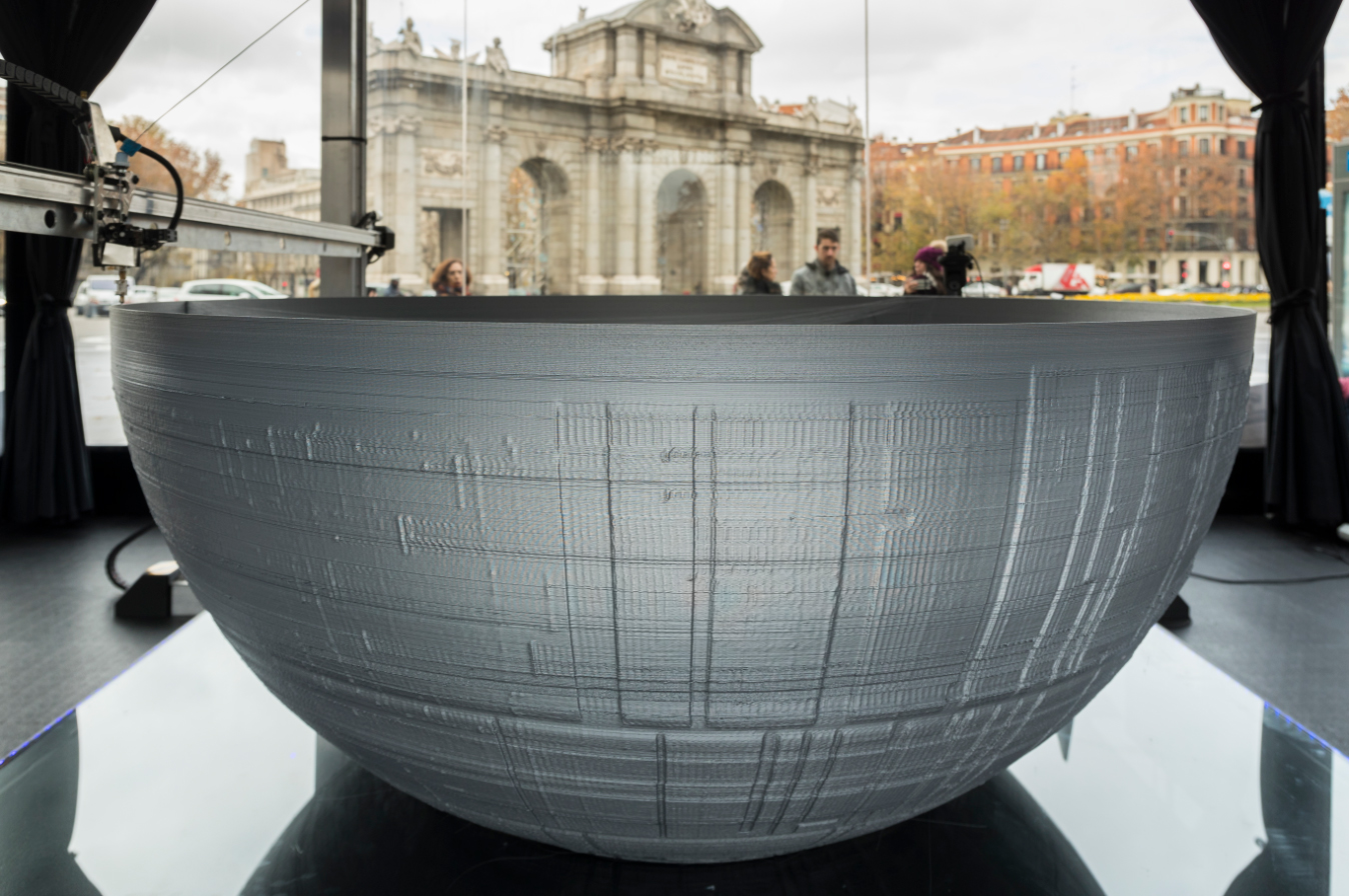 La impresión en 3D de la Estrella de la Muerte, frente a la Puerta de Alcalá, en la plaza de la Independencia, ha alcanzado ya el 50% del proceso y se ha prorrogado hasta el 23 de diciembre. El lado oscuro empezó a imprimirse en Madrid el pasado domingo día 11, donde la mayor impresora 3D del mundo fabrica la Estrella de la Muerte, la estación espacial que aparecía en la primera entrega de “Star Wars” (1977). Esta impresora se ha construido especialmente para este proyecto en Estados Unidos y posteriormente se ha trasladado a Madrid. La iniciativa es fruto de la colaboración entre el Ayuntamiento de Madrid y The Disney Company Iberia, que tuvo ya su correlato el pasado año con la exposición “Face the force”, que situó en distintas localizaciones de la ciudad ocho réplicas gigantes de los cascos que lucieron los protagonistas de una de las más famosas sagas cinematográficas de la historia.