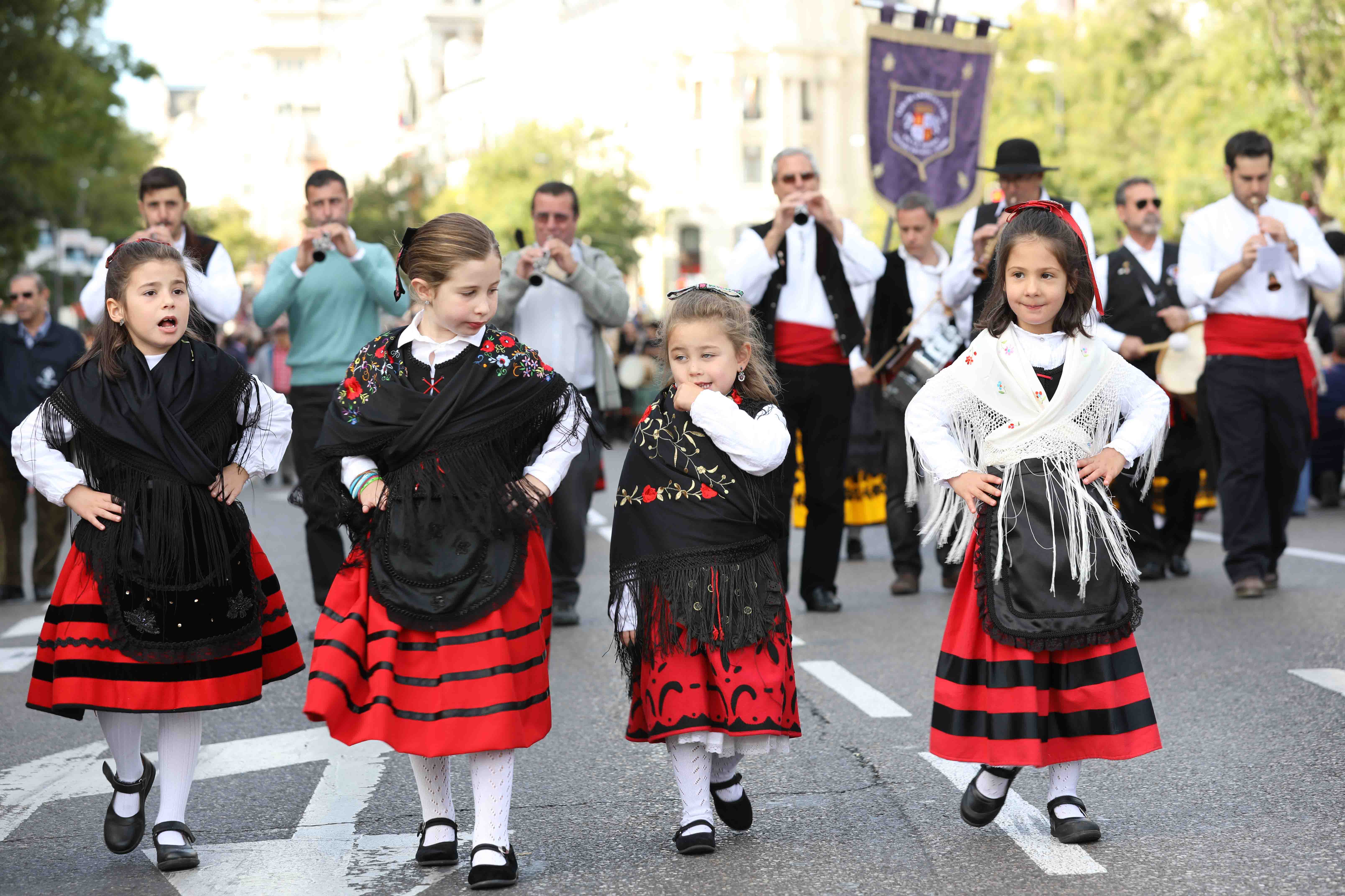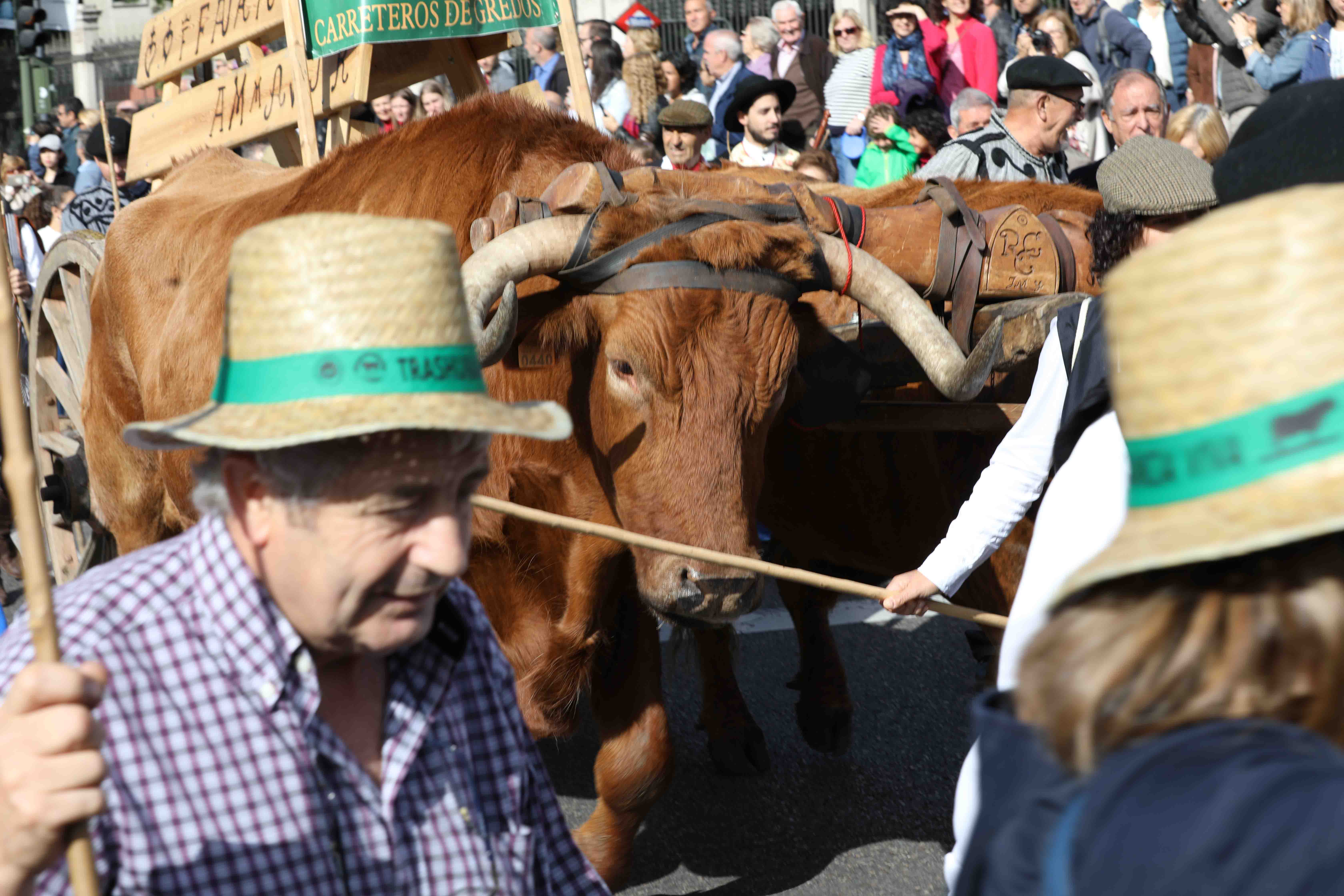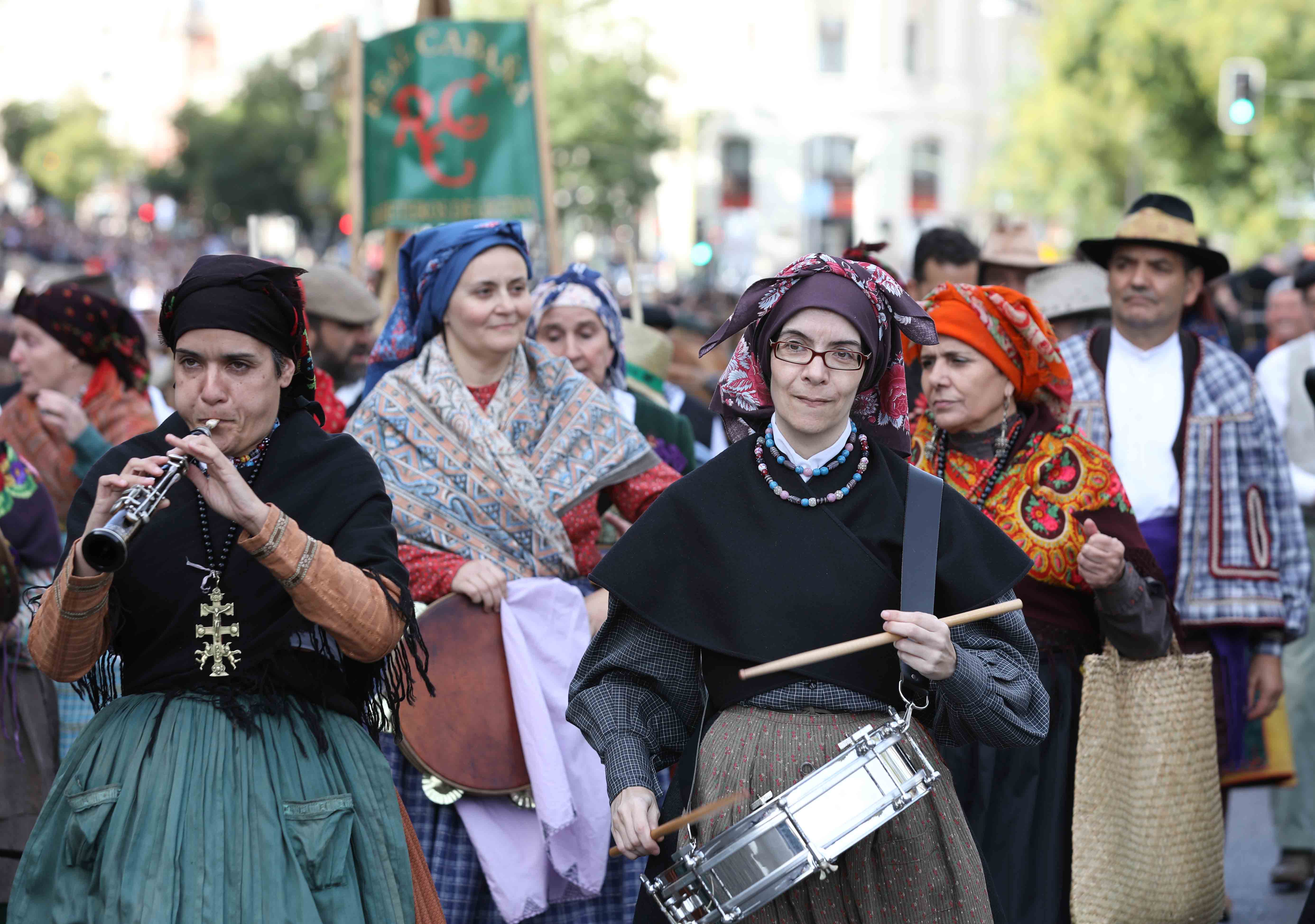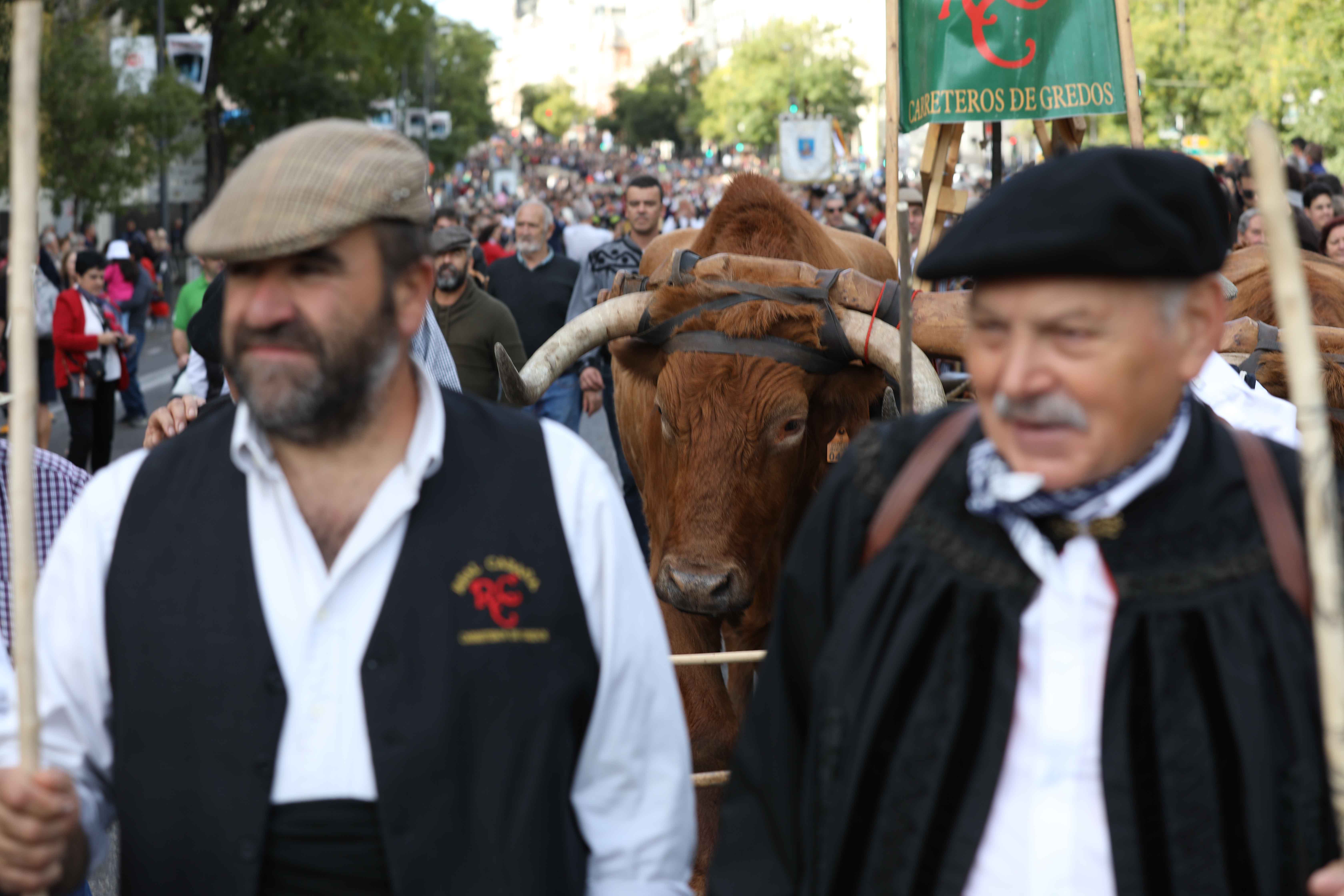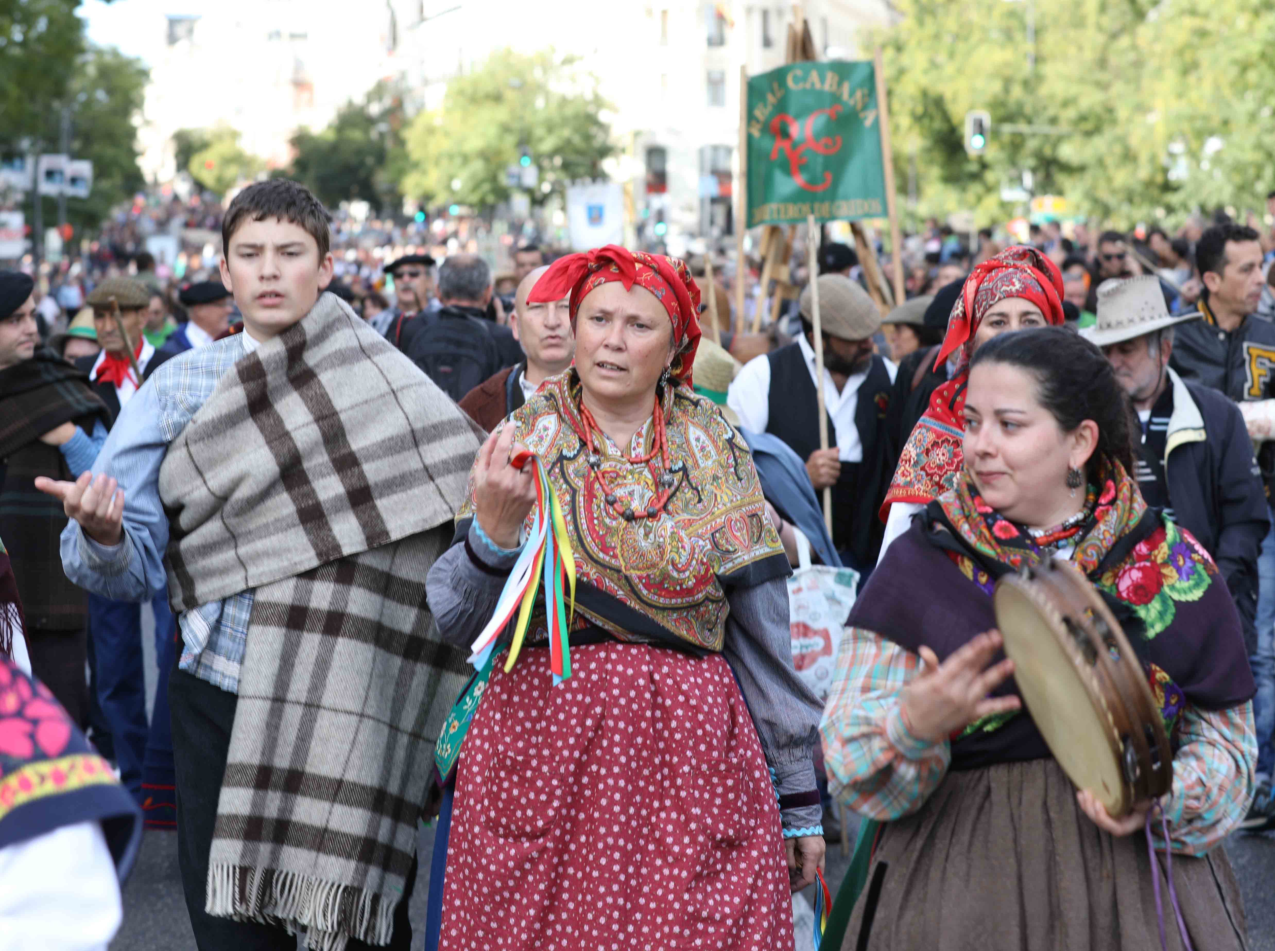 Los pendones concejiles son la referencia fundamental para mantener las distancias entre los distintos grupos. Les siguen los arrieros encargados de garantizar con sus recuas de mulas el tráfico de mercancías desde los puertos gallegos hasta Madrid. Les acompaña la Cabaña Real de Carreteros, fundada por los Reyes Católicos y representada por las carretas de bueyes seranos y de vacas avileñas. Distintos grupos populares acompañarán el paso de los rebaños al son de la música tradicional de las distintas comarcas./