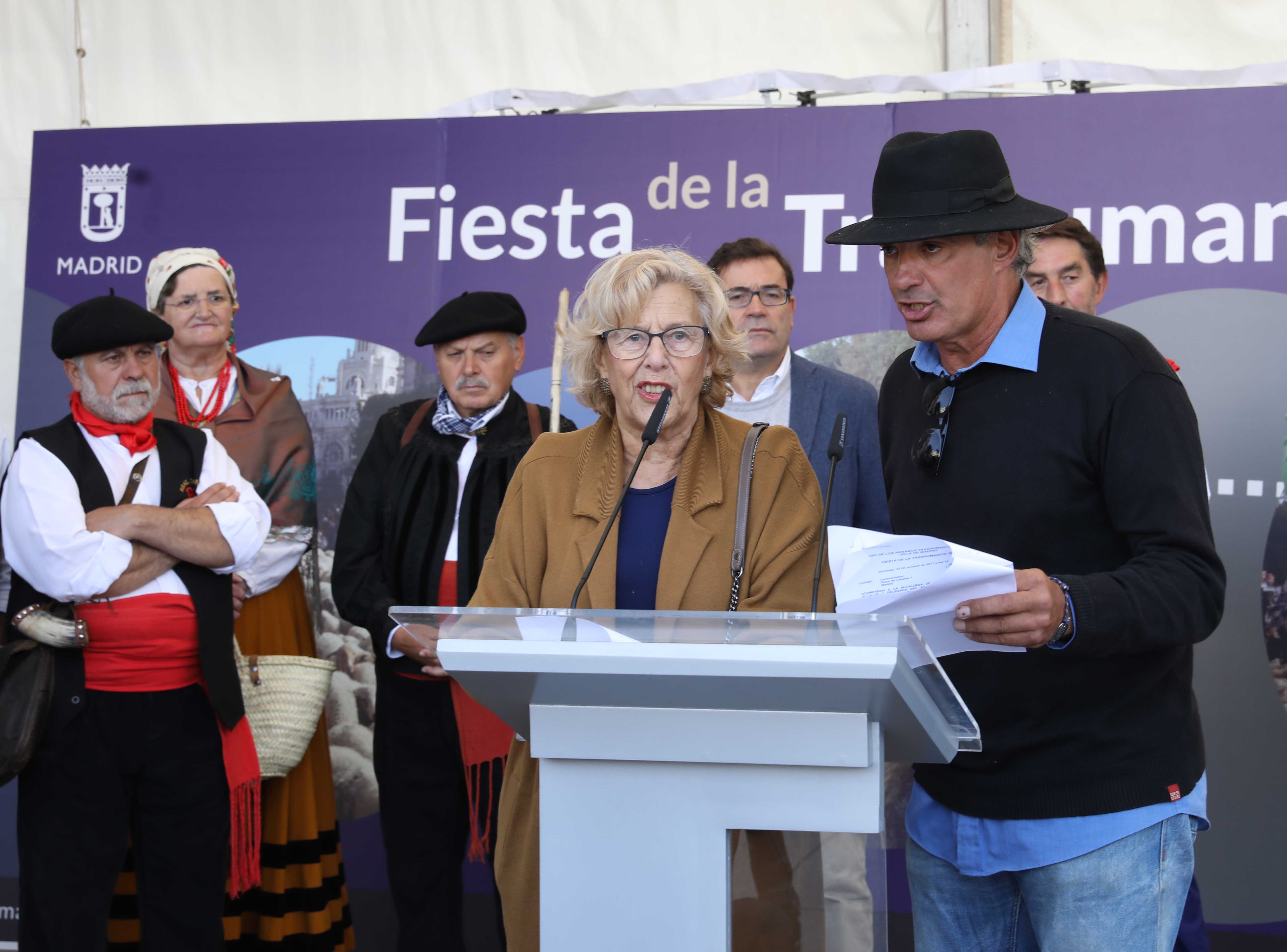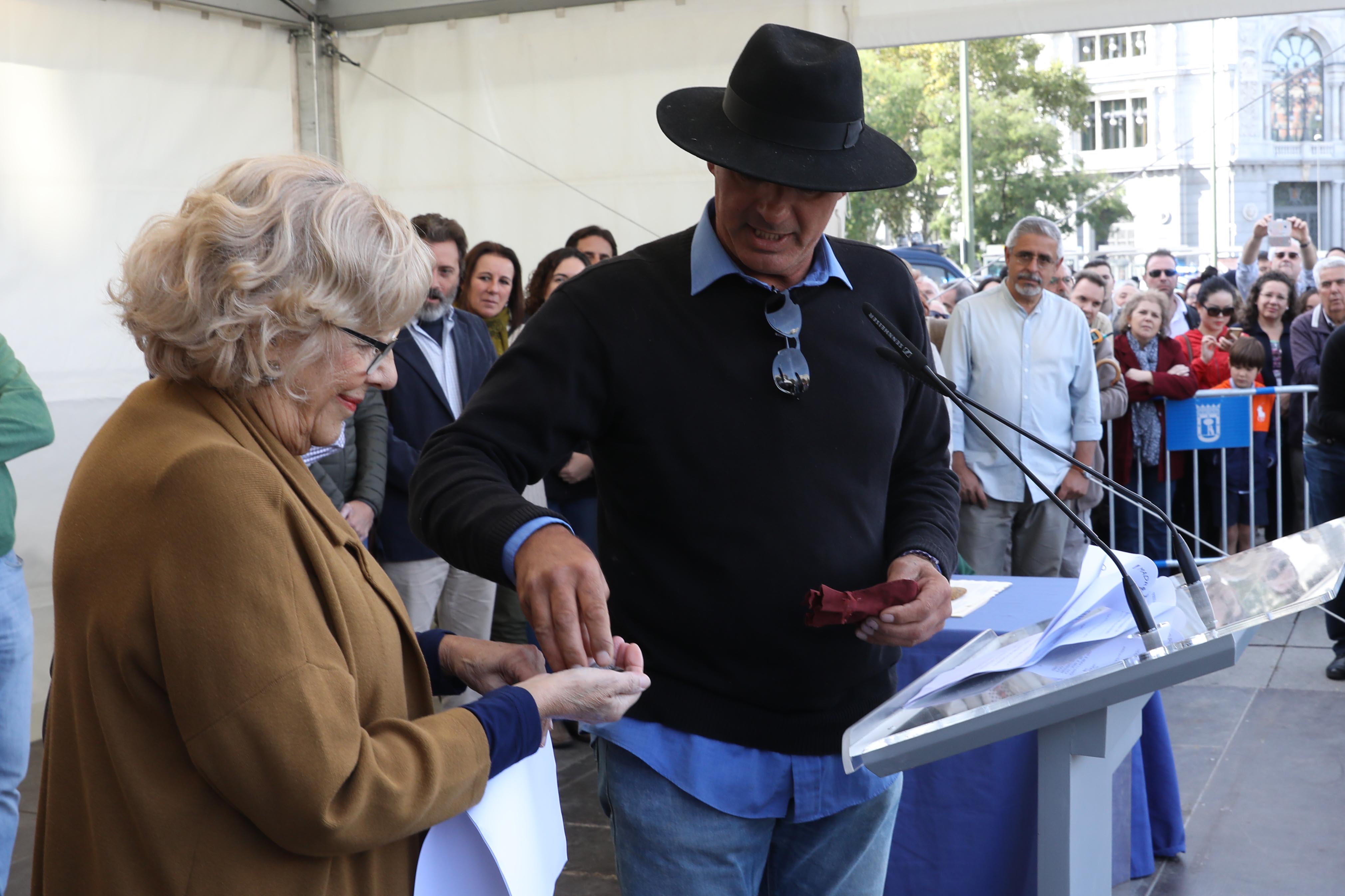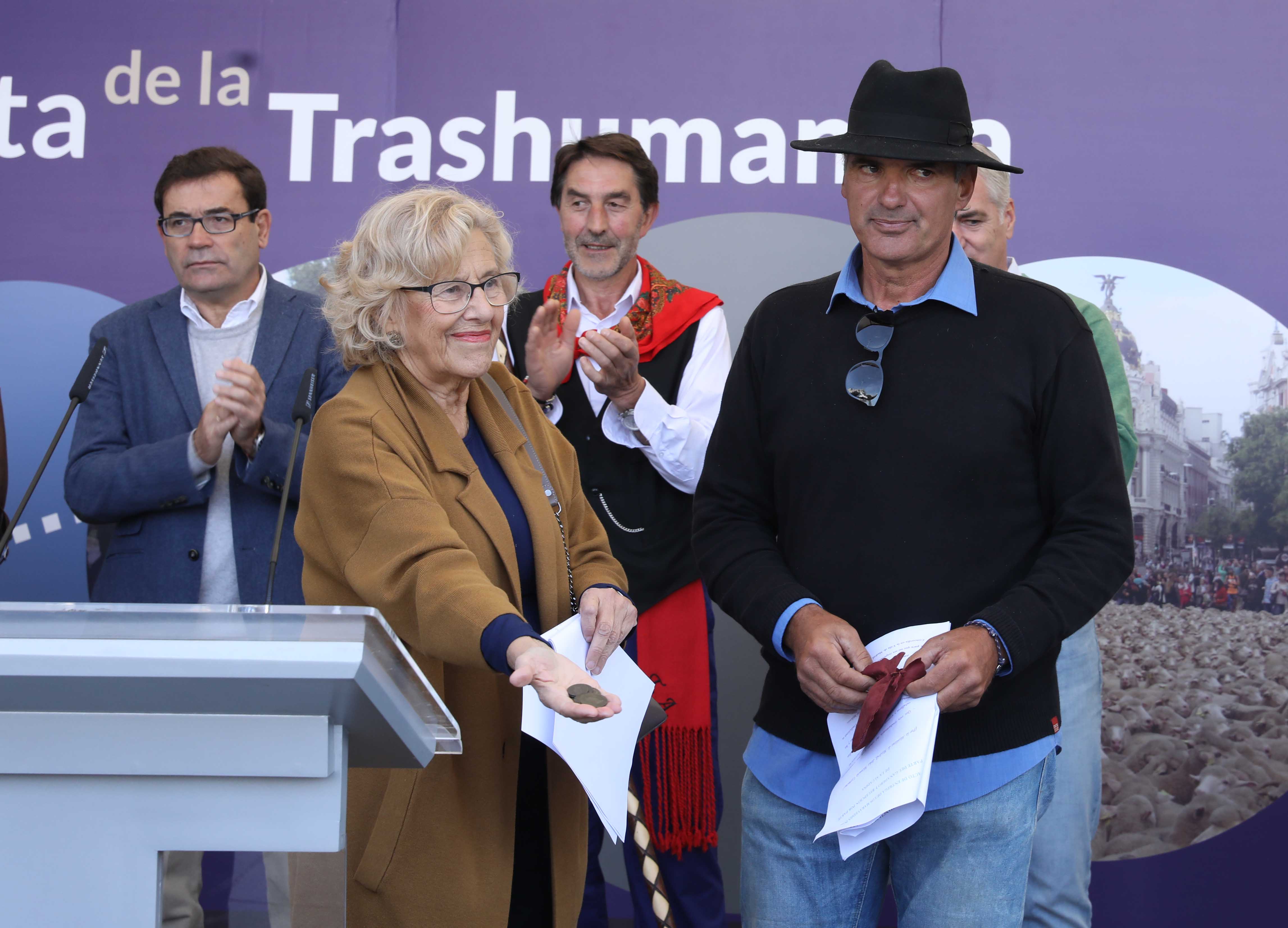 La alcaldesa, Manuela Carmena, ha dado la bienvenida a los pastores, acompañados por los mayorales, rabadanes y ganaderos, y ha recibido el pago de los “50 maravedís al millar” estipulados por la Concordia de 1418 entre los Hombres Buenos de la Mesta y los Procuradores del Concejo de la Villa. La rúbrica un año más de esa Concordia. Junto a ellos han estado presentes, entre otros, la primera teniente de alcalde, Marta Higueras; el tercer teniente de alcalde, Mauricio Valiente, y la delegada de Medio Ambiente y Movilidad, Inés Sabanés, además de representantes de la Comunidad de Madrid y del Ministerio de Agricultura, así como de los pastores y ganaderos.